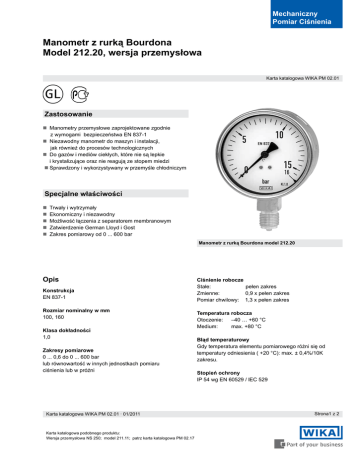 Mechaniczny Pomiar Ciśnienia Manometr z rurką Bourdona Model 212.20, wersja przemysłowa Karta katalogowa WIKA PM 02.01 Zastosowanie Manometry przemysłowe zaprojektowane zgodnie z wymogami bezpieczeństwa EN 837-1 Niezawodny manometr do maszyn i instalacji, jak również do procesów technologicznych Do gazów i mediów ciekłych, które nie są lepkie i krystalizujące oraz nie reagują ze stopem miedzi Sprawdzony i wykorzystywany w przemyśle chłodniczym Specjalne właściwości Trwały i wytrzymały Ekonomiczny i niezawodny Możliwość łączenia z separatorem membranowym Zatwierdzenie German Lloyd i Gost Zakres pomiarowy od 0 ... 600 bar Manometr z rurką Bourdona model 212.20 Opis Konstrukcja EN 837-1 Rozmiar nominalny w mm 100, 160 Klasa dokładności 1,0 Zakresy pomiarowe 0 ... 0,6 do 0 ... 600 bar lub równowartość w innych jednostkach pomiaru ciśnienia lub w próżni Karta katalogowa WIKA PM 02.01 · 01/2011 Karta katalogowa podobnego produktu: Wersja przemysłowa NS 250; model 211.11; patrz karta katalogowa PM 02.17 Ciśnienie robocze Stałe: pełen zakres Zmienne: 0,9 x pełen zakres Pomiar chwilowy: 1,3 x pełen zakres Temperatura robocza Otoczenie: –40 … +60 °C Medium: max. +80 °C Błąd temperaturowy Gdy temperatura elementu pomiarowego różni się od temperatury odniesienia ( +20 °C): max. ± 0,4%/10K zakresu. Stopień ochrony IP 54 wg EN 60529 / lEC 529 Strona1 z 2 Wersja standardowa Opcjonalnie Przyłącze procesowe Stop miedzi Położnie czujnika dolne lub tylne ekscentryczne Gwint zewnętrzny G ½ B, SW 22 Inne przyłącza procesowe NS 100: płynne wypełnienie (model 213.53, karta PM 02.12) NS 160: płynne wypełnienie (model 233.50, karta PM 02.02) Podwyższona temp. medium do 100 °C przy zastosowaniu lutu miękkiego Podwyższona temp. medium do 200 °C (karta kat. PM 02.02) Kołnierz przedni lub tylny, stal CrNi Kołnierz przedni, stal CrNi polerowana Obejma ze stali CrNi polerowanej ze wspornikiem Manometr z urządzeniem kontaktowym, patrz model PGS21.1x0, karta katalogowa PV 22.01 Element pomiarowy < 100 bar: stop miedzi, sprężyna typu C, miękki lut ≥ 100 bar: stal CrNi 316L, sprężyna typu heliakalnego, twardy lut Mechanizm Stop miedzi, część zużywalne z argentanu Wersja standardowa Podzielnia Białe aluminium z czarną skalą 1520857.01 Przyłącze radialne dolne Wskazówka Czarne aluminium Obudowa Stal CrNi Szyba Szkło przemysłowe Pokrywa Typu Twist, stal CrNi Przyłącze tylne ekscentryczne 1520865.01 Wykonanie specjalne Dla chłodnictwa NS100: ze skalą w °C do pomiaru czynnika chłodzącego, Czynniki chłodzące: R 744, R 764, R 40, R 22 lub R 134a NS Rozmiar w mm a b b1 b2D1D2 e f G h ± 1 Waga w kg SW 10015,549,549,583 101 100 17,530 G ½ B 87 22 0,60 16015,549,5 2)49,5 1)83 1) 161 160 17,5 50 G ½ B 118 22 1,10 Przyłącze wg EN 837-1 / 7.3 1) Przy zakresie pomiarowym ≥ 100 bar zwiększa się rozmiar o 16 mm Dane do zamówienia Model / rozmiar nominalny / zakres pomiarowy / rozmiar przyłącza / położenie przyłącza / opcjonalnie Specyfikacje i wymiary podane w niniejszej karcie przedstawiają stan konstrukcyjny aktualny w momencie wydruku. Istnieje możliwość wprowadzenia modyfikacji i zmian specyfikacji materiałowej bez wcześniejszego powiadomienia. Karta katalogowa WIKA PM 02.01 · 01/2011 01/2011 PL Strona 2 z 2 WIKA Polska S.A. Ul. Łęgska 29/35, 87-800 Włocławek Tel.: (+48) 54 23 01 100 Fax: (+48) 54 23 01 101 E-mail: [email protected] www.wikapolska.pl