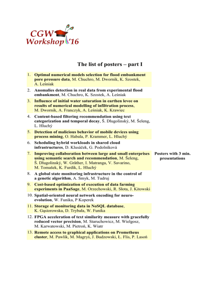 The list of posters – part I 1. Optimal numerical models selection for flood embankment pore pressure data, M. Chuchro, M. Dwornik, K. Szostek, A. Leśniak 2. Anomalies detection in real data from experimental flood embankment, M. Chuchro, K. Szostek, A. Leśniak 3. Influence of initial water saturation in earthen levee on results of numerical modelling of infiltration process, M. Dwornik, A. Franczyk, A. Leśniak, K. Krawiec 4. Content-based filtering recommendation using text categorization and temporal decay, Š. Dlugolinský, M. Šeleng, L. Hluchý 5. Detection of malicious behavior of mobile devices using process mining, O. Habala, P. Krammer, L. Hluchý 6. Scheduling hybrid workloads in shared cloud infrastructures, D. Klusáček, G. Podolníková 7. Improving collaboration between large and small enterprises using semantic search and recommendation, M. Šeleng, Š. Dlugolinský, W. Gräther, I. Matranga, V. Savarino, M. Tomašek, K. Furdík, L. Hluchý 8. A global state monitoring infrastructure in the control of a genetic algorithm, A. Smyk, M. Tudruj 9. Cost-based optimization of execution of data farming experiments in PaaSage, M. Orzechowski, R. Słota, J. Kitowski 10. Spatial-oriented neural network encoding for neuroevolution, W. Funika, P Koperek 11. Storage of monitoring data in NoSQL database, K. Gąsiorowska, D. Trybała, W. Funika 12. FPGA acceleration of text similarity measure with gracefully reduced vector precision, M. Staruchowicz, M. Wielgosz, M. Karwatowski, M. Pietroń, K. Wiatr 13. Remote access to graphical applications on Prometheus cluster, M. Pawlik, M. Magryś, J. Budzowski, Ł. Flis, P. Lasoń Posters with 3 min. presentations The list of posters – part II 14. Full-scale monitoring system of levees, A. Borecka, K. Korzec, J. Stanisz 15. Edge computing infrastructure for smart levee monitoring, R. Brzoza-Woch, M. Konieczny, B. Kwolek, P. Nawrocki, T. Szydło, K. Zieliński 16. An IT infrastructure for smart levee monitoring and flood decision support, M. Bubak, B. Baliś, D. Harężlak, M. Kasztelnik, P. Nowakowski, T. Bartyński, T. Gubała, M. Malawski, M. Pawlik, B. Wilk 17. Analysis of annual temperature distribution inside the experimental embankment, B. Bukowska-Belniak, M. Dwornik, A. Leśniak 18. SMART LEVEE in Poland. Full-scale monitoring experimental study of levees by different methods, A. Borecka, K. Korzec, J. Stanisz 19. Towards model execution environment for investigation of heart valve diseases, M. Bubak, T. Bartyński, T. Gubała, D. Harężlak, M. Kasztelnik, M. Malawski, J. Meizner, P. Nowakowski Posters with 20 min. presentations