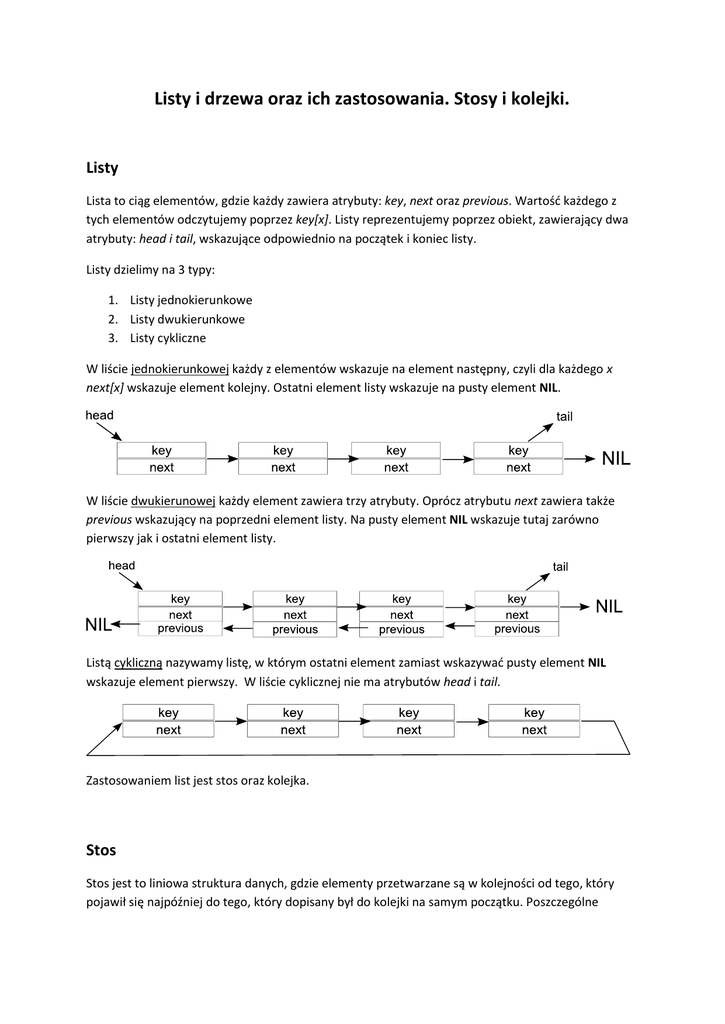 Listy i drzewa oraz ich zastosowania. Stosy i kolejki.
