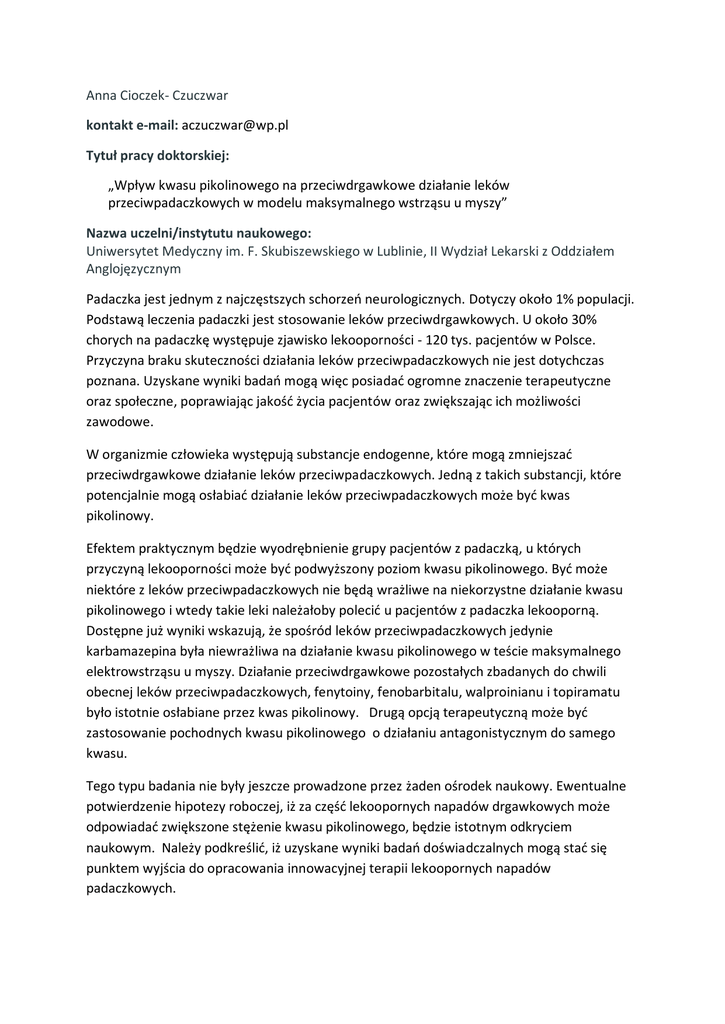 Anna Cioczek- Czuczwar kontakt e-mail: [email protected] Tytuł pracy doktorskiej: „Wpływ kwasu pikolinowego na przeciwdrgawkowe działanie leków przeciwpadaczkowych w modelu maksymalnego wstrząsu u myszy” Nazwa uczelni/instytutu naukowego: Uniwersytet Medyczny im. F. Skubiszewskiego w Lublinie, II Wydział Lekarski z Oddziałem Anglojęzycznym Padaczka jest jednym z najczęstszych schorzeń neurologicznych. Dotyczy około 1% populacji. Podstawą leczenia padaczki jest stosowanie leków przeciwdrgawkowych. U około 30% chorych na padaczkę występuje zjawisko lekooporności - 120 tys. pacjentów w Polsce. Przyczyna braku skuteczności działania leków przeciwpadaczkowych nie jest dotychczas poznana. Uzyskane wyniki badań mogą więc posiadać ogromne znaczenie terapeutyczne oraz społeczne, poprawiając jakość życia pacjentów oraz zwiększając ich możliwości zawodowe. W organizmie człowieka występują substancje endogenne, które mogą zmniejszać przeciwdrgawkowe działanie leków przeciwpadaczkowych. Jedną z takich substancji, które potencjalnie mogą osłabiać działanie leków przeciwpadaczkowych może być kwas pikolinowy. Efektem praktycznym będzie wyodrębnienie grupy pacjentów z padaczką, u których przyczyną lekooporności może być podwyższony poziom kwasu pikolinowego. Być może niektóre z leków przeciwpadaczkowych nie będą wrażliwe na niekorzystne działanie kwasu pikolinowego i wtedy takie leki należałoby polecić u pacjentów z padaczka lekooporną. Dostępne już wyniki wskazują, że spośród leków przeciwpadaczkowych jedynie karbamazepina była niewrażliwa na działanie kwasu pikolinowego w teście maksymalnego elektrowstrząsu u myszy. Działanie przeciwdrgawkowe pozostałych zbadanych do chwili obecnej leków przeciwpadaczkowych, fenytoiny, fenobarbitalu, walproinianu i topiramatu było istotnie osłabiane przez kwas pikolinowy. Drugą opcją terapeutyczną może być zastosowanie pochodnych kwasu pikolinowego o działaniu antagonistycznym do samego kwasu. Tego typu badania nie były jeszcze prowadzone przez żaden ośrodek naukowy. Ewentualne potwierdzenie hipotezy roboczej, iż za część lekoopornych napadów drgawkowych może odpowiadać zwiększone stężenie kwasu pikolinowego, będzie istotnym odkryciem naukowym. Należy podkreślić, iż uzyskane wyniki badań doświadczalnych mogą stać się punktem wyjścia do opracowania innowacyjnej terapii lekoopornych napadów padaczkowych. Zbadanie roli kwasu pikolinowego w patogenezie padaczki lekoopornej może mieć istotne znaczenie praktyczne: wykrycie podwyższonego poziomu kwasu pikolinowego u pacjentów może pozwolić na dobranie celowanej terapii, niewrażliwej na niekorzystne działanie kwasu pikolinowego, ponadto wyniki prowadzonych badań mogą stanowić pierwszy etap powstania nowych leków przeciwpadaczkowych o nowatorskich mechanizmach działaniach np. działaniu antagonistycznym do kwasu pikolinowego.