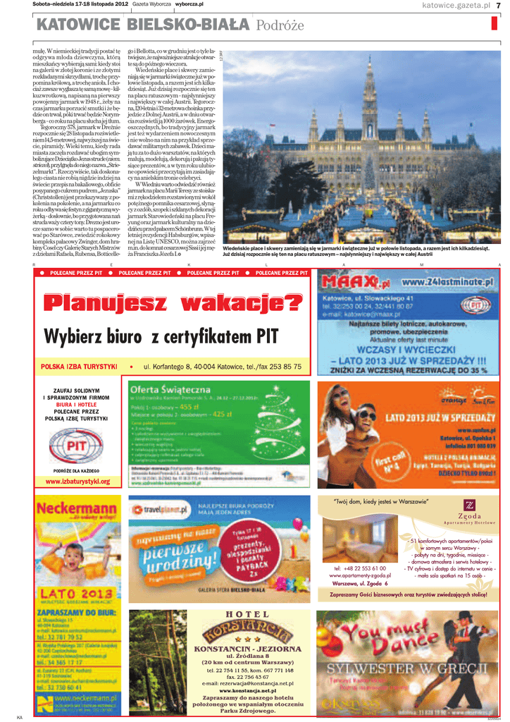 Sobota–niedziela 17-18 listopada 2012 Gazeta Wyborcza wyborcza.pl katowice.gazeta.pl 7 | | mułę. W niemieckiej tradycji postać tę odgrywa młoda dziewczyna, którą mieszkańcy wybierają sami: kiedy stoi na galerii w złotej koronie i ze złotymi rozkładanymi skrzydłami, trochę przypomina królową, atrochę anioła. Ichociaż zawsze wygłasza tę samą mowę – kilkuzwrotkową, napisaną na pierwszy powojenny jarmark w 1948 r., żeby na czas jarmarku porzucić smutki i że będzie on trwał, póki trwać będzie Norymberga – co roku na placu słucha jej tłum. Tegoroczny 578. jarmark w Dreźnie rozpocznie się 28 listopada rozświetleniem 14,5-metrowej, najwyższej na świecie, piramidy. Wieki temu, kiedy rada miasta zaczęła rozdawać ubogim symbolizujące Dzieciątko Jezus strucle (niem. striezel), przylgnęła do niego nazwa „Striezelmarkt”. Rzeczywiście, tak doskonałego ciasta nie robią nigdzie indziej na świecie: przepis na bakaliowego, obficie posypanego cukrem pudrem „Jezuska” (Christstollen) jest przekazywany z pokolenia na pokolenie, a na jarmarku co roku odbywa się festyn zgigantyczną wyżerką – dosłownie, bo przygotowana nań strucla waży cztery tony. Drezno jest urocze samo w sobie: warto tu pospacerować po Starówce, zwiedzić rokokowy kompleks pałacowy Zwinger, dom hrabiny Cosel czy Galerię Starych Mistrzów zdziełami Rafaela, Rubensa, BotticelleR KA E go i Bellotta, co w grudniu jest o tyle łatwiejsze, że najważniejsze atrakcje otwarte są do późnego wieczora. Wiedeńskie place i skwery zamieniają się wjarmarki świąteczne już wpołowie listopada, a razem jest ich kilkadziesiąt. Już dzisiaj rozpocznie się ten na placu ratuszowym – najsłynniejszy i największy w całej Austrii. Tegoroczna, 120-letnia i32-metrowa choinka przyjedzie zDolnej Austrii, awdniu otwarcia rozświetli ją 1000 żarówek. Energooszczędnych, bo tradycyjny jarmark jest też wydarzeniem nowoczesnym i nie wolno na nim na przykład sprzedawać militarnych zabawek. Dzieci mają tu za to dużo warsztatów, na których malują, modelują, dekorują ipakują tysiące prezentów, a w tym roku ulubione opowieści przeczytają im zasiadający na anielskim tronie celebryci. WWiedniu warto odwiedzić również jarmark na placu Marii Teresy ze stoiskami zrękodziełem rozstawionymi wokół potężnego pomnika cesarzowej, słynący zozdób, szopek iszklanych dekoracji jarmark Starowiedeński na placu Freyung oraz jarmark kulturalny na dziedzińcu przed pałacem Schönbrunn. Wtej letniej rezydencji Habsburgów, wpisanej na Listę UNESCO, można zajrzeć m.in. do komnat cesarzowej Sissi ijej męża Franciszka Józefa I.f K 123RF KATOWICE BIELSKO-BIAŁA Podróże Wiedeńskie place i skwery zamieniają się w jarmarki świąteczne już w połowie listopada, a razem jest ich kilkadziesiąt. Już dzisiaj rozpocznie się ten na placu ratuszowym – najsłynniejszy i największy w całej Austrii L A M A 32205024