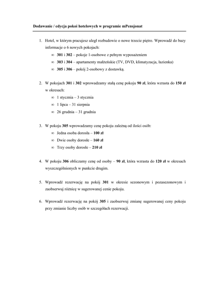 Dodawanie / edycja pokoi hotelowych w programie mPensjonat 1. Hotel, w którym pracujesz uległ rozbudowie o nowe trzecie piętro. Wprowadź do bazy informacje o 6 nowych pokojach: • 301 i 302 – pokoje 1-osobowe z pełnym wyposażeniem • 303 i 304 – apartamenty małżeńskie (TV, DVD, klimatyzacja, łazienka) • 305 i 306 – pokój 2-osobowy z dostawką. 2. W pokojach 301 i 302 wprowadzamy stałą cenę pokoju 90 zł, która wzrasta do 150 zł w okresach: • 1 stycznia – 3 stycznia • 1 lipca – 31 sierpnia • 26 grudnia – 31 grudnia 3. W pokoju 305 wprowadzamy cenę pokoju zależną od ilości osób: • Jedna osoba dorosła – 100 zł • Dwie osoby dorosłe – 160 zł • Trzy osoby dorosłe – 210 zł 4. W pokoju 306 obliczamy cenę od osoby – 90 zł, która wzrasta do 120 zł w okresach wyszczególnionych w punkcie drugim. 5. Wprowadź rezerwację na pokój 301 w okresie sezonowym i pozasezonowym i zaobserwuj różnicę w sugerowanej cenie pokoju. 6. Wprowadź rezerwację na pokój 305 i zaobserwuj zmianę sugerowanej ceny pokoju przy zmianie liczby osób w szczegółach rezerwacji.