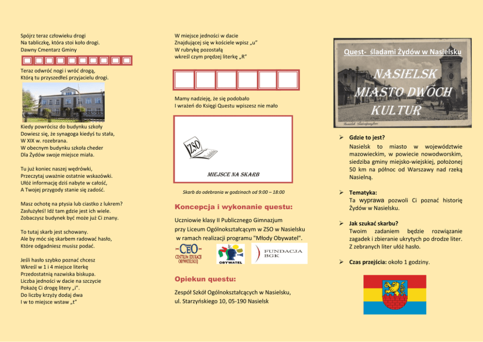 Spójrz teraz człowieku drogi Na tabliczkę, która stoi koło drogi. Dawny Cmentarz Gminy W miejsce jedności w dacie Znajdującej się w kościele wpisz „u” W rubrykę pozostałą wkreśl czym prędzej literkę „R” Teraz odwróć nogi i wróć drogą, Którą tu przyszedłeś przyjacielu drogi. Mamy nadzieję, że się podobało I wrażeń do Księgi Questu wpiszesz nie mało Kiedy powrócisz do budynku szkoły Dowiesz się, że synagoga kiedyś tu stała, W XIX w. rozebrana. W obecnym budynku szkoła cheder Dla Żydów swoje miejsce miała. Tu już koniec naszej wędrówki, Przeczytaj uważnie ostatnie wskazówki. Ułóż informację dziś nabyte w całość, A Twojej przygody stanie się zadość. Masz ochotę na ptysia lub ciastko z lukrem? Zasłużyłeś! Idź tam gdzie jest ich wiele. Zobaczysz budynek być może już Ci znany. To tutaj skarb jest schowany. Ale by móc się skarbem radować hasło, Które odgadniesz musisz podać. Jeśli hasło szybko poznać chcesz Wkreśl w 1 i 4 miejsce literkę Przedostatnią nazwiska biskupa. Liczba jedności w dacie na szczycie Pokażę Ci drogę litery „i”. Do liczby krzyży dodaj dwa I w to miejsce wstaw „t” Miejsce na skarb Skarb do odebrania w godzinach od 9:00 – 18:00 Koncepcja i wykonanie questu: Uczniowie klasy II Publicznego Gimnazjum przy Liceum Ogólnokształcącym w ZSO w Nasielsku w ramach realizacji programu "Młody Obywatel". Quest- śladami Żydów w Nasielsku Nasielsk Miasto Dwóch Kultur Gdzie to jest? Nasielsk to miasto w województwie mazowieckim, w powiecie nowodworskim, siedziba gminy miejsko-wiejskiej, położonej 50 km na północ od Warszawy nad rzeką Nasielną. Tematyka: Ta wyprawa pozwoli Ci poznać historię Żydów w Nasielsku. Jak szukać skarbu? Twoim zadaniem będzie rozwiązanie zagadek i zbieranie ukrytych po drodze liter. Z zebranych liter ułóż hasło. Czas przejścia: około 1 godziny. Opiekun questu: Zespół Szkół Ogólnokształcących w Nasielsku, ul. Starzyńskiego 10, 05-190 Nasielsk Witamy Cię dzisiaj w Nasielsku, Gdzie ciekawych historii jest bez liku. Choć nasza miejscowość jest mała, Dzieje naprawdę ciekawe miała. Zostaw za sobą wszelkie zmartwienia I ruszaj w drogę, bo skarb jest do odnalezienia! Wygodne buty, uśmiechnięta mina, A miło upłynie najbliższa godzina. Nasza gra zaczyna się tam, Gdzie samochodów jest wiele A święty Jan Paweł II stoi na czele. Dla kupców niegdyś ważne miejsce to było, Bo wiele zakupów się tam robiło. Poczuj klimat miasteczka mazowieckiego, Przez ludzi tłumnie odwiedzanego! Szybko zabierz się do pracy I odwiedź wszystkie miejsca z naszej trasy! Podążaj najpierw ku Kościołowi. Z czerwonej cegły zbudowany , Każdego dnia hejnał jest z niego grany. Wszystko wyjaśnione jest na tablicach , Dlatego podejdź do nich i uważnie przeczytaj. Zobacz, jakie nazwisko biskupa było, Które do konsekracji świątyni się przyczyniło. Na tablicy widnieje także pewna data. Kiedy pierwsza więc wzmianka O Nasielsku miejsce miała? Czas już się z tym świętym miejscem Pożegnać mój drogi. Niech w dół żwawo zaprowadzą cię nogi. Idź na cmentarz gdzie zmarli Odpoczywają na wieki. Następnie przekrocz jego bramę I poszukaj miejsca, gdzie spoczywają Żołnierze polegli. Ułatwią Ci to dwie flagi W kolorze kraju naszego. Ludzie Ci bowiem patriotami Za czasów życia byli swego. Znów na tablicy wszystko Ci podali. Odczytaj z niej zatem Naszych bohaterów rywali Na dole, na drewnianych belkach Krzyże są Pomnóż je razy sto Jaką wtedy liczbę mamy? Swój wynik zapamiętaj I powróć do cmentarza bramy. Tyle metrów dzieli Cię od Tych, którzy gaszą pożary. Skręć w ulicę, której nazwa Kojarzy się z młynem. Powróć do miejsca, w którym Handlarze niegdyś byli. Przejdź przez pasy i kieruj się Prawą ręką, aż spotkasz się z alejką . W centrum Nasielska właśnie jesteś. Obserwuj i rozglądaj się bacznie. Czy widzisz już świętego Z czarnego kamienia wzniesionego? Pamiętasz cmentarz? Liczba krzyży drewnianych Duże znaczenia bowiem tu ma. Z tym numerem domu poszukaj. Upamiętniony on został W filmie Davida Kurtza. Na rynku głównym poszukaj domu z rokiem Powstania na szczycie. Poszukaj też dawnego prezydenta Warszawy, Który w latach 1934-1939 miał „trochę” władzy. Poszukaj bloku 4a nowego. W tym właśnie miejscu mistrz Żydów – Rabbin mieszkał przez lat wiele. Stojąc przy starym domu Rabbina Idź tam, gdzie ulica z drugą ulicą się przecina. Ulicą, która kojarzy się ze stolicą. Wrzuć żwawy krok a wnet Ujrzysz młyn stary. Czym prędzej skręć w lewo, A dojdziesz do celu kolego. Znów świat zmarłych zobaczysz, A wtedy o skarbie coraz bardziej pomarzysz. Tylko uwaga on jest nieużywany. Urosły na nim już drzewa i krzewy, Dlatego nie przegap go kolego. To ten lasek niedaleko szlaku naszego.