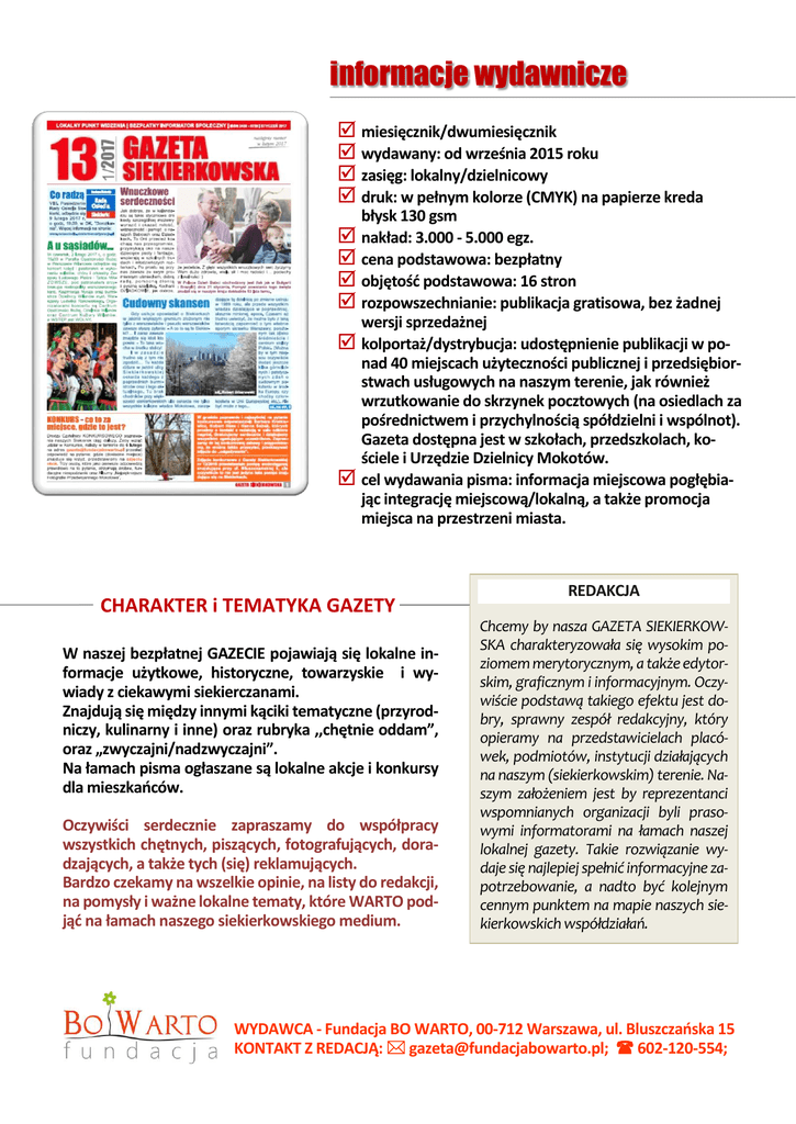 informacje wydawnicze miesięcznik/dwumiesięcznik wydawany: od września 2015 roku zasięg: lokalny/dzielnicowy druk: w pełnym kolorze (CMYK) na papierze kreda błysk 130 gsm nakład: 3.000 - 5.000 egz. cena podstawowa: bezpłatny objętość podstawowa: 16 stron rozpowszechnianie: publikacja gratisowa, bez żadnej wersji sprzedażnej kolportaż/dystrybucja: udostępnienie publikacji w ponad 40 miejscach użyteczności publicznej i przedsiębiorstwach usługowych na naszym terenie, jak również wrzutkowanie do skrzynek pocztowych (na osiedlach za pośrednictwem i przychylnością spółdzielni i wspólnot). Gazeta dostępna jest w szkołach, przedszkolach, kościele i Urzędzie Dzielnicy Mokotów. cel wydawania pisma: informacja miejscowa pogłębiając integrację miejscową/lokalną, a także promocja miejsca na przestrzeni miasta. CHARAKTER i TEMATYKA GAZETY W naszej bezpłatnej GAZECIE pojawiają się lokalne informacje użytkowe, historyczne, towarzyskie i wywiady z ciekawymi siekierczanami. Znajdują się między innymi kąciki tematyczne (przyrodniczy, kulinarny i inne) oraz rubryka ,,chętnie oddam”, oraz „zwyczajni/nadzwyczajni”. Na łamach pisma ogłaszane są lokalne akcje i konkursy dla mieszkańców. Oczywiści serdecznie zapraszamy do współpracy wszystkich chętnych, piszących, fotografujących, doradzających, a także tych (się) reklamujących. Bardzo czekamy na wszelkie opinie, na listy do redakcji, na pomysły i ważne lokalne tematy, które WARTO podjąć na łamach naszego siekierkowskiego medium. REDAKCJA Chcemy by nasza GAZETA SIEKIERKOWSKA charakteryzowała się wysokim poziomem merytorycznym, a także edytorskim, graficznym i informacyjnym. Oczywiście podstawą takiego efektu jest dobry, sprawny zespół redakcyjny, który opieramy na przedstawicielach placówek, podmiotów, instytucji działających na naszym (siekierkowskim) terenie. Naszym założeniem jest by reprezentanci wspomnianych organizacji byli prasowymi informatorami na łamach naszej lokalnej gazety. Takie rozwiązanie wydaje się najlepiej spełnić informacyjne zapotrzebowanie, a nadto być kolejnym cennym punktem na mapie naszych siekierkowskich współdziałań. WYDAWCA - Fundacja BO WARTO, 00-712 Warszawa, ul. Bluszczańska 15 KONTAKT Z REDACJĄ: [email protected]; 602-120-554;