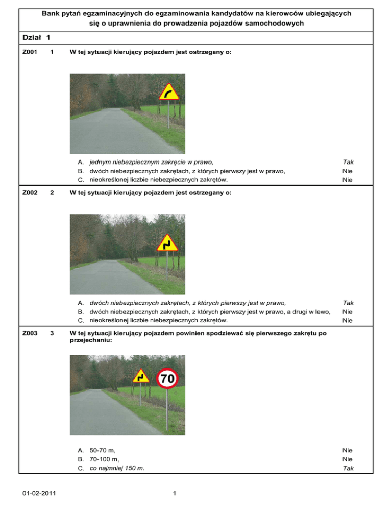 Bank pytań egzaminacyjnych do egzaminowania kandydatów na kierowców ubiegających się o uprawnienia do prowadzenia pojazdów samochodowych Dział 1 Z001 Z002 Z003 1 2 3 01-02-2011 W tej sytuacji kierujący pojazdem jest ostrzegany o: A. jednym niebezpiecznym zakręcie w prawo, Tak B. dwóch niebezpiecznych zakrętach, z których pierwszy jest w prawo, C. nieokreślonej liczbie niebezpiecznych zakrętów. Nie Nie W tej sytuacji kierujący pojazdem jest ostrzegany o: A. dwóch niebezpiecznych zakrętach, z których pierwszy jest w prawo, Tak B. dwóch niebezpiecznych zakrętach, z których pierwszy jest w prawo, a drugi w lewo, C. nieokreślonej liczbie niebezpiecznych zakrętów. Nie Nie W tej sytuacji kierujący pojazdem powinien spodziewać się pierwszego zakrętu po przejechaniu: A. 50-70 m, Nie B. 70-100 m, C. co najmniej 150 m. Nie Tak 1 Bank pytań egzaminacyjnych do egzaminowania kandydatów na kierowców ubiegających się o uprawnienia do prowadzenia pojazdów samochodowych Z004 Z005 Z006 4 5 6 01-02-2011 W tej sytuacji kierujący pojazdem: A. jest ostrzegany o zbliżaniu się do skrzyżowania z drogą podporządkowaną, Tak B. może skręcić na skrzyżowaniu w lewo, C. może spodziewać się pojazdów wjeżdżających na skrzyżowanie z lewej strony. Nie Tak W tej sytuacji kierujący pojazdem: A. jest ostrzegany o zbliżaniu się do skrzyżowania z drogą podporządkowaną, Tak B. może spodziewać się pojazdów wjeżdżających na skrzyżowanie z prawej strony, C. może skręcić na skrzyżowaniu w prawo. Tak Nie W tej sytuacji kierujący pojazdem: A. powinien zachować szczególną ostrożność, Tak B. jest ostrzegany o zbliżaniu się do skrzyżowania z drogą podporządkowaną, C. może skręcić na skrzyżowaniu w lewo. Tak 2 Tak Bank pytań egzaminacyjnych do egzaminowania kandydatów na kierowców ubiegających się o uprawnienia do prowadzenia pojazdów samochodowych Z007 Z008 Z009 7 8 9 01-02-2011 W tej sytuacji kierujący pojazdem jest ostrzegany o: A. zbliżaniu się do kilku wzniesień, Nie B. poprzecznej nierówności jezdni, C. możliwości zmniejszenia przyczepności kół do jezdni. Tak Tak W tej sytuacji kierujący pojazdem jest ostrzegany o: A. wypukłości na jezdni, zastosowanej w celu spowolnienia ruchu pojazdów, Nie B. podłużnej nierówności jezdni, C. poprzecznej nierówności jezdni. Nie Tak Znak ten umieszczony na drodze o dopuszczalnej prędkości 60 km/h, oznacza, że należy spodziewać się nierówności jezdni po przejechaniu: A. nie więcej niż 100 m, Tak B. 101-150 m, C. co najmniej 150 m. Nie Nie 3 Bank pytań egzaminacyjnych do egzaminowania kandydatów na kierowców ubiegających się o uprawnienia do prowadzenia pojazdów samochodowych Z010 Z011 Z014 10 11 14 01-02-2011 W tej sytuacji kierujący pojazdem jest ostrzegany o: A. zamknięciu drogi dla ruchu z przeciwnego kierunku, Nie B. zwężeniu jezdni po lewej stronie, C. zwężeniu jezdni mogącym powodować utrudnienie ruchu. Tak Tak W tej sytuacji kierujący pojazdem jest ostrzegany o: A. zamknięciu drogi dla ruchu, Nie B. zwężeniu jezdni po prawej stronie, C. zwężeniu jezdni po obu stronach. Nie Tak W tej sytuacji kierujący pojazdem jest ostrzegany o możliwości poślizgu pojazdu spowodowanego w szczególności: A. zmianą nawierzchni jezdni, Tak B. okresowym zawilgoceniem jezdni, C. stałym zawilgoceniem jezdni. Tak 4 Tak Bank pytań egzaminacyjnych do egzaminowania kandydatów na kierowców ubiegających się o uprawnienia do prowadzenia pojazdów samochodowych Z015 Z016 Z017 15 16 17 01-02-2011 W tej sytuacji kierujący pojazdem jest ostrzegany o możliwości poślizgu pojazdu: A. od miejsca ustawienia znaku ostrzegawczego, Tak B. na odcinku 3,5 km, C. po przejechaniu 3,5 km. Tak Nie W tej sytuacji kierujący pojazdem jest ostrzegany o: A. miejscu szczególnie uczęszczanym przez dzieci, Nie B. przejściu dla pieszych, C. miejscu częstych wypadków z pieszymi. Tak Nie W tej sytuacji kierujący pojazdem powinien: A. uważnie obserwować całe otoczenie drogi, Tak B. dostosować prędkość jazdy do możliwości zatrzymania pojazdu przed przejściem dla pieszych, C. być przygotowanym do hamowania pojazdu, jeżeli na przejściu pojawią się piesi. Tak 5 Tak Bank pytań egzaminacyjnych do egzaminowania kandydatów na kierowców ubiegających się o uprawnienia do prowadzenia pojazdów samochodowych Z018 Z020 Z021 18 20 21 01-02-2011 W tej sytuacji kierujący pojazdem powinien spodziewać się przejścia dla pieszych po przejechaniu: A. 25-50 m, Nie B. 51-100 m, C. co najmniej 150 m. Nie Tak W tej sytuacji kierujący pojazdem powinien: A. zachować szczególną ostrożność, Tak B. uważnie obserwować całe otoczenie drogi, C. być przygotowanym do hamowania pojazdu, jeżeli zobaczy dzieci w pobliżu jezdni. Tak Tak W tej sytuacji można spodziewać się miejsca szczególnie uczęszczanego przez dzieci po przejechaniu: A. nie więcej niż 100 m, Tak B. 101-150 m, C. co najmniej 150 m. Nie Nie 6 Bank pytań egzaminacyjnych do egzaminowania kandydatów na kierowców ubiegających się o uprawnienia do prowadzenia pojazdów samochodowych Z022 Z024 Z025 22 24 25 W tej sytuacji kierujący pojazdem jest ostrzegany o: A. przejściu dla pieszych, Nie B. miejscu częstych potrąceń pieszych, C. miejscu częstych wypadków spowodowanych śliską nawierzchnią. Tak Nie W tej sytuacji kierujący pojazdem jest ostrzegany o: A. zwężeniu jezdni, Nie B. miejscu, w którym rozpoczyna się ruch w jednym kierunku, C. miejscu, w którym rozpoczyna się ruch dwukierunkowy. Nie Tak Na drodze oznaczonej tym znakiem ruch pojazdów jest: A. dozwolony w jednym kierunku, Nie B. zabroniony, z wyjątkiem pojazdów kierowanych przez osoby niepełnosprawne o Tak obniżonej sprawności ruchowej, C. zabroniony, z wyjątkiem pojazdów przewożących osoby niepełnosprawne o obniżonej Tak sprawności ruchowej. 01-02-2011 7 Bank pytań egzaminacyjnych do egzaminowania kandydatów na kierowców ubie