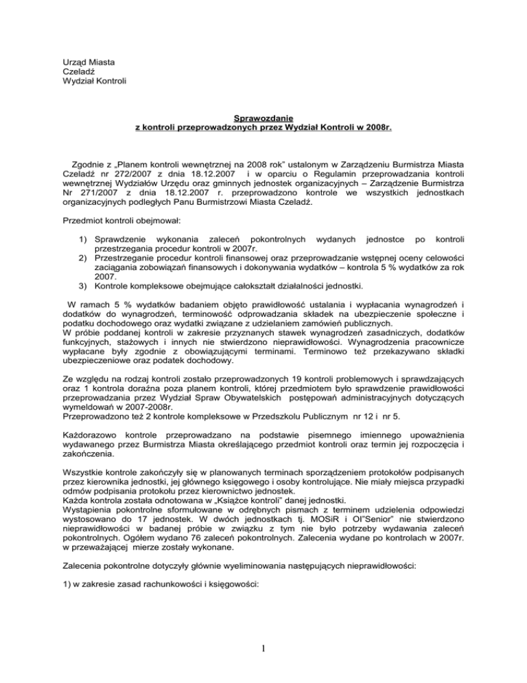 Urząd Miasta Czeladź Wydział Kontroli Sprawozdanie z kontroli przeprowadzonych przez Wydział Kontroli w 2008r. Zgodnie z „Planem kontroli wewnętrznej na 2008 rok” ustalonym w Zarządzeniu Burmistrza Miasta Czeladź nr 272/2007 z dnia 18.12.2007 i w oparciu o Regulamin przeprowadzania kontroli wewnętrznej Wydziałów Urzędu oraz gminnych jednostek organizacyjnych – Zarządzenie Burmistrza Nr 271/2007 z dnia 18.12.2007 r. przeprowadzono kontrole we wszystkich jednostkach organizacyjnych podległych Panu Burmistrzowi Miasta Czeladź. Przedmiot kontroli obejmował: 1) Sprawdzenie wykonania zaleceń pokontrolnych wydanych jednostce po kontroli przestrzegania procedur kontroli w 2007r. 2) Przestrzeganie procedur kontroli finansowej oraz przeprowadzanie wstępnej oceny celowości zaciągania zobowiązań finansowych i dokonywania wydatków – kontrola 5 % wydatków za rok 2007. 3) Kontrole kompleksowe obejmujące całokształt działalności jednostki. W ramach 5 % wydatków badaniem objęto prawidłowość ustalania i wypłacania wynagrodzeń i dodatków do wynagrodzeń, terminowość odprowadzania składek na ubezpieczenie społeczne i podatku dochodowego oraz wydatki związane z udzielaniem zamówień publicznych. W próbie poddanej kontroli w zakresie przyznanych stawek wynagrodzeń zasadniczych, dodatków funkcyjnych, stażowych i innych nie stwierdzono nieprawidłowości. Wynagrodzenia pracownicze wypłacane były zgodnie z obowiązującymi terminami. Terminowo też przekazywano składki ubezpieczeniowe oraz podatek dochodowy. Ze względu na rodzaj kontroli zostało przeprowadzonych 19 kontroli problemowych i sprawdzających oraz 1 kontrola doraźna poza planem kontroli, której przedmiotem było sprawdzenie prawidłowości przeprowadzania przez Wydział Spraw Obywatelskich postępowań administracyjnych dotyczących wymeldowań w 2007-2008r. Przeprowadzono też 2 kontrole kompleksowe w Przedszkolu Publicznym nr 12 i nr 5. Każdorazowo kontrole przeprowadzano na podstawie pisemnego imiennego upoważnienia wydawanego przez Burmistrza Miasta określającego przedmiot kontroli oraz termin jej rozpoczęcia i zakończenia. Wszystkie kontrole zakończyły się w planowanych terminach sporządzeniem protokołów podpisanych przez kierownika jednostki, jej głównego księgowego i osoby kontrolujące. Nie miały miejsca przypadki odmów podpisania protokołu przez kierownictwo jednostek. Każda kontrola została odnotowana w „Książce kontroli” danej jednostki. Wystąpienia pokontrolne sformułowane w odrębnych pismach z terminem udzielenia odpowiedzi wystosowano do 17 jednostek. W dwóch jednostkach tj. MOSiR i OI”Senior” nie stwierdzono nieprawidłowości w badanej próbie w związku z tym nie było potrzeby wydawania zaleceń pokontrolnych. Ogółem wydano 76 zaleceń pokontrolnych. Zalecenia wydane po kontrolach w 2007r. w przeważającej mierze zostały wykonane. Zalecenia pokontrolne dotyczyły głównie wyeliminowania następujących nieprawidłowości: 1) w zakresie zasad rachunkowości i księgowości: 1 ● brak prawidłowo opracowanej dokumentacji opisującej przyjęte przez jednostkę zasady rachunkowości, przepisy wewnętrzne regulujące zasady rachunkowości niekompletne - brak elementów wymaganych ustawą o rachunkowości; ● brak opracowania procedur kontroli finansowej; ● brak poprawnie opracowanej instrukcji obiegu, kontroli i archiwizowania dokumentów finansowo – księgowych lub innych instrukcji; ● dokonywanie zapisów w księgach rachunkowych na podstawie dowodów niespełniających wymogów określonych w art.21 i 22 ustawy o rachunkowości; 2) w zakresie gospodarowania środkami zakładowego funduszu świadczeń socjalnych: ● brak wprowadzenia Regulaminu zakładowego funduszu świadczeń socjalnych w formie zarządzenia dyrektora, ● nieprawidłowo opracowana tabela dopłat do wypoczynku finansowanego z zfśs różnicująca dopłaty w zależności od tego czy się jest pracownikiem czy emerytem; ● nieprzekazanie należnych Funduszowi środków wynikających z naliczenia po korekcie na koniec roku; 3) dochody budżetowe w zakresie odpłatności za żywienie dzieci w przedszkolu i z tytułu opłaty stałej ● zaniechanie dochodzenia należności z tytułu nieuregulowanych opłat za żywienie dzieci oraz nieuiszczonej opłaty stałej; ● dokonywanie umorzeń z tytułu zaległości w opłatach za przedszkole bez zachowania procedur obowiązującej w tym zakresie uchwały Rady Miejskiej w Czeladzi i zarządzenia dyrektora placówki; ● niedotrzymywanie terminów przekazywania należności z powyższych tytułów na rachunek Gminy. 4) w zakresie udzielania zamówień publicznych: ● nierespektowanie w pełni przepisów Prawa zamówień publicznych poprzez: nieodrzucenie oferty, której treść nie odpowiadała siwz, zawarcie umowy z wykonawcą przed upływem 7 dni od daty przekazania wykonawcom zawiadomienia o wyborze oferty, niezamieszczanie informacji o wyborze najkorzystniejszej oferty na stronie internetowej; ● brak określenia wartości nominalnej zobowiązania w zawartej umowie z wykonawcą. 5) w zakresie spraw ogólno – organizacyjnych : ● niedostosowanie instrukcji kancelaryjnej do wielkości, struktury organizacyjnej i specyfiki działania jednostki, ● nieoznaczanie korespondencji wychodzącej numerem wynikającym z haseł klasyfikacyjnych zawartych w jrwa, ● nieodnotowywanie wpływu korespondencji przychodzącej ( w tym ofert przetargowych) w dzienniku pocztowym. 6) w zakresie gospodarowania środkami majątkowymi i inwentaryzacji : ● instrukcja inwentaryzacyjna – niedostosowana do wielkości, struktury organizacyjnej i specyfiki działania jednostki; ● nieprawidłowe zapisy w księgach inwentarzowych uniemożliwiające jednoznaczną identyfikację składników majątkowych. W stosunku do odpowiedzialnych osób za braki w przeprowadzeniu inwentaryzacji w PP nr 12 skierowano wniosek do Rzecznika Dyscypliny Finans