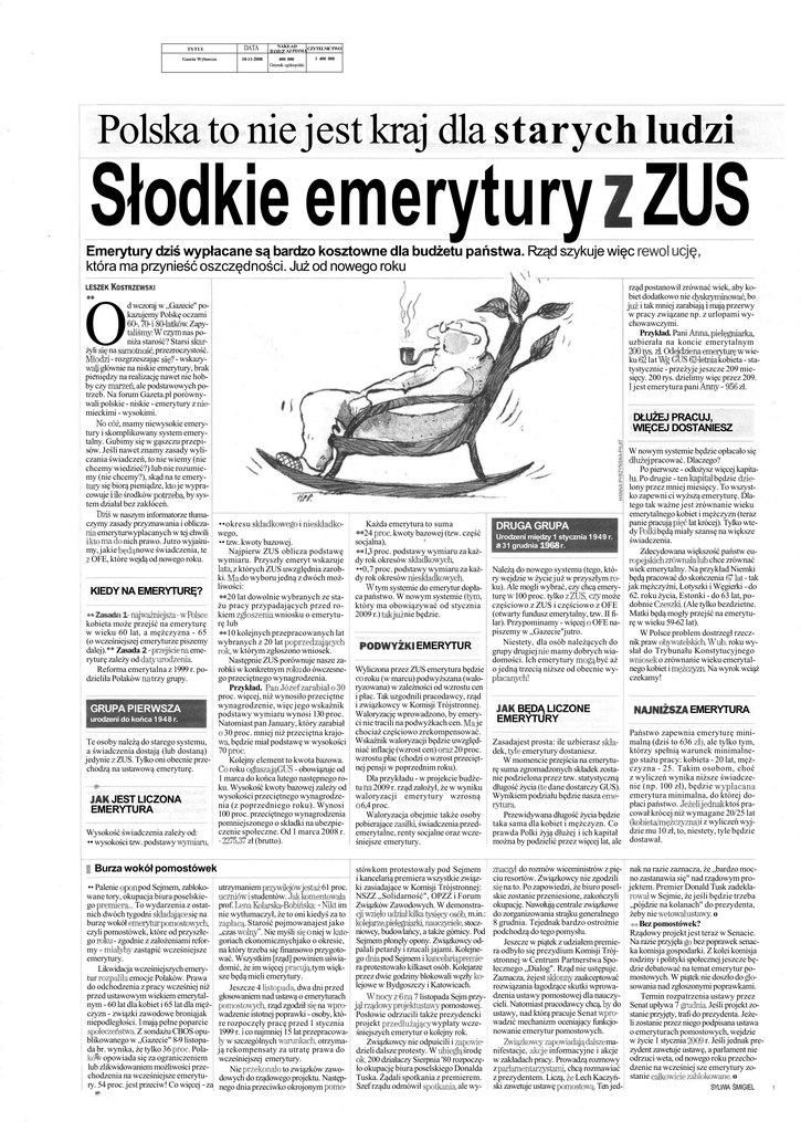 TYTUŁ Gazeta Wyborcza DATA 18-11-2008 NAKŁAD R OD 7, AJ PISMACZYTELNICTWO 400 000 Dziennik ogólnopolski 1 400 000 Polska to nie jest kraj dla starych ludzi Słodkie emerytury z ZUS Emerytury dziś wypłacane są bardzo kosztowne dla budżetu państwa. Rząd szykuje więc rewol ucję. która ma przynieść oszczędności. Już od nowego roku rząd postanowił zrównać wiek, aby ko biet dodatkowo nie dyskryminować, bo już i tak mniej zarabiają i mają przerwy w pracy związane np. z urlopami wy chowawczymi. Przykład. Pani Anna, pielęgniarka, uzbierała na koncie emerytalnym 200 rys. zł. Odejdzie na emeryturę w wie ku 62 lat Wg GUS 62-letnia kobieta - sta tystycznie - przeżyje jeszcze 209 mie sięcy. 200 rys. dzielimy więc przez 209. I jest emerytura pani Anny - 956 zł. LESZEK KOSTRZEWSKI •• O d wczoraj w „Gazecie" po kazujemy Polskę oczami 60-, 70-i 80-latków. Zapy taliśmy W czym nas po niża starość? Starsi skar żyli się na samotność, przezroczystość. Młodzi - rozgrzeszając się? - wskazy wać głównie na niskie emerytury, brak pieniędzy na realizację nawet nie hob by czy marzeń, ale podstawowych po trzeb. Na forum Gazeta.pl porówny wali polskie - niskie - emerytury z nie mieckimi - wysokimi. No cóż, mamy niewysokie emery tury i skomplikowany system emery talny. Gubimy się w gąszczu przepi sów. Jeśli nawet znamy zasady wyli czania świadczeń, to nie wiemy (nie chcemy wiedzieć?) lub nie rozumie my (nie chcemy?), skąd na te emery tury się biorą pieniądze, kto je wypra cowuje i ile środków potrzeba, by sys tem działał bez zakłóceń. Dziś w naszym informatorze tłuma czymy zasady przyznawania i oblicza ••okresu składkowego i nieskładkonia emeryturwyplacanych w tej chwili wego, i kto ma do nich prawo. Jutro wyjaśni •• tzw. kwoty bazowej. my, jakie będą nowe świadczenia, te Najpierw ZUS oblicza podstawę z OFE, które wejdą od nowego roku. wymiaru. Przyszły emeryt wskazuje lata, z których ZUS uwzględnia zarob ki. Ma do wyboru jedną z dwóch moż liwości: KIEDY NA EMERYTURĘ? •• 20 lat dowolnie wybranych ze sta żu pracy przypadających przed ro 11-najważniejsza-wPolsce kiem zgłoszenia wniosku o emerytu kobieta może przejść na emeryturę rę lub w wieku 60 lat, a mężczyzna - 65 •• 10 kolejnych przepracowanych lat (o wcześniejszej emeryturze piszemy wybranych z 20 lat poprzedzających dalej).** Zasada 2-przejście na eme rok, w którym zgłoszono wniosek. ryturę zależy od daty urodzenia. Następnie ZUS porównuje nasze za Reforma emerytalna z 1999 r. po robki w konkretnym roku do ówczesne go przeciętnego wynagrodzenia. dzieliła Polaków na trzy grupy. Przykład. PanJózefzarabiało30 proc. więcej, niż wynosiło przeciętne wynagrodzenie, więc jego wskaźnik GRUPA PIERWSZA podstawy wymiaru wynosi 130 proc. urodzeni do końca 1948 r. Natomiast pan January, który zarabiał 0 30 proc. mniej niż przeciętna krajo Te osoby należą do starego systemu, wa, będzie miał podstawę w wysokości a świadczenia dostają (lub dostaną) 70 proc. jedynie z ZUS. Tylko oni obecnie prze Kolejny element to kwota bazowa. chodzą na ustawową emeryturę. Co roku ogłaszają GUS - obowiązuje od 1 marca do końca lutego następnego ro ku. Wysokość kwoty bazowej zależy od wysokości przeciętnego wynagrodze JAK JEST LICZONA nia (z poprzedniego roku). Wynosi EMERYTURA 100 proc. przeciętnego wynagrodzenia pomniejszonego o składki na ubezpie czenie społeczne. Od 1 marca 2008 r. Wysokość świadczenia zależy od: •• wysokości tzw. podstawy wymiaru, -2275,37 zł (brutto). Burza wokół pomostówek •• Palenie opon pod Sejmem, zabloko wane tory, okupacja biura poselskie go premiera... To wydarzenia z ostat nich dwóch tygodni składające się na burzę wokół emerytur pomostowych, czyli pomostówek, które od przyszłe go roku - zgodnie z założeniami refor my - miałyby zastąpić wcześniejsze emerytury. Likwidacja wcześniejszych emery tur rozpaliła emocje Polaków. Prawa do odchodzenia z pracy wcześniej niż przed ustawowym wiekiem emerytal nym - 60 lat dla kobiet i 65 lat dla męż czyzn - związki zawodowe broniąjak niepodległości. I mają pełne poparcie społeczeństwa. Z sondażu CBOS opu blikowanego w „Gazecie" 8-9 listopa da br. wynika, że tylko 36 proc. Pola ków opowiada się za ograniczeniem lub zlikwidowaniem możliwości prze chodzenia na wcześniejsze emerytu ry. 54 proc. jest przeciw! Co więcej - za utrzymaniem przywilejówjest aż 61 proc. uczniowi studentów. Jak komentowała prof. Lena Kolarska-Bobińska: - Nikt im nie wytłumaczył, że to oni kiedyś za to zapłacą. Starość pojmowanajest jako „czas wolny". Nie myśli się o niej w kate goriach ekonomicznychjako o okresie, na który trzeba się finansowo przygoto wać. Wszystkim [rząd] powinien uświa domić, że im więcej pracują, tym więk sze będą mieli emerytury. Jeszcze 4 listopada, dwa dni przed głosowaniem nad ustawą o emeryturach pomostowych, rząd zgodził się na wpro wadzenie istotnej poprawki - osoby, któ re rozpoczęły pracę przed 1 stycznia 1999 r. i co najmniej 15 lat przepracowa ły w szczególnych warunkach, otrzyma ją rekompensaty za utratę prawa do wcześniejszej emerytury. Nie przekonało to związków zawo dowych do rządowego projektu. Następ nego dnia przeciwko okrojonym pomo- DŁUŻEJ PRACUJ, WIĘCEJ DOSTANIESZ W nowym systemie będzie opłacało się dłużej pracować. Dlaczego? Po pierwsze - odłożysz więcej kapitalu. Po drugie - ten kapitał będzie dzie lony przez mniej miesięcy. To wszyst ko zapewni ci wyższą emeryturę. Dla tego tak ważne jest zrównanie wieku emerytalnego kobiet i mężczyzn (teraz panie pracują pięć lat krócej). Tylko wte Każda emerytura to suma DRUGA GRUPA dy PoM będą miały szansę na większe •• 24 proc. kwoty bazowej (tzw. część Urodzeni miedzy 1 stycznia 1949 r. świadczenia. socjalna), a 31 grudnia 1968 r. •• 1,3 proc. podstawy 