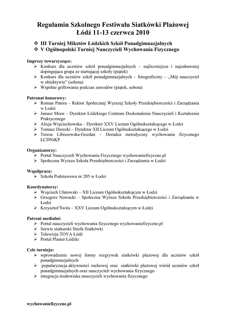 Regulamin Szkolnego Festiwalu Siatkówki Plażowej Łódź 11-13 czerwca 2010 III Turniej Mikstów Łódzkich Szkół Ponadgimnazjalnych V Ogólnopolski Turniej Nauczycieli Wychowania Fizycznego Imprezy towarzyszące: Konkurs dla uczniów szkół ponadgimnazjalnych – najliczniejsza i najzabawniej dopingująca grupa ze startującej szkoły (piątek) Konkurs dla uczniów szkół ponadgimnazjalnych – fotograficzny – „Mój nauczyciel w obiektywie” (sobota) Wspólne grillowanie podczas zawodów (piątek, sobota) Patronat honorowy: Roman Patora – Rektor Społecznej Wyższej Szkoły Przedsiębiorczości i Zarządzania w Łodzi Janusz Moos – Dyrektor Łódzkiego Centrum Doskonalenia Nauczycieli i Kształcenia Praktycznego Alicja Wojciechowska – Dyrektor XXV Liceum Ogólnokształcącego w Łodzi Tomasz Derecki – Dyrektor XII Liceum Ogólnokształcącego w Łodzi Teresa Libiszewska-Gozdan – Doradca metodyczny wychowania fizycznego ŁCDNiKP Organizatorzy: Portal Nauczycieli Wychowania Fizycznego wychowaniefizyczne.pl Społeczna Wyższa Szkoła Przedsiębiorczości i Zarządzania w Łodzi Współpraca: Szkoła Podstawowa nr 205 w Łodzi Koordynatorzy: Wojciech Ulatowski – XII Liceum Ogólnokształcącym w Łodzi Grzegorz Nowacki – Społeczna Wyższa Szkoła Przedsiębiorczości i Zarządzania w Łodzi Krzysztof Świta – XXV Liceum Ogólnokształcącym w Łodzi Patroni medialni: Portal nauczycieli wychowania fizycznego wychowaniefizyczne.pl Serwis siatkarski Strefa Siatkówki Telewizja TOYA Łódź Portal Plaster Łódzki Cele turnieju: wprowadzenie nowej formy rozgrywek siatkówki plażowej dla uczniów szkół ponadgimnazjalnych popularyzacja aktywności ruchowej oraz siatkówki plażowej wśród uczniów szkół ponadgimnazjalnych oraz nauczycieli wychowania fizycznego integracja środowiska nauczycieli wychowania fizycznego wychowaniefizyczne.pl Termin i miejsce: Uczniowie – 11 czerwca 2010 (piątek) – Odprawa 9.00. Boiska Szkoły Podstawowej nr 205 w Łodzi, ul. Dąbrówki 1 (Olechów) Nauczyciele – 12/13 czerwca 2010 – (sobota/niedziela). Odprawa 9.00. Boiska Szkoły Podstawowej nr 205 w Łodzi, ul. Dąbrówki 1 (Olechów) Uczestnicy: Uczniowie: W zawodach mogą startować uczniowie jednej szkoły (szczególnie zapraszamy maturzystów) – zawodnik + zawodniczka (bez względu na rok urodzenia), którzy w sezonie 2009/2010 nie byli zgłoszeni do rozgrywek w ŁZPS (PZPS) w żadnej kategorii. UWAGA! Obowiązuje wyłącznie powyższy przepis dotyczący udziału zawodników zgłoszonych. Nie mają zastosowania żadne przepisy MSZS! Każda szkoła może wystawić jedną parę (szkoła może zgłosić również drugi zespół rezerwowy, który zostanie dokooptowany do turnieju w przypadku wolnych miejsc – decydować będzie kolejność zgłoszeń). System rozgrywek oraz punktacja w setach – w zależności od ilości zespołów (nie mniej niż 2 spotkania dla każdego zespołu). Organizator zastrzega sobie prawo do wcześniejszego, samodzielnego rozlosowania zespołów. Wszyscy zawodnicy są zobowiązani do gry w koszulkach sponsorów turnieju. Nauczyciele: Zawody zostaną rozegrane w dwóch kategoriach: mężczyzn i mikstów. W turnieju mogą startować wyłącznie nauczyciele wychowania fizycznego (w wyjątkowych przypadkach jeden z zawodników może być nauczycielem innego przedmiotu). Jedna para zawodników może reprezentować różne szkoły i różne miejscowości. System rozgrywania spotkań zostanie tak skonstruowany, aby umożliwić zawodnikom równoległy udział w meczach w obu kategoriach. System rozgrywek oraz punktacja w setach – w zależności od ilości zespołów (nie mniej niż 3 spotkania dla każdego zespołu). W zawodach mogą startować czynni zawodnicy, muszą jednak pamiętać o tym, że turniej ma przede wszystkim charakter rekreacyjno-integracyjny. Organizator zastrzega sobie prawo do samodzielnego rozstawienia zespołów. Przydział zespołów do grup zostanie podany na odprawie technicznej przed turniejem. Każdy zawodnik zobowiązany jest posiadać ważne badania lekarskie oraz ubezpieczenie NNW. Zawodnik przed rozpoczęciem turnieju musi wypełnić oświadczenie dotyczące ubezpieczenia i stanu zdrowia. Wszyscy zawodnicy są zobowiązani do gry w koszulkach sponsorów turnieju. Przepisy gry: system rozgrywania poszczególnych meczów będzie uzależniony od ilości zgłoszonych drużyn (informacja zostanie podana do 30.05) w rozgrywkach nauczycieli w kategorii mikstów "drugie odbicie" oceniane będzie tak jak w rozgrywkach halowych w rozgrywkach mikstów zarówno w kategorii uczniów jak i nauczycieli wykonanie zagrywki przez zawodnika w kierunku zawodniczki drużyny przeciwnej jest błędem. nie ma przerw technicznych pozostałe zasady gry zgodne z oficjalnymi przepisami siatkówki plażowej wychowaniefizyczne.pl Nagrody: Medale i dyplomy dla zespołów, które zajmą miejsca I-III w swoich kategoriach. Nagrody pocieszenia dla wszystkich uczestników turnieju. Indywidualne nagrody specjalne (kategorie zostaną podane przed turniejem) Zapisy: Uczniowie: Uczniowie nie płacą wpisowego. Zgłoszenia szkół przyjmowane są wyłącznie w formie pisemnej do wyczerpania limitu miejsc, nie później niż do dnia 25 maja 2010 (wtorek) na adres: [email protected] lub faksem na adres XII LO 42 63 340 82. Nauczyciel zgłaszający zespół jest odpowiedzialny (pod groźbą dyskwalifikacji drużyny) za sprawdzenie czy reprezentujący szkołę uczniowie nie byli zgłoszeni przez klub do rozgrywek ŁZPS (PZPS) w sezonie 2009/2010. Nauczyciele: Wpisowe wynosi 35 zł od osoby (jeżeli zawodnik występuje w dwóch kategoriach, wpisowe wpłaca tylko raz). Dla chętnych istnieje możliwość zarezerwowania noclegu. Koszt noclegu 30 zł od osoby. W razie wycofania się zespołu z zawodów wpisowe oraz wpłata za nocleg nie podlega zwrotowi. Wstępne zapisy przyjmowane są do wyczerpania limitu miejsc, nie później niż do dnia 25 maja 2010 (wtorek) 