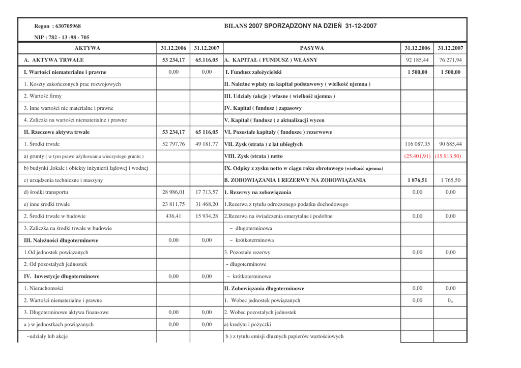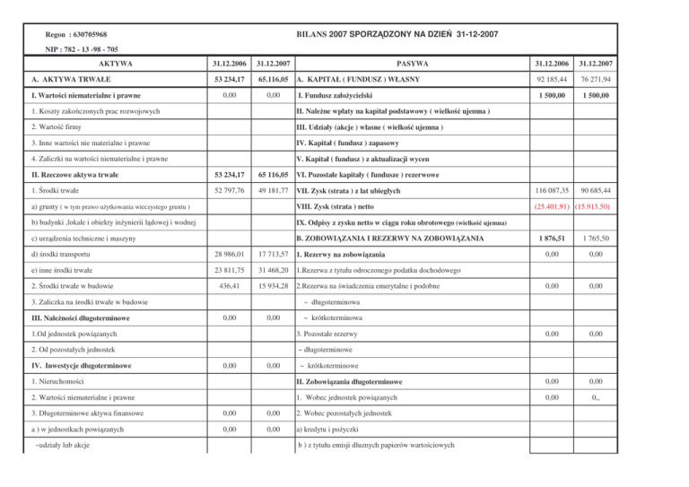 BILANS 2007 SPORZ DZONY NA DZIE Regon : 630705968 31-12-2007 NIP : 782 - 13 -98 - 705 AKTYWA A. AKTYWA TRWAŁE I. Warto ci niematerialne i prawne 31.12.2006 31.12.2007 53 234,17 65.116,05 0,00 0,00 PASYWA 31.12.2006 31.12.2007 A. KAPITAŁ ( FUNDUSZ ) WŁASNY 92 185,44 76 271,94 I. Fundusz zało ycielski 1 500,00 1 500,00 90 685,44 1. Koszty zako czonych prac rozwojowych II. Nale ne wpłaty na kapitał podstawowy ( wielko 2. Warto III. Udziały (akcje ) własne ( wielko firmy ujemna ) ujemna ) 3. Inne warto ci nie materialne i prawne IV. Kapitał ( fundusz ) zapasowy 4. Zaliczki na warto ci niematerialne i prawne V. Kapitał ( fundusz ) z aktualizacji wycen II. Rzeczowe aktywa trwałe 53 234,17 65 116,05 VI. Pozostałe kapitały ( fundusze ) rezerwowe 1. rodki trwałe 52 797,76 49 181,77 VII. Zysk (strata ) z lat ubiegłych 116 087,35 a) grunty ( w tym prawo u ytkowania wieczystego gruntu ) VIII. Zysk (strata ) netto (25.401,91) (15.913,50) b) budynki ,lokale i obiekty in ynierii l dowej i wodnej IX. Odpisy z zysku netto w ci gu roku obrotowego (wielko ujemna) c) urz dzenia techniczne i maszyny B. ZOBOWI ZANIA I REZERWY NA ZOBOWI ZANIA d) rodki transportu 28 986,01 17 713,57 1. Rezerwy na zobowi zania e) inne rodki trwałe 23 811,75 31 468,20 1.Rezerwa z tytułu odroczonego podatku dochodowego 436,41 15 934,28 2.Rezerwa na wiadczenia emerytalne i podobne 2. rodki trwałe w budowie 3. Zaliczka na rodki trwałe w budowie III. Nale no ci długoterminowe 1 765,50 0,00 0,00 0,00 0,00 0,00 0,00 ~ długoterminowa 0,00 0,00 ~ krótkoterminowa 1.Od jednostek powi zanych 3. Pozostałe rezerwy 2. Od pozostałych jednostek ~ długoterminowe IV. Inwestycje długoterminowe 1 876,51 0,00 0,00 ~ krótkoterminowe 1. Nieruchomo ci II. Zobowi zania długoterminowe 0,00 0,00 2. Warto ci niematerialne i prawne 1. Wobec jednostek powi zanych 0,00 0,, 3. Długoterminowe aktywa finansowe 0,00 0,00 2. Wobec pozostałych jednostek a ) w jednostkach powi zanych 0,00 0,00 a) kredytu i po yczki ~udziały lub akcje b ) z tytułu emisji dłuznych papierów warto ciowych ~ inne papiery warto ciowe c ) inne zobowi zania finansowe ~ udzielone po yczki d ) inne ~ inne długoterminowe aktywa finansowe III. Zobowi zania krótkoterminowe 1 876,51 1 765,50 1. Wobec jednostek powi zanych 0,00 0,00 ~ udziały lub akcje a ) z tytułu dostaw i usług o okresie wymagalno ci 0,00 0,00 ~ inne papiery warto ciowe ~ do 12 miesi cy ~ udzielone po yczki ~ powy ej 12 miesi cy ~ inne długoterminowe aktywa finansowe b) inne 4. Inne inwestycje długoterminowe 2. Wobec pozostałych jednostek 1 876,51 1 765,50 b ) w pozostałych jednostkach V. Długoterminowe rozliczenia mi dzyokresowe 0,00 0,00 0,00 0,00 a ) kredytu i pozyczki 1. Aktywa z tytułu odroczonego podatku dochodowego b ) z tytułu emisji dłu nych papierów warto ciowych 2. Inne rozliczenia mi dzyokresowe c ) inne zobowi zania finansowe B. AKTYWA OBROTOWE 40 827,78 12 921,39 d ) z tytułu dostaw i usług o okresie wymagalno ci 265.00 274,64 I. Zapasy 5 439,56 4 996,46 ~ do 12 miesi cy 265.00 274,64 1. Materiały 5 439,56 4 996,46 ~ powy ej 12 miesi cy 1 572,47 1.490,86 2. Półprodukty i produkty w toku e ) zaliczki otrzymane na dostawy 3. Produkty gotowe f ) zobowi zania wekslowe 4. Towary g ) z tytułu podatków ,ceł ,ubezpiecze i innych wiadcze 5. Zaliczki na dostawy h ) z tytułu wynagrodze II. Nale no ci krótkoterminowe 0,00 0,00 i ) inne 39,04 1. Nale no ci od jednostek powi zanych 3. Fundusze specjalne a ) z tytułu dostaw i usług o okresie spłaty IV. Rozliczenia mi dzyokresowe ~ do 12 miesi cy 1. Ujemna warto ~ powy ej 12 miesi cy 2. Inne rozliczenia mi dzyokresowe b ) inne ~ długoterminowe 2. Nale no ci od pozostałych jednostek 0,00 0,00 a ) z tytułu dostaw i usług o okresie spłaty 0,00 0,00 ~ krótkoterminowe 0,00 0,00 0,00 0,00 firmy ~ do 12 miesi cy ~ powy ej 12 miesi cy b ) z tytułu podatków ,dotacji , ceł , ubezpiecze społecznych i zdrowotnych oraz innych wiadcze c ) inne d ) dochodzone na drodze s dowej III. Inwestycje krótkoterminowe 34 244,41 7 018,05 1. Krótkoterminowe aktywa finansowe 34 244,41 7 018,05 0,00 0,00 c ) rodki pieni na i inne aktywa pieni ne 34 244,41 7 018,05 ~ rodki pieni ne w kasie i na rachunku 34 244,41 7 018,05 1 143,81 906,88 94 061,95 78 037,44 a ) w jednostkach powi zanych ~ udziały lub akcje ~ inne papiery warto ciowe ~ udzielone po yczki ~ inne krótkoterminowe aktywa finansowe b ) w pozostałych jednostkach ~ udziały lub akcje ~ inne papiery warto ciowe ~ udzielone po yczki ~ inne krótkoterminowe aktywa finansowe ~ inne rodki pieni ne ~inne aktywa pieni ne 2. Inne inwestycje krótkoterminowe IV. Krótkoterminowe rozliczenia mi dzyokresowe AKTYWA RAZEM PASYWA RAZEM 94 061,95 78 037,44
