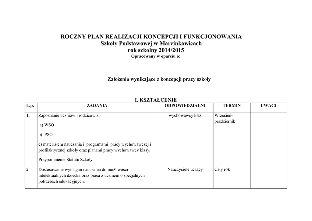 ROCZNY PLAN REALIZACJI KONCEPCJI I FUNKCJONOWANIA Szkoły Podstawowej w Marcinkowicach rok szkolny 2014/2015 Opracowany w oparciu o: Założenia wynikające z koncepcji pracy szkoły I. KSZTAŁCENIE L.p. 1. ZADANIA Zapoznanie uczniów i rodziców z: ODPOWIEDZIALNI TERMIN wychowawcy klas Wrzesieńpaździernik Nauczyciele uczący Cały rok a) WSO b) PSO c) materiałem nauczania i programami pracy wychowawczej i profilaktycznej szkoły oraz planami pracy wychowawcy klasy. Przypomnienie Statutu Szkoły. 2. Dostosowanie wymagań nauczania do możliwości intelektualnych dziecka oraz praca z uczniem o specjalnych potrzebach edukacyjnych: UWAGI - rewalidacja kl. IV, V - zajęcia logopedyczne kl. O – VI, 3. Weryfikacja i uszczegółowienie PSO. 4. Stworzenie uczniom możliwości poszerzania wiedzy, rozwijania umiejętności oraz wspomagania ich w indywidualnym rozwoju poprzez: a) udział w konkursach przedmiotowych, plastycznych, czytelniczych, językowych, z zakresu bezpieczeństwa, zdrowotnych, ekologicznych i zawodach na szczeblu szkolnym, gminnym, wojewódzkim, ogólnopolskim; Nauczyciele przedmiotów, Wychowawcy klas, b) uczestnictwo w uroczystościach, apelach szkolnych i pozaszkolnych (wg harmonogramu ); nauczyciele prowadzący koła zainteresowań c) opracowanie planów pracy kół zainteresowań 5. nauczyciele uczący Cały rok przewodniczący zespołów nauczycieli wszyscy nauczyciele opiekunowie kół Badanie wyników nauczania: nauczyciele uczący a) Sporządzenie raportu ze sprawdzianu zewnętrznego klas VI; b) Udział uczniów klasy III w ogólnopolskim Badaniu Umiejętności wychowawca Rozpoznanie potrzeb klasy objętej badaniem, analiza wyników uczniów, sporządzenie sprawozdań. wrzesień przewodniczący zespołu nauczycieli Wg harmonogramu 6. Wyrównywanie szans edukacyjnych organizacja: zajęć dydaktyczno – wyrównawczych, praca z uczniem mającym trudności w nauce podczas lekcji. nauczyciel uczący wrzesień pedagog 7. Realizacja innowacyjnego programu nauczania w klasach pierwszych pt. „Mały Człowiek-Wielki Start” nauczyciele uczący Cały rok 8. Wstępne diagnozowanie uczniów: Nauczyciele uczący w klasach czwartych Wrzesień październik a) Testy „na wejście” w kl. IV i I 9. Diagnozowanie osiągnięć edukacyjnych w klasach I-VI. nauczyciele uczący Styczeń, maj 10. Współpraca z PPP, konsultacje ze specjalistami PPP: Nauczyciele uczący Wg potrzeb a) Kierowanie uczniów na badania; pedagog szkolny b) Wykorzystanie opinii i orzeczeń w pracy z uczniami; 11. 12. Dostosowanie oferty edukacyjnej zarówno dla uczniów zdolnych jak i mających trudności w nauce. Organizacja zajęć pozalekcyjnych i kół zainteresowań w ramach art.42 KN oraz EFS ,,Główka pracuje’’. Udzielanie pomocy uczniom o specjalnych potrzebach edukacyjnych z udziałem specjalistów tj. logopedy, pedagoga i psychologa. nauczyciele uczący Wrzesień dyrektor Cały rok logopeda Cały rok pedagog psycholog 13. 14. wychowawca klasy Unowocześnianie i wzbogacanie oferty dydaktycznej: wykorzystanie komputera i programów multimedialnych na nauczyciele uczący różnych przedmiotach. Korzystanie z platformy edukacyjnej FRONTER Analiza wyników i efektów nauczania w poszczególnych klasach. wychowawca klasy przewodniczący zespołu nauczycieli nauczyciele uczący 15. Monitorowanie realizacji podstawy programowej oraz nieobecności uczniów. listopad styczeń kwiecień czerwiec wychowawca klasy listopad przewodniczący zespołu nauczycieli styczeń nauczyciele uczący 16 Cały rok Nauczyciele uczący kwiecień czerwiec Cały rok Wykorzystanie w pracy na lekcji elementów oceniania kształtującego 17. Wspieranie rozwoju dziecka młodszego w związku z obniżeniem nauczyciele uczący w wieku realizacji obowiązku – przestrzeganie zalecanych edukacji przedszkolnej warunków i sposobów realizacji podstawy programowej Cały rok Rozbudzanie u uczniów zainteresowań czytelniczych: - opracowanie programu pracy edukacji czytelniczej Nauczyciele bibliotekarze we współpracy z nauczycielami języka polskiego 18 Realizacja programu „Wspierania Uczniów Zdolnych” Psycholog, nauczyciele uczący 19. Realizacja Szkolnego Programu Podnoszenia Jakości Kształcenia Wicedyrektor nauczyciele Cały rok Cały rok II. WYCHOWANIE I PROFILAKTYKA L.p. ZADANIA ODPOWIEDZIALNI TERMIN 1. Realizacja działań określonych w programach pracy wychowawczej, profilaktycznej: Opracowanie planu wychowawczego i profilaktycznego na rok szkolny 2014/2015 Pedagog, psycholog we współpracy z zespołami zadaniowymi nauczycieli Wrzesień 2. 1.Promowanie zdrowego stylu życia: - udział w programie „WF z klasą”, nowatorskiej akcji edukacyjnej prowadzonej przez Centrum Edukacji Obywatelskiej, z medialnym wsparciem "Gazety Wyborczej" i portalu Sport.pl. Pedagog Cały rok Nauczyciele w-f i klas II-III UWAGI Udział w projekcie ogólnopolskim „Mały Mistrz” Wychowawcy klas pierwszych 3. Udział w programie „Sprawny Dolnoślązaczek” Wychowawcy kl. II-III Udział w projekcie „Bezpiecznik TAURONA” Wicedyrektor, nauczyciel techniki. Doskonalenie pracy Samorządu Uczniowskiego: wychowawcy klas opiekunowie SU a) Typowanie uczniów do SU; b)Przeprowadzenie wyborów; c) Opracowanie planu pracy SU; d) Wybór uczniów do Pocztu sztandarowego; Wrzesień zgodnie z harmonogramem, e) Organizowanie imprez szkolnych i klasowych wg harmonogramu. III. WSPÓŁPRACA ZE ŚRODOWISKIEM LOKALNYM – RODZICAMI, INSTYTUCJAMI I ORGANIZACJAMI L.p. ZADANIA ODPOWIEDZIALNI TERMIN 1. Opracowanie Szkolnego Programu Aktywnej Współpracy 2. Zorganizowanie warsztatów i pogadanek z udziałem specjalistów wychowawcy klas o charakterze psychologiczno - pedagogicznym i zdrowotnym. dyrektor Wg potrzeb Wdrożenie dziennika elektronicznego Dyrektor, administrator dziennika Wrzesieńpaździernik W spółudział rodziców w tworzeniu wewnątrzszkolnego prawa, Dyrekcja, wychowawcy klas Cały rok Wg harmonogramu 8. Zespół rodzice, uczniowie, nauc