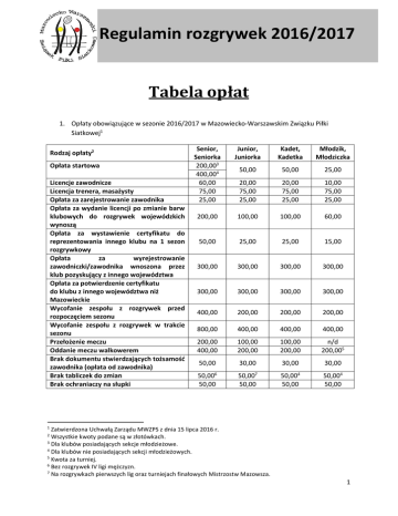 Regulamin rozgrywek 2016/2017 ~ Tabela opłat 1. Opłaty obowiązujące w sezonie 2016/2017 w Mazowiecko-Warszawskim Związku Piłki Siatkowej1 Rodzaj opłaty2 Opłata startowa Licencje zawodnicze Licencja trenera, masażysty Opłata za zarejestrowanie zawodnika Opłata za wydanie licencji po zmianie barw klubowych do rozgrywek wojewódzkich wynoszą Opłata za wystawienie certyfikatu do reprezentowania innego klubu na 1 sezon rozgrywkowy Opłata za wyrejestrowanie zawodniczki/zawodnika wnoszona przez klub pozyskujący z innego województwa Opłata za potwierdzenie certyfikatu do klubu z innego województwa niż Mazowieckie Wycofanie zespołu z rozgrywek przed rozpoczęciem sezonu Wycofanie zespołu z rozgrywek w trakcie sezonu Przełożenie meczu Oddanie meczu walkowerem Brak dokumentu stwierdzających tożsamość zawodnika (opłata od zawodnika) Brak tabliczek do zmian Brak ochraniaczy na słupki Senior, Seniorka 200,003 400,004 60,00 75,00 25,00 Junior, Juniorka Kadet, Kadetka Młodzik, Młodziczka 50,00 50,00 25,00 20,00 75,00 25,00 20,00 75,00 25,00 10,00 75,00 25,00 200,00 100,00 100,00 60,00 50,00 25,00 25,00 15,00 300,00 300,00 300,00 300,00 300,00 300,00 300,00 300,00 400,00 200,00 200,00 200,00 800,00 400,00 400,00 400,00 200,00 400,00 100,00 200,00 100,00 200,00 n/d 200,005 50,00 30,00 30,00 30,00 50,006 50,00 50,007 50,00 50,004 50,00 50,004 50,00 1 Zatwierdzona Uchwałą Zarządu MWZPS z dnia 15 lipca 2016 r. Wszystkie kwoty podane są w złotówkach. 3 Dla klubów posiadających sekcje młodzieżowe. 4 Dla klubów nie posiadających sekcji młodzieżowych. 5 Kwota za turniej. 6 Bez rozgrywek IV ligi mężczyzn. 7 Na rozgrywkach pierwszych lig oraz turniejach finałowych Mistrzostw Mazowsza. 2 1 Regulamin rozgrywek 2016/2017 ~ Stawki ekwiwalentu za wyszkolenie zawodniczki/zawodnika8 Brak obowiązkowego wyposażenia hali Brak obecności przedstawiciela na spotkaniu terminarzowym 6 000,00 10 000,00 5 000,00 3 000,00 50,00 50,00 50,00 50,00 250,00 250,00 250,00 250,00 2. Składka członkowska: - PLS, LSK – 2 000,00 - I Liga – 1 500,00 - II Liga – 800,00 - pozostałe kluby - 350,00 3. Licencja klubowa (opłata jednorazowa) – 350,00 4. Opłaty za zmianę barw klubowych oraz za Certyfikat PZPS do rozgrywek centralnych w wysokości 10% są wnoszone bezpośrednio do WZPS przez klub pozyskujący. WZPS pobiera przy wyrejestrowaniu lub potwierdzeniu wypożyczenia następujące opłaty:9 Rozgrywki Certyfikat PZPS Kluby MWZPS Pozostałe klubu Zmiana barw klubowych Kluby MWZPS Pozostałe klubu PLS,LSK I liga II liga 8 Kwota maksymalna. W sprawach zmiany barw klubowych zawodniczek i zawodników I i II ligi PZPS oraz zawodniczek do lat 18 i zawodników do lat 19 /reprezentantów Polski/ obowiązują przepisy PZPS. 9 Opłaty zostaną podane po zatwierdzeniu przez Zarząd PZPS Komunikatu Organizacyjnego na sezon 2016/2017. 2