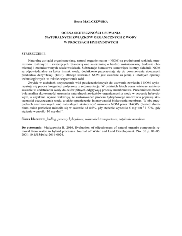 Beata MALCZEWSKA OCENA SKUTECZNOŚCI USUWANIA NATURALNYCH ZWIĄZKÓW ORGANICZNYCH Z WODY W PROCESACH HYBRYDOWYCH STRESZCZENIE Naturalne związki organiczne (ang. natural organic matter – NOM) są produktami rozkładu organizmów roślinnych i zwierzęcych. Stanowią one mieszaninę o bardzo zróżnicowanej budowie chemicznej i zróżnicowanych właściwościach. Substancje humusowe stanowiące istotny składnik NOM są odpowiedzialne za kolor i smak wody, dodatkowo przyczyniają się do powstawania ubocznych produktów dezynfekcji (DBP). Dlatego usuwanie NOM jest uważane za jedną z istotnych operacji technologicznych w trakcie oczyszczania wód. Zwykle w układach oczyszczania wód powierzchniowych do usuwania zawiesin i NOM wykorzystuje się proces koagulacji połączony z sedymentacją. W ostatnich latach coraz większe zainteresowanie w uzdatnianiu wody do celów pitnych odgrywają procesy membranowe. Przedmiotem badań była analiza skuteczności usuwania naturalnych związków organicznych z wody w procesie hybrydowym, a uzyskane wyniki wskazują, że zastosowanie procesu hybrydowego umożliwia poprawę skuteczności oczyszczania wody, a także ograniczenie intensywności blokowania membran. W obu przypadkach analizowanych wód naturalnych skuteczność usuwania NOM przez HAOPs (heated aluminium oxide particles) mieściła się w zakresie od 86%, gdy stężenie wynosiło 5 mg·dm–3 i 77%, gdy stężenie wynosiło 10 mg·dm–3. Słowa kluczowe: fouling, procesy hybrydowe, własności transportowe, zatykanie membran Do cytowania: Malczewska B. 2016. Evaluation of effectiveness of natural organic compounds removal from water in hybrid processes. Journal of Water and Land Development. No. 30 p. 81–85. DOI: 10.1515/jwld-2016-0024.