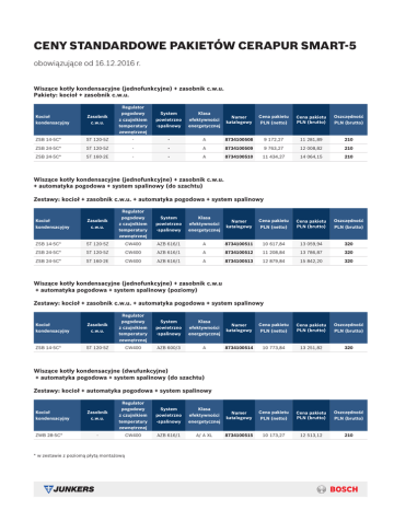 CENY STANDARDOWE PAKIETÓW CERAPUR SMART-5 obowiązujące od 16.12.2016 r. Wiszące kotły kondensacyjne (jednofunkcyjne) + zasobnik c.w.u. Pakiety: kocioł + zasobnik c.w.u. Kocioł kondensacyjny Zasobnik c.w.u. Regulator pogodowy z czujnikiem temperatury zewnętrznej ZSB 14-5C* ST 120-5Z - - A 8734100508 9 172,27 11 281,89 210 ZSB 24-5C* ST 120-5Z - - A 8734100509 9 763,27 12 008,82 210 ZSB 24-5C* ST 160-2E - - A 8734100510 11 434,27 14 064,15 210 System powietrzno -spalinowy Klasa efektywności energetycznej Numer katalogowy Cena pakietu PLN (netto) Cena pakietu PLN (brutto) Oszczędność PLN (brutto) Wiszące kotły kondensacyjne (jednofunkcyjne) + zasobnik c.w.u. + automatyka pogodowa + system spalinowy (do szachtu) Zestawy: kocioł + zasobnik c.w.u. + automatyka pogodowa + system spalinowy Kocioł kondensacyjny Zasobnik c.w.u. Regulator pogodowy z czujnikiem temperatury zewnętrznej ZSB 14-5C* ST 120-5Z CW400 AZB 616/1 A 8734100511 10 617,84 13 059,94 320 ZSB 24-5C* ST 120-5Z CW400 AZB 616/1 A 8734100512 11 208,84 13 786,87 320 ZSB 24-5C* ST 160-2E CW400 AZB 616/1 A 8734100513 12 879,84 15 842,20 320 System powietrzno -spalinowy Klasa efektywności energetycznej Numer katalogowy Cena pakietu PLN (netto) Cena pakietu PLN (brutto) Oszczędność PLN (brutto) Wiszące kotły kondensacyjne (jednofunkcyjne) + zasobnik c.w.u + automatyka pogodowa + system spalinowy (poziomy) Zestawy: kocioł + zasobnik c.w.u. + automatyka pogodowa + system spalinowy Kocioł kondensacyjny Zasobnik c.w.u. Regulator pogodowy z czujnikiem temperatury zewnętrznej ZSB 14-5C* ST 120-5Z CW400 System powietrzno -spalinowy Klasa efektywności energetycznej Numer katalogowy Cena pakietu PLN (netto) Cena pakietu PLN (brutto) Oszczędność PLN (brutto) AZB 600/3 A 8734100514 10 773,84 13 251,82 320 Wiszące kotły kondensacyjne (dwufunkcyjne) + automatyka pogodowa + system spalinowy (do szachtu) Zestawy: kocioł + automatyka pogodowa + system spalinowy Kocioł kondensacyjny ZWB 28-5C* Zasobnik c.w.u. Regulator pogodowy z czujnikiem temperatury zewnętrznej System powietrzno -spalinowy Klasa efektywności energetycznej Numer katalogowy Cena pakietu PLN (netto) Cena pakietu PLN (brutto) Oszczędność PLN (brutto) - CW400 AZB 616/1 A/ A XL 8734100515 10 173,27 12 513,12 210 * w zestawie z poziomą płytą montażową