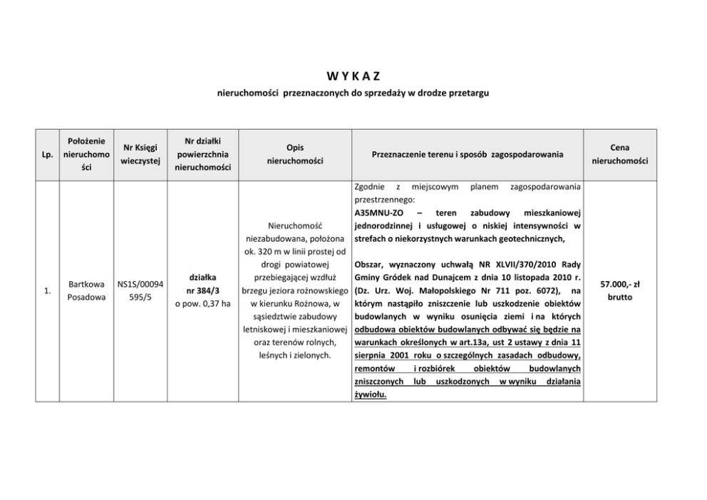 WYKAZ nieruchomości przeznaczonych do sprzedaży w drodze przetargu Lp. 1. Położenie nieruchomo ści Bartkowa Posadowa Nr Księgi wieczystej NS1S/00094 595/5 Nr działki powierzchnia nieruchomości działka nr 384/3 o pow. 0,37 ha Opis nieruchomości Nieruchomość niezabudowana, położona ok. 320 m w linii prostej od drogi powiatowej przebiegającej wzdłuż brzegu jeziora rożnowskiego w kierunku Rożnowa, w sąsiedztwie zabudowy letniskowej i mieszkaniowej oraz terenów rolnych, leśnych i zielonych. Przeznaczenie terenu i sposób zagospodarowania Cena nieruchomości Zgodnie z miejscowym planem zagospodarowania przestrzennego: A35MNU-ZO – teren zabudowy mieszkaniowej jednorodzinnej i usługowej o niskiej intensywności w strefach o niekorzystnych warunkach geotechnicznych, Obszar, wyznaczony uchwałą NR XLVII/370/2010 Rady Gminy Gródek nad Dunajcem z dnia 10 listopada 2010 r. (Dz. Urz. Woj. Małopolskiego Nr 711 poz. 6072), na którym nastąpiło zniszczenie lub uszkodzenie obiektów budowlanych w wyniku osunięcia ziemi i na których odbudowa obiektów budowlanych odbywać się będzie na warunkach określonych w art.13a, ust 2 ustawy z dnia 11 sierpnia 2001 roku o szczególnych zasadach odbudowy, remontów i rozbiórek obiektów budowlanych zniszczonych lub uszkodzonych w wyniku działania żywiołu. 57.000,- zł brutto Działka nr 575/4 o pow. 0,09 ha 2. 3. Bartkowa Posadowa Tropie Nieruchomość niezabudowana, położona jest ok. 50 m od drogi oraz wojewódzkiej przebiegającej wzdłuż - udział 1/7 cz. w NS1S/00049 dz. nr 653/8 brzegu jeziora 137/7 pow. 0,10 ha i rożnowskiego, w - udział ¼ cz. w sąsiedztwie zabudowy dz. 653/9 o pow. letniskowej i mieszkaniowej oraz terenów rolnych, 0,02 ha stanowiących leśnych i zielonych. drogę dojazdową Zgodnie z miejscowym planem zagospodarowania przestrzennego: A64MNU-ZO – teren zabudowy mieszkaniowej jednorodzinnej i usługowej o niskiej intensywności w strefach o niekorzystnych warunkach geotechnicznych. Obszar, wyznaczony uchwałą NR XLVII/370/2010 Rady Gminy Gródek nad Dunajcem z dnia 10 listopada 2010 r. (Dz. Urz. Woj. Małopolskiego Nr 711 poz. 6072), na którym nastąpiło zniszczenie lub uszkodzenie obiektów budowlanych w wyniku osunięcia ziemi i na których odbudowa obiektów budowlanych odbywać się będzie na warunkach określonych w art.13a, ust 2 ustawy z dnia 11 sierpnia 2001 roku o szczególnych zasadach odbudowy, remontów i rozbiórek obiektów budowlanych zniszczonych lub uszkodzonych w wyniku działania żywiołu. 21.000,- zł brutto Zgodnie z miejscowym planem zagospodarowania przestrzennego: częściowo K63MNU-ZO – teren zabudowy mieszkaniowej jednorodzinnej i usługowej o niskiej intensywności w Nieruchomość strefach o niekorzystnych warunkach geotechnicznych. niezabudowana, położona Z uwagi na podjętą wykazaną poniżej uchwałę jest ok. 250 m od drogi NS1S/00013 Działka nr 143/1 na nieruchomości obowiązuje zakaz budowy nowych powiatowej, w sąsiedztwie 18.000,- zł brutto 202/5 o pow. 0,30 ha budynków, odbudowy oraz rozbudowy, przebudowy i zabudowy mieszkaniowej, nadbudowy istniejących budynków, kierując się potrzebą terenów rolnych, zielonych zapewnienia bezpieczeństwa ludzi i mienia. i leśnych. Obszar Nr 1210032-30, wyznaczony uchwałą nr XLVII/371/2010 Rady Gminy Gródek nad Dunajcem (Dz. Urzędowy woj. Małopolskiego nr 195, poz. 1279), wpisany do rejestru o którym mowa w art. 13b ustawy z dnia 11 sierpnia 2001 roku o szczególnych zasadach odbudowy, remontów i rozbiórek obiektów budowlanych zniszczonych lub uszkodzonych w wyniku działania żywiołu (Dz. U. z 2001 r. nr 84, poz. 906, zm. Dz. U. z 2010 r. nr 149, poz. 996), na którym obowiązuje zakaz budowy nowych budynków, odbudowy oraz rozbudowy, przebudowy i nadbudowy istniejących budynków, kierując się potrzebą zapewnienia bezpieczeństwa ludzi i mienia częściowo o symbolu - KDW droga wewnętrzna 4. Zbyszyce NS1S/00134 931/6 Działka nr 4 o pow. 0,44 ha Zgodnie z miejscowym planem zagospodarowania przestrzennego: Nieruchomość o atrakcyjnej - częściowo o symbolu L7 Lz - tereny zadrzewień widokowo lokalizacji, nad przeznaczone do utrzymania brzegiem Dunajca, poniżej - częściowo o symbolu L9RP - OS- tereny drogi publicznej rolne (grunty orne, sady, łąki i pastwiska) w strefach osuwiskowych 55.000,- zł brutto Termin do złożenia wniosku przez osoby, którym przysługuje pierwszeństwo w nabyciu nieruchomości, na podstawie art. 34 ust. 1 pkt 1 i pkt 2 ustawy z dnia 21 sierpnia 1997 r. o gospodarce nieruchomościami (tekst jedn. Dz.U. z 2010 r. Nr 102, poz. 651 z późn. zm.), wynosi 6 tygodni licząc od dnia wywieszenia niniejszego wykazu. Gródek n/Dunajcem dn. 10.12.2013r Wywieszono na tablicy ogłoszeń na okres 21 dni.