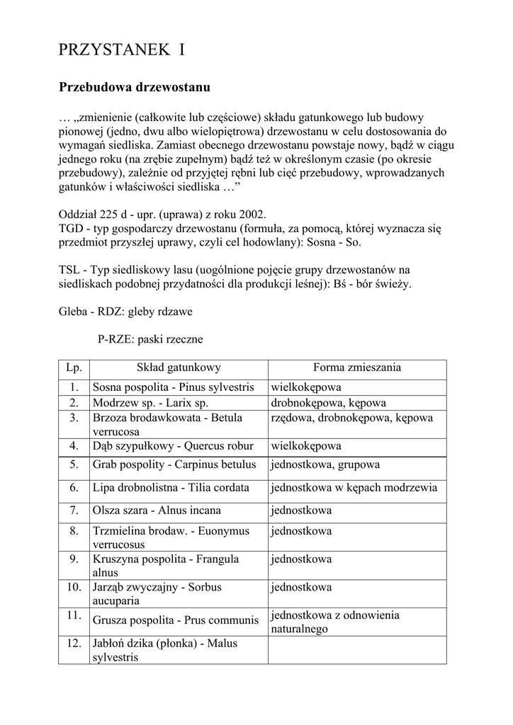 PRZYSTANEK I Przebudowa drzewostanu … „zmienienie (całkowite lub częściowe) składu gatunkowego lub budowy pionowej (jedno, dwu albo wielopiętrowa) drzewostanu w celu dostosowania do wymagań siedliska. Zamiast obecnego drzewostanu powstaje nowy, bądź w ciągu jednego roku (na zrębie zupełnym) bądź też w określonym czasie (po okresie przebudowy), zależnie od przyjętej rębni lub cięć przebudowy, wprowadzanych gatunków i właściwości siedliska …” Oddział 225 d - upr. (uprawa) z roku 2002. TGD - typ gospodarczy drzewostanu (formuła, za pomocą, której wyznacza się przedmiot przyszłej uprawy, czyli cel hodowlany): Sosna - So. TSL - Typ siedliskowy lasu (uogólnione pojęcie grupy drzewostanów na siedliskach podobnej przydatności dla produkcji leśnej): Bś - bór świeży. Gleba - RDZ: gleby rdzawe P-RZE: paski rzeczne Lp. 1. 2. 3. Skład gatunkowy Forma zmieszania wielkokępowa drobnokępowa, kępowa rzędowa, drobnokępowa, kępowa 4. Sosna pospolita - Pinus sylvestris Modrzew sp. - Larix sp. Brzoza brodawkowata - Betula verrucosa Dąb szypułkowy - Quercus robur 5. Grab pospolity - Carpinus betulus jednostkowa, grupowa 6. Lipa drobnolistna - Tilia cordata jednostkowa w kępach modrzewia 7. Olsza szara - Alnus incana jednostkowa 8. Trzmielina brodaw. - Euonymus verrucosus 9. Kruszyna pospolita - Frangula alnus 10. Jarząb zwyczajny - Sorbus aucuparia 11. Grusza pospolita - Prus communis 12. Jabłoń dzika (płonka) - Malus sylvestris wielkokępowa jednostkowa jednostkowa jednostkowa jednostkowa z odnowienia naturalnego Ognisko biocenotyczne pow. 0,10 ha (około 3% pow. zakładanej uprawy). Skład gatunkowy: 1. Kruszyna pospolita - Frangula alnus 2. Jarząb zwyczajny - Sorbus aucuparia 3. Bez koralowy - Sambucus racemosa 4. Bez czarny - Sambucus nigra 5. Klon jawor - Acer pseudoplatanus Ramowe formy zmieszania: - jednostkowe, - grupowe - po kilka lub kilkanaście sztuk, - drobnokępowe - o powierzchni do 5 arów, - kępowe - o powierzchni od 5 do 10 arów, - wielokępowe - powyżej 10 arów, - pasowe - najczęściej 3-6 rzędów, - smugowe PRZYSTANEK II Wprowadzenie podszytu Podszyt - drzewa lub krzewy stale znajdujące się w dolnej warstwie drzewostanu, spełniające rolę pielęgnacyjną i nie rokujące nadziei na przejście do warstw wyższych. Na siedliskach ubogich, gdzie wskutek niedoboru związków pokarmowych i wody, gatunki drzewiaste mają niewielkie szanse wytworzenia dolnego piętra drzewostanu, tworzy się warstwę podszytową w formie kęp (powierzchnia od 0,05 do 0,10 ha) złożoną z gatunków o małych wymaganiach glebowych i wodnych jak: jałowiec, kruszyna pospolita, głóg oraz z krzewów i krzewinek, roślin motylkowych - wiążących azot z powietrza jak: janowiec, szczodrzeniec, a także z drzew o szerokiej amplitudzie ekologicznej zdolnych do trwania w formach krzewiastych jak: olsza szara, jarząb, dąb bezszypułkowy, lipa drobnolistna. Łączna powierzchnia kęp podszytów na ubogich siedliskach nie powinna przekraczać 50% powierzchni danego wydzielenia ze względu na potrzebę ochrony światłolubnych gatunków runa leśnego. Liczba wprowadzanych sadzonek powinna wynosić 2-2,5 tys. sztuk/ha w formie kęp i płatów z wykorzystaniem mikrosiedlisk. Formy wzrostowe roślin drzewiastych 1. Drzewa - są roślinami okazałymi osiągającymi nieraz bardzo znaczne wysokości. Część nadziemna jest wyraźnie zróżnicowana na prosto wznoszącą się ku górze oś główną zwaną pniem. Nadziemną część u drzew liściastych nazywamy kłodą, natomiast drzew iglastych, jak również u olszy, strzałą. 2. Krzewy - nie osiągają dużych rozmiarów, nie mają pnia i rozgałęziają się zazwyczaj już od powierzchni ziemi wskutek wytwarzania nowych pędów z szyi korzeniowej lub z korzeni. W wyniku silnego rozrostu pędów bocznych, w dalszym okresie rozwoju zatraca się charakter osi głównej. Wyrośnięte krzewy nie są przeważnie zróżnicowane na pień i koronę. Wysokość krzewów dochodzi do 5m. Krzewy wyższe ponad 5m należą do rzadkości. 3. Krzewinki - są bardzo niskimi krzewami, często płożącymi się po ziemi, rzadziej wznoszącymi się ku górze do wysokości 20 - 50 cm np.: wrzos pospolity, borówka czernica, borówka brusznica. 4. Podkrzewy (półkrzewy) - mają zdrewniałe tylko dolne części pędów, natomiast górne nie drewnieją i pod koniec okresu wegetacyjnego obumierają. Podkrzewy (szczodrzeniec, janowiec) stanowią formy przejściowe od roślin zielonych do krzewów. Oddział 225 n Sosna - 65 lat, powierzchnia 1,49 ha. TGD - typ gospodarczy drzewostanu: So (sosna) TSL - typ siedliskowy lasu: Bśw Gleba: typ gleby: RDZ - gleby rdzawe gatunek gleby: P-RZE - piaski rzeczne Skład gatunkowy podszytu występującego na 60% powierzchni pododdziału 1. Dąb czerwony (dąb północny) - Quercus rubra. 2. Czeremcha amerykańska - Padus serotina. 3. Lipa drobnolistna - Tilia cordata. 4. Kruszyna pospolita - Frangula alnus. 5. Jałowiec pospolity - Juniperus communis. PRZYSTANEK III Przebudowa drzewostanów w I strefie słabych uszkodzeń spowodowanych przez emisję pyłów i gazów. Sosna czarna - gatunek odporny na zanieczyszczenia przemysłowe. Drzewostany pozostające pod ujemnym wpływem emisji przemysłowych podlegają przebudowie. Na powierzchniach, które zostały przeznaczone do przebudowy, wprowadza się gatunki drzew i krzewów odpornych na występujący rodzaj zanieczyszczeń. Jednym z gatunków drzew iglastych najbardziej odpornych na przemysłowe zanieczyszczenia powietrza jest sosna czarna - Pinus nigra. Sosna czarna - Pinus nigra - drzewo osiągające wysokość 20 - 40 m, rzadko 50. Igły sztywne po 2 w pączku, grube i długie (8-15 cm), piłkowane, ciemnozielone, słabo błyszczące lub matowe. Trwałość igieł od 4 do 8 lat. Na nizinach kwitnie w maju; nasiona dojrzewają jesienią drugiego roku. Szyszki jajowate (5-8 cm długości), zwykle symetryczne, zebrane po 2-4 prawie siedzące; o