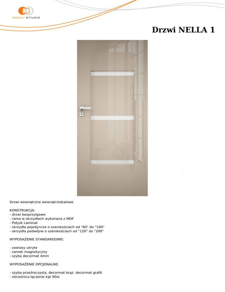 Drzwi NELLA 1 Drzwi wewnętrzne wewnątrzlokalowe KONSTRUKCJA: - drzwi bezprzylgowe - rama w skrzydłach wykonana z MDF - Połysk Laminat - skrzydła pojedyncze o szerokościach od "60" do "100" - skrzydła podwójne o szerokościach od "120" do "200" WYPOSAŻENIE STANDARDOWE: - zawiasy ukryte - zamek magnetyczny - szyba decormat 4mm WYPOSAŻENIE OPCJONALNE: - szyba przeźroczysta, decormat brąz. decormat grafit - ościeżnica łączenie kąt 90st KOLORYSTYKA: - bianco płysk - magnolia połysk - moro połysk - cubanit połysk metalik - gabbiano połysk metalik - bingo połysk matalik