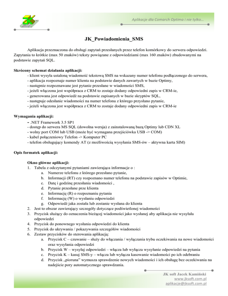 Aplikacje dla Comarch Optima i nie tylko… JK_Powiadomienia_SMS Aplikacja przeznaczona do obsługi zapytań przesłanych przez telefon komórkowy do serwera odpowiedzi. Zapytania to krótkie (max 50 znaków) teksty powiązane z odpowiedziami (max 160 znaków) zbudowanymi na podstawie zapytań SQL. Skrócony schemat działania aplikacji: - klient wysyła ustaloną wiadomość tekstową SMS na wskazany numer telefonu podłączonego do serwera, - aplikacja rozpoznaje numer klienta na podstawie danych zawartych w bazie Optimy, - następnie rozpoznawane jest pytanie przesłane w wiadomości SMS, - jeŜeli włączona jest współpraca z CRM to zostaje dodany odpowiedni zapis w CRM-ie, - generowana jest odpowiedź na podstawie zapisanych w bazie skryptów SQL, - następuje odesłanie wiadomości na numer telefonu z którego przysłano pytanie, - jeŜeli włączona jest współpraca z CRM to zostaje dodany odpowiedni zapis w CRM-ie Wymagania aplikacji: - .NET Framework 3.5 SP1 - dostęp do serwera MS SQL (dowolna wersja) z zainstalowaną bazą Optimy lub CDN XL - wolny port COM lub USB (moŜe być wymagana przejściówka USB -> COM) - kabel połączeniowy Telefon -> Komputer PC - telefon obsługujący komendy AT (z moŜliwością wysyłania SMS-ów – aktywna karta SIM) Opis formatek aplikacji: Okno główne aplikacji: 1. Tabela z odczytanymi pytaniami zawierająca informacje o : a. Numerze telefonu z którego przesłano pytanie, b. Informacji (RT) czy rozpoznano numer telefonu na podstawie zapisów w Optimie, c. Datę i godzinę przesłania wiadomości , d. Pytanie przesłane prze klienta e. Informację (R) o rozpoznaniu pytania f. Informację (W) o wysłaniu odpowiedzi g. Odpowiedź jaka została lub zostanie wysłana do klienta 2. Jest to obszar zawierający szczegóły dotyczące podświetlonej wiadomości 3. Przycisk słuŜący do oznaczenia bieŜącej wiadomości jako wysłanej aby aplikacja nie wysyłała odpowiedzi 4. Przycisk do ponownego wysłania odpowiedzi do klienta 5. Przycisk do ukrywania / pokazywania szczegółów wiadomości 6. Zestaw przycisków do sterowania aplikacją: a. Przycisk C – czuwanie – słuŜy do włączania / wyłączania trybu oczekiwania na nowe wiadomości oraz wysyłania odpowiedzi b. Przycisk W – wysyłaj odpowiedzi – włącza lub wyłącza wysyłanie odpowiedzi na pytania c. Przycisk K – kasuj SMS-y – włącza lub wyłącza kasowanie wiadomości po ich odebraniu d. Przycisk „pioruna” wymusza sprawdzenie nowych wiadomości i ich obsługę bez oczekiwania na nadejście pory automatycznego sprawdzania. JK soft Jacek Kamiński www.jksoft.com.pl [email protected] Aplikacje dla Comarch Optima i nie tylko… 7. Panel przycisków umoŜliwiający: a. Wyświetlenie pomocy do aplikacji, b. Przejście do okna konfiguracji aplikacji, c. Wysłanie poczty do producenta aplikacji, d. Sprawdzenie czy dostępna jest nowa wersja posiadanej aplikacji i pobranie aktualizacji, e. Sprawdzenie informacji o udzielonej licencji. Okno konfiguracji. 1. Obszar konfiguracji portu COM przeznaczonego do komunikacji komputera z telefonem komórkowym. Przycisk „pioruna” umoŜliwia przetestowanie dostępności portu COM. 2. Ramka testowania poprawności konfiguracji aplikacji – umoŜliwia wysłanie SMS-a testowego. 3. Część formatki przeznaczona do ustalenia czy aplikacja ma współpracować z modułem CRM CDN Optima lub CDN XL. 4. Tabela zawierająca pytania i udzielane na nie odpowiedzi oraz informację czy pytanie jest aktywne. 5. Obszar przeznaczony do definiowania pytań i odpowiedzi. • Pytania są tekstem o długości maksymalnej nie większej niŜ 50 znaków. • Odpowiedzi są zapytaniami MS SQL i muszą zwracać wartość tekstową. Odpowiedź nie pmoŜe przekraczać 160 znaków. JK soft Jacek Kamiński www.jksoft.com.pl [email protected] Aplikacje dla Comarch Optima i nie tylko… Udostępnione makra do wykorzystania w zapytaniach SQL: UWAGA ! makra muszą być pisane drukowanymi literami. - @TABELA - nazwa tabeli z przedrostkiem (np. CDN.TraNag) - @TELEFON - numer telefonu pobierany z podświetlonej aktualnie pozycji - @KNTID - numer ID kontrahenta z @TABELA Przykład: CONVERT(nvarchar(30), GETDATE(), 120) + ' knt_kntid=@KNTID) kod kontrahenta : ' + (select top(1) Knt_kod from @TABELA where Aplikacja w wersji DEMO dostępna jest pod adresem : ftp://ftp.jksoft.com.pl/Aplikacje_JKsoft/JK_Powiadomienia_SMS.7z Wszelkie pytania i sugestie proszę kierować na adres : [email protected] JK soft Jacek Kamiński www.jksoft.com.pl [email protected]