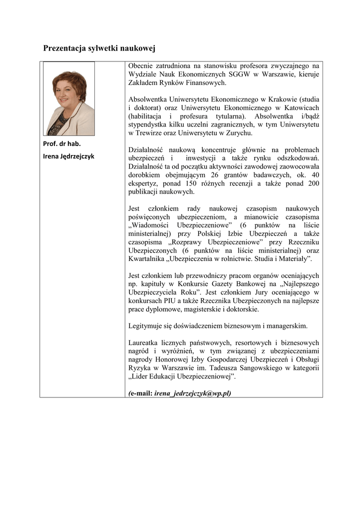 Prezentacja sylwetki naukowej Obecnie zatrudniona na stanowisku profesora zwyczajnego na Wydziale Nauk Ekonomicznych SGGW w Warszawie, kieruje Zakładem Rynków Finansowych. Absolwentka Uniwersytetu Ekonomicznego w Krakowie (studia i doktorat) oraz Uniwersytetu Ekonomicznego w Katowicach (habilitacja i profesura tytularna). Absolwentka i/bądź stypendystka kilku uczelni zagranicznych, w tym Uniwersytetu w Trewirze oraz Uniwersytetu w Zurychu. Prof. dr hab. Irena Jędrzejczyk Działalność naukową koncentruje głównie na problemach ubezpieczeń i inwestycji a także rynku odszkodowań. Działalność ta od początku aktywności zawodowej zaowocowała dorobkiem obejmującym 26 grantów badawczych, ok. 40 ekspertyz, ponad 150 różnych recenzji a także ponad 200 publikacji naukowych. Jest członkiem rady naukowej czasopism naukowych poświęconych ubezpieczeniom, a mianowicie czasopisma „Wiadomości Ubezpieczeniowe” (6 punktów na liście ministerialnej) przy Polskiej Izbie Ubezpieczeń a także czasopisma „Rozprawy Ubezpieczeniowe” przy Rzeczniku Ubezpieczonych (6 punktów na liście ministerialnej) oraz Kwartalnika „Ubezpieczenia w rolnictwie. Studia i Materiały”. Jest członkiem lub przewodniczy pracom organów oceniających np. kapituły w Konkursie Gazety Bankowej na „Najlepszego Ubezpieczyciela Roku”. Jest członkiem Jury oceniającego w konkursach PIU a także Rzecznika Ubezpieczonych na najlepsze prace dyplomowe, magisterskie i doktorskie. Legitymuje się doświadczeniem biznesowym i managerskim. Laureatka licznych państwowych, resortowych i biznesowych nagród i wyróżnień, w tym związanej z ubezpieczeniami nagrody Honorowej Izby Gospodarczej Ubezpieczeń i Obsługi Ryzyka w Warszawie im. Tadeusza Sangowskiego w kategorii „Lider Edukacji Ubezpieczeniowej”. (e-mail: [email protected])