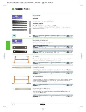 startDoc-77341-16807[467-486].qxp:STEP-Muster 30.06.2009 11:45 Uhr Seite 476 Narzędzia ręczne Nóż dwustronny Centro-Star do maszyn stacjonarnych · pakowane po 4 sztuki Właściwości produktu: jakość HS, stal szybkotnąca wysokiej jakości (HSS) zastosowanie do systemu szybkiego mocowania Centro-Star do szybkiej i prostej zmiany noża (bez śrub naprężnych) Nr art. Szerokość mm Długość mm 40 00 837 204 12 520 Grubość mm 2,7 Jakość HS JS 4 EUR 42,70 KO H593 Jednokierunkowy nóż nawrotny do maszyn ciesielskich · pakowane po 2 sztuki Standard: hartowana stal narzędziowa Nr art. Pasuje do 40 00 837 320 Scheppach hms 320 mm 320 x 19 x 1 JS 2 EUR 6,55 KO H593 Nr art. Pasuje do 40 00 837 306 Elektra HC 260, Multi 260 S, Scheppach mm 260 x 19 x 1 JS 2 EUR 13,85 KO H593 Piła ramowa Ulmer Form (owalny kształt uchwytu) · naprężenie drutu · wypolerowane ramiona i rożek · brzeszczot ze szwedzkiej stali · zęby grube, rozwarte i szlifowane Nr art. Długość brzeszczota mm 40 00 814 470 700 Szerokość brzeszczota mm 40 JS 1 EUR 19,25 KO F591 Brzeszczot piły ramowej ze stali elektrycznej · podana długość od otworu chwytu do otworu chwytu · grube zęby Nr art. Długość brzeszczota mm 40 00 814 477 700 Szerokość brzeszczota mm 40 JS 1 EUR 4,35 KO F591 Piła stolarska ramowa szerokość taśmy 40 mm · Ulmer Form (owalny kształt uchwytu) · naprężenie drutu · wypolerowane ramiona i rożek · brzeszczot ze szwedzkiej stali · zęby rozwarte i szlifowane · z mocnym chwytem · drobne zęby Nr art. Długość brzeszczota mm 40 00 814 473 700 JS 1 EUR 19,25 KO F591 Brzeszczot do piły stolarskiej ramowej Szerokość taśmy 40 mm · ze stali elektrycznej · podana długość od otworu chwytu do otworu chwytu · drobne zęby Nr art. Długość brzeszczota mm 40 00 814 480 700 5 / 476 Szerokość brzeszczota mm 40 JS 1 EUR 4,35 KO F591 startDoc-77341-16807[467-486].qxp:STEP-Muster 26.06.2009 16:49 Uhr Seite 477 Narzędzia ręczne Piła kabłąkowa wysokojakościowa rama rurowa ze stali · lakierowana · dźwignia napinająca z elementem ochronnym dla rąk · z hartowanymi zębami · brzeszczot przystosowany do cięcia miękkiego i półmokrego Nr art. Długość brzeszczota mm 40 00 814 345 610 40 00 814 346 762 JS 1 1 EUR 11,40 10,95 KO F591 F591 Piła kabłąkowa kabłąk z owalnej stalowej rury · lakierowany · z dźwignią zaciskową · tarcza ze stopu stali szlachetnej · hartowane końce zębów Nr art. 40 00 814 333 40 00 814 334 40 00 814 335 40 00 814 336 Długość brzeszczota mm 533 610 762 914 JS 1 1 1 1 EUR 4,95 5,10 5,30 5,90 KO C592 C592 C592 C592 Brzeszczot piły kabłąkowej ze stali o wysokiej jakości · bardzo mocno hartowane końce zębów · cztery szlifowane krzyżowo zęby ostrza i jeden ząb żłobikowy Nr art. 40 00 814 368 40 00 814 369 40 00 814 370 40 00 814 371 Długość brzeszczota mm 533 610 762 914 JS 1 1 1 1 EUR 1,43 1,49 1,65 2,26 KO C592 C592 C592 C592 Brzeszczot piły kabłąkowej szwedzka stal specjalna · szczególnie mocno hartowane końcówki zębów · grupy po 4 krzyżowo szlifowanych zębów tnących · tnie równomiernie, czysto i szybko · nadaje się do drewna suchego Nr art. 40 00 814 380 40 00 814 385 40 00 814 387 Szerokość brzeszczota mm 20 20 20 Długość brzeszczota mm 533 762 914 JS 1 1 1 EUR 2,35 2,65 3,00 KO G592 G592 G592 Brzeszczot piły kabłąkowej szwedzka stal specjalna · szczególnie mocno hartowane końcówki zębów · 4 krzyżowo szlifowane zęby tnące i ząb strugający · nadaje się do szybkiego cięcia · szerokie cięcie · do drewna mokrego i bardzo świeżego Nr art. 40 00 814 374 40 00 814 375 40 00 814 376 40 00 814 378 Szerokość brzeszczota mm 20 20 20 20 Długość brzeszczota mm 533 610 762 914 JS 1 1 1 1 EUR 2,50 2,55 2,65 2,85 KO G592 G592 G592 G592 Piła ręczna brzeszczot ze stali elektrycznej · z rozwartymi zębami, naostrzona · uchwyt drewniany w naturalnym kolorze lakierowany · z 2 niklowanymi nitami · z zamkniętym uchwytem Nr art. 40 00 814 232 40 00 814 233 40 00 814 234 Długość brzeszczota mm 350 400 500 JS 1 1 1 EUR 7,25 7,25 8,85 KO B591 B591 B591 5 / 477 startDoc-77341-16807[467-486].qxp:STEP-Muster 26.06.2009 16:49 Uhr Seite 478 Narzędzia ręczne Piła ręczna brzeszczot z taśmy stalowej szlachetnej · specjalnie hartowane i szlifowane zęby · najwyższa siła tnąca · z ergonomicznym uchwytem z tw. szt. · z osłoną na zęby Nr art. Długość brzeszczota mm 40 00 814 255 450 40 00 814 259 350 JS 1 1 EUR 10,60 9,25 KO B591 B591 Piła ręczna z 2-komponentowym komfortowym uchwytem · specjalne drobne uzębienie ·przeszlifowana · zęby dodatkowo hartowane indukcyjnie · do drewna, metali nieżelaznych, aluminium i tw. szt. cienkościennych · z osłoną na zęby Cechy szczególne: dzięki niewielkim rozmiarom piła zmieści się do każdej skrzynki narzędziowej Nr art. Długość brzeszczota mm 40 00 814 252 350 JS 1 EUR 12,05 KO B591 Piła ręczna z komfortowym uchwytem 2-komponentowym · ząb uniwersalny 7 zębów/" · przeszlifowanie · uzębienie dodatkowo hartowane indukcyjnie · z szyną zabezpieczającą zęby Nr art. Długość brzeszczota mm 40 00 814 254 450 40 00 814 258 550 JS 1 1 EUR 15,25 17,95 KO B591 B591 Piła ręczna innowacyjna geometria zębów i specjalny szlif umożliwiają do 50% szybszą pracę i około 100% dłuższą żywotność · mocny brzeszczot zapewnia cięcie bez wibracji · przesunięta oprawa gwarantuje optymalne przenoszenie siły i znacznie mniejszy nakład sił · hartowane końcówki zębów · komfortowy uchwyt z kątownikiem 45° i 90° Nr art. Długość brzeszczota mm 40 00 814 287 475 JS 1 EUR 26,95 KO L507 Piła ręczna z 2-komponentową ergonomiczną oprawą · nadaje się szczególnie do średnio grubych materiałów, zwłaszcza do drewna budowlanego, sklejki i płyt wiórowych · ostre uzębienie szlifowane z trzech stron zapewnia szybkie cięcie · hartowane końcówki zębów gwarantują ich długotrwał
