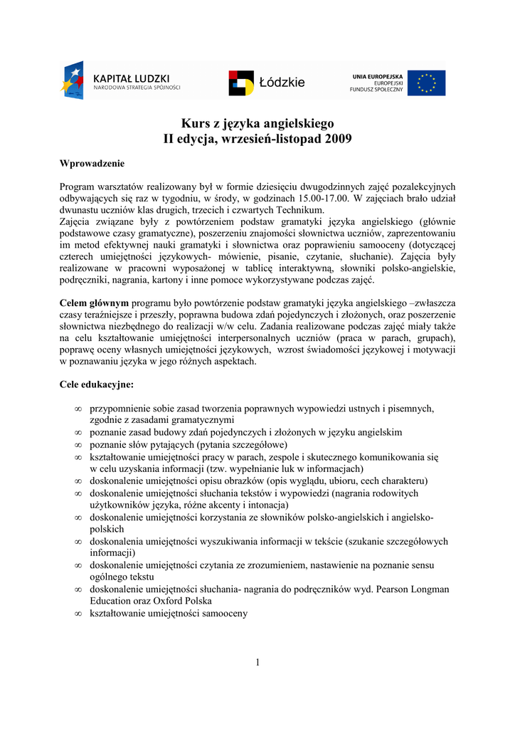 Kurs z języka angielskiego II edycja, wrzesień-listopad 2009 Wprowadzenie Program warsztatów realizowany był w formie dziesięciu dwugodzinnych zajęć pozalekcyjnych odbywających się raz w tygodniu, w środy, w godzinach 15.00-17.00. W zajęciach brało udział dwunastu uczniów klas drugich, trzecich i czwartych Technikum. Zajęcia związane były z powtórzeniem podstaw gramatyki języka angielskiego (głównie podstawowe czasy gramatyczne), poszerzeniu znajomości słownictwa uczniów, zaprezentowaniu im metod efektywnej nauki gramatyki i słownictwa oraz poprawieniu samooceny (dotyczącej czterech umiejętności językowych- mówienie, pisanie, czytanie, słuchanie). Zajęcia były realizowane w pracowni wyposażonej w tablicę interaktywną, słowniki polsko-angielskie, podręczniki, nagrania, kartony i inne pomoce wykorzystywane podczas zajęć. Celem głównym programu było powtórzenie podstaw gramatyki języka angielskiego –zwłaszcza czasy teraźniejsze i przeszły, poprawna budowa zdań pojedynczych i złożonych, oraz poszerzenie słownictwa niezbędnego do realizacji w/w celu. Zadania realizowane podczas zajęć miały także na celu kształtowanie umiejętności interpersonalnych uczniów (praca w parach, grupach), poprawę oceny własnych umiejętności językowych, wzrost świadomości językowej i motywacji w poznawaniu języka w jego różnych aspektach. Cele edukacyjne: • • • • • • • • • • • przypomnienie sobie zasad tworzenia poprawnych wypowiedzi ustnych i pisemnych, zgodnie z zasadami gramatycznymi poznanie zasad budowy zdań pojedynczych i złożonych w języku angielskim poznanie słów pytających (pytania szczegółowe) kształtowanie umiejętności pracy w parach, zespole i skutecznego komunikowania się w celu uzyskania informacji (tzw. wypełnianie luk w informacjach) doskonalenie umiejętności opisu obrazków (opis wyglądu, ubioru, cech charakteru) doskonalenie umiejętności słuchania tekstów i wypowiedzi (nagrania rodowitych użytkowników języka, różne akcenty i intonacja) doskonalenie umiejętności korzystania ze słowników polsko-angielskich i angielskopolskich doskonalenia umiejętności wyszukiwania informacji w tekście (szukanie szczegółowych informacji) doskonalenie umiejętności czytania ze zrozumieniem, nastawienie na poznanie sensu ogólnego tekstu doskonalenie umiejętności słuchania- nagrania do podręczników wyd. Pearson Longman Education oraz Oxford Polska kształtowanie umiejętności samooceny 1 • wdrażanie uczniów do rozwijania swoich zainteresowań oraz samodzielnego zdobywania i poszerzania wiedzy. Tematyka: 1. Test ( na wstępie). Introduction –getting to know each other. Present Simple- czasownik ‘to be’. 2. “Find someone who…”- a speaking game. “Have got’- wyrażanie posiadania. 3. Czas Present Simple, pytania ze słówkami pytającymi ‘wh-‘:where, when, what, who’. 4. Zaimki osobowe, wskazujące i dzierżawcze- ćwiczenia. 5. Konstrukcja ‘there is/ are’ oraz ‘some/ any’. Pytania- how much (rzeczowniki niepoliczalne), how many (rzeczowniki policzalne). 6. Hotel brochure- Reading and looping for some information, preparing for the final project- gathering useful photos and information. 7. Working on the project- preparing hotel brochures. 8. Rodzajniki określone i nieokreślone. Czas Present Continuous- ćwiczenia. 9. Stopniowanie przymiotników. Ćwiczenia ze słówkami pytającymi- ‘whose, which, how long, how often, why, what time’. 10. Food- rzeczowniki policzalne I niepoliczalne. Określanie ilości- miary. Test końcowy. Przewidywane osiągnięcia uczniów: Ideą dodatkowych zajęć pozalekcyjnych w ramach kursu z języka angielskiego jest przypomnienie i powtórzenie podstawowych zasad gramatycznych w celu budowania poprawnych wypowiedzi oraz rozwijanie czterech umiejętności językowych uczniów (słuchanie, czytanie, pisanie mówienie), ukierunkowanie zainteresowań uczestników, uświadomienie im, że znajomość gramatyki jest pomocna i niezbędna. Dodatkowo, poznane metody dotyczące nauki zasad gramatycznych mogą spełnić bardzo ważna rolę w przygotowaniu się uczniów do egzaminu maturalnego z języka angielskiego. W wyniku realizacji programu uczeń potrafi: • • • • • • poprawnie budować zdania pojedyncze i złożone tak, by być rozumianym przez innych odczytywać podstawowe komunikaty werbalne (skierowane bezpośrednio do siebie lub/ i innych osób) pokonać bariery w komunikacji wyrażając swe potrzeby w inny sposób (werbalny i niewerbalny) oceniać swoje predyspozycje do dalszej nauki słownictwa zaplanować własne , najbardziej efektywne, metody nauki słownictwa współpracować w parach i w grupie 2 • korzystać z informacji pochodzących z różnych źródeł (słowniki, podręczniki, nagrania, testy z różnych źródeł) Sposoby osiągania celów – metody, formy i techniki nauczania Praca z uczniami odbywała się w ramach dwugodzinnych zajęć pozalekcyjnych (jeden raz w tygodniu), na których stosowane były różne formy pracy z uczniami: indywidualna praca ucznia, praca w grupach, praca w zespołach cztero- i sześcioosobowych). Podczas zajęć wykorzystano metody aktywizujące pracę i pamięć uczniów, były to m. in.: - ćwiczenia gramatyczne- niektóre zagadnienia były wytłumaczone przed realizacją ćwiczeń (metoda indukcyjna), niektóre były ‘rozgryzane’ i udowadniane przez uczniów (metoda dedukcyjna) - zmodyfikowane przez prowadzącego ćwiczenie ‘mutual dictation’- praca uczniów w parach, jeden uczeń miał za zadanie odnaleźć tekst a następnie tak go podyktować partnerowi, by ten zapisał tekst na wzór tekstu oryginalnego. Druga część zadania polegała na poprawieniu błędów gramatycznych w parach - gry gramatyczne, m.in., „Find someone who…”- ćwiczenia wykorzystujące czas teraźniejszy Present Simple i przeszły Past Simple - ćwiczenia polegające na uzu