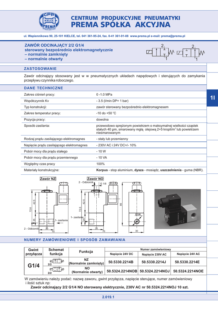 SPÓ ŁKA AKCYJNA ul. Wapiennikowa 90, 25-101 KIELCE, tel. 041 361-95-24, fax. 0-41 361-91-08 www.prema.pl e-mail: [email protected] ZAWÓR ODCINAJĄCY 2/2 G1/4 sterowany bezpośrednio elektromagnetycznie – normalnie zamknięty – normalnie otwarty 2 2 1 1 ZASTOSOWANIE Zawór odcinający stosowany jest w w pneumatycznych układach napędowych i sterujących do zamykania przepływu czynnika roboczego. DANE TECHNICZNE Zakres ciśnień pracy: 0 -1.0 MPa Współczynnik Kv - 3.5 (l/min DP= 1 bar) Typ konstrukcji: zawór sterowany bezpośrednio elektromagnesem Zakres temperatur pracy: -10 do +50 oC Pozycja pracy: dowolna Sposób zasilania: przewodowo sprężonym powietrzem o maksymalnej wielkości cząstek stałych 40 µm, smarowany mgłą olejową 2+5 kropli/m3 lub powietrzem niesmarowanym Rodzaj prądu zasilającego elektromagnes - stały lub przemienny Napięcie prądu zasilającego elektromagnes - 230V AC i 24V DC+/- 10% Pobór mocy dla prądu stałego - 10 W Pobór mocy dla prądu przemiennego - 10 VA Względny czas pracy 100% Materiały konstrukcyjne: Korpus - stop aluminium, dysza - mosiądz, uszczelnienia - guma (NBR). Zawór NZ 1I Zawór NO 2 - Odbiornik 72.6 86 72.6 42.5 42.5 G 1/8 G1/4 2 - Odbiornik 1- zasilanie 25 25 1- zasilanie 30 30 30 70 70 NUMERY ZAMÓWIENIOWE I SPOSÓB ZAMAWIANIA Gwint przyłącza G1/4 Schemat funkcja 2/2 2/2 Funkcja Numer zamówieniowy Napięcie 24V DC Napięcie 230V AC NZ 50.5330.2214J (Normalnie zamknięty) 50.5330.2214B NO (Normalnie otwarty) 50.5324.2214NOB 50.5324.2214NOJ Napięcie 24V AC 50.5330.2214E 50.5324.2214NOE W zamówieniu należy podać: nazwę zaworu, gwint przyłącza, napięcie sterujące, numer zamówieniowy i ilość sztuk np: Zawór odcinający 2/2 G1/4 NO sterowany elektrycznie, 230V AC nr 50.5324.2214NOJ 10 szt. 2.019.1