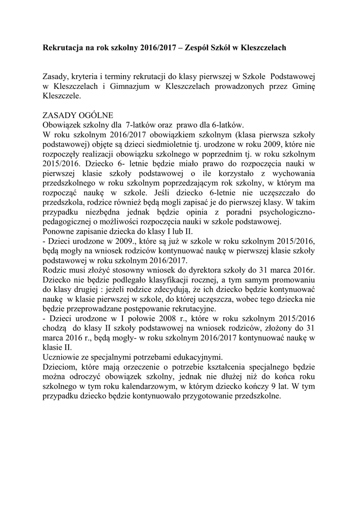 Rekrutacja na rok szkolny 2016/2017 – Zespół Szkół w Kleszczelach Zasady, kryteria i terminy rekrutacji do klasy pierwszej w Szkole Podstawowej w Kleszczelach i Gimnazjum w Kleszczelach prowadzonych przez Gminę Kleszczele. ZASADY OGÓLNE Obowiązek szkolny dla 7-latków oraz prawo dla 6-latków. W roku szkolnym 2016/2017 obowiązkiem szkolnym (klasa pierwsza szkoły podstawowej) objęte są dzieci siedmioletnie tj. urodzone w roku 2009, które nie rozpoczęły realizacji obowiązku szkolnego w poprzednim tj. w roku szkolnym 2015/2016. Dziecko 6- letnie będzie miało prawo do rozpoczęcia nauki w pierwszej klasie szkoły podstawowej o ile korzystało z wychowania przedszkolnego w roku szkolnym poprzedzającym rok szkolny, w którym ma rozpocząć naukę w szkole. Jeśli dziecko 6-letnie nie uczęszczało do przedszkola, rodzice również będą mogli zapisać je do pierwszej klasy. W takim przypadku niezbędna jednak będzie opinia z poradni psychologicznopedagogicznej o możliwości rozpoczęcia nauki w szkole podstawowej. Ponowne zapisanie dziecka do klasy I lub II. - Dzieci urodzone w 2009., które są już w szkole w roku szkolnym 2015/2016, będą mogły na wniosek rodziców kontynuować naukę w pierwszej klasie szkoły podstawowej w roku szkolnym 2016/2017. Rodzic musi złożyć stosowny wniosek do dyrektora szkoły do 31 marca 2016r. Dziecko nie będzie podlegało klasyfikacji rocznej, a tym samym promowaniu do klasy drugiej : jeżeli rodzice zdecydują, że ich dziecko będzie kontynuować naukę w klasie pierwszej w szkole, do której uczęszcza, wobec tego dziecka nie będzie przeprowadzane postępowanie rekrutacyjne. - Dzieci urodzone w I połowie 2008 r., które w roku szkolnym 2015/2016 chodzą do klasy II szkoły podstawowej na wniosek rodziców, złożony do 31 marca 2016 r., będą mogły- w roku szkolnym 2016/2017 kontynuować naukę w klasie II. Uczniowie ze specjalnymi potrzebami edukacyjnymi. Dzieciom, które mają orzeczenie o potrzebie kształcenia specjalnego będzie można odroczyć obowiązek szkolny, jednak nie dłużej niż do końca roku szkolnego w tym roku kalendarzowym, w którym dziecko kończy 9 lat. W tym przypadku dziecko będzie kontynuowało przygotowanie przedszkolne. REKRUTACJA DO PIERWSZEJ KLASY SZKOŁY PODSTAWOWEJ W KLESZCZELACH I GIMNAZJUM W KLESZCZELACH KANDYDACI ZAMIESZKALI W OBWODZIE SZKOŁY Do klasy pierwszej Szkoły Podstawowej w Kleszczelach oraz do klasy pierwszej Gimnazjum w Kleszczelach, dzieci i młodzież zamieszkałe na terenie Gminy Kleszczele, przyjmuje się na podstawie zgłoszenia rodziców. Do klasy pierwszej gimnazjum przyjmuje się kandydatów posiadających świadectwo ukończenia szkoły podstawowej. Druki zgłoszeń są dostępne w sekretariacie Zespołu Szkół w Kleszczelach. Zgłoszenia należy składać w terminie od 10 marca 2016 r. do 20 kwietnia 2016 r. KANDYDACI ZAMIESZKALI POZA OBWODEM SZKOŁY Kandydaci zamieszkali poza obwodem Szkoły Podstawowej w Kleszczelach lub Gimnazjum w Kleszczelach mogą być przyjęci do klasy pierwszej po przeprowadzeniu postępowania rekrutacyjnego, jeżeli szkoła dysponuje wolnymi miejscami. W postępowaniu rekrutacyjnym brane są pod uwagę kryteria określone przez organ prowadzący uchwałą Nr VII/65/2015 Rady Miejskiej w Kleszczelach z dnia 30 grudnia 2015 r. w sprawie określenia kryteriów postępowania rekrutacyjnego do klas pierwszych szkoły podstawowej i gimnazjum prowadzonych przez Gminę Kleszczele, z uwzględnieniem zapewnienia jak najpewniejszej realizacji potrzeb dziecka i jego rodziny oraz lokalnych potrzeb społecznych. Druki wniosków są dostępne w sekretariacie Zespołu Szkół w Kleszczelach. Należy je składać w terminie od 10 marca 2016 r. do 20 kwietnia 2016 r. do pierwszej klasy szkoły podstawowej oraz od 24 marca 2016 r. do 20 kwietnia 2016 r. do klasy pierwszej gimnazjum. Kryteria rekrutacji oraz odpowiadające im liczby punktów w postępowaniu rekrutacyjnym do klasy pierwszej Szkoły Podstawowej w Kleszczelach i Gimnazjum w Kleszczelach dla kandydatów zamieszkałych poza obwodem tej szkoły: 1) w szkole obowiązek szkolny spełnia rodzeństwo kandydata – 10 pkt; 2) rodzice lub jeden z rodziców kandydata pracuje w miejscowości należącej do obwodu szkoły – 5 pkt; 3) w obwodzie szkoły zamieszkują krewni kandydata (babcia, dziadek, rodzeństwo kandydata, rodzeństwo rodziców) wspierający rodziców w wykonywaniu obowiązków opiekuńczych – 2 pkt. Spełnienie kryterium zawartego w pkt 1 potwierdza dyrektor szkoły na podstawie dokumentacji będącej w posiadaniu szkoły. Spełnienie kryteriów zawartych w pkt 2 i 3 potwierdza rodzic składając odpowiednio oświadczenie o miejscu zatrudnienia w miejscowości należącej do obwodu szkoły oraz oświadczenie o miejscu zamieszkiwania krewnych kandydata. Terminy rekrutacji do pierwszych klas szkół podstawowych (dzieci zamieszkałe poza obwodem szkoły) Terminy postępowania rekrutacyjnego oraz postępowania uzupełniającego dla dzieci zamieszkałych poza obwodem szkoły, a także terminy składania dokumentów do klasy pierwszej szkoły podstawowej ustalone zostały w Rozporządzeniu Ministra Edukacji Narodowej z dnia 2 listopada 2015 r. w sprawie sposobu przeliczania na punkty poszczególnych kryteriów uwzględnianych w postępowaniu rekrutacyjnym, składu i szczegółowych zadań komisji rekrutacyjnej, szczegółowego trybu i terminów przeprowadzania postępowania rekrutacyjnego oraz postępowania uzupełniającego (Dz. U. z 2015 r., poz. 1942), natomiast szczegółowy harmonogram czynności w postępowaniu rekrutacyjnym w roku szkolnym 2016/2017 został ustalony Zarządzeniem nr 89/2016 Burmistrza Kleszczel z dnia 12 lutego 2016 r. w sprawie ustalenia harmonogramu czynności w postępowaniu rekrutacyjnym i postępowaniu uzupełniającym w roku szkolnym 2016/2017 do Przedszkola w Kleszczelach i Szkoły Podstawowej w Kleszczelach. Terminy postępowania rekrutacyjnego oraz postępow