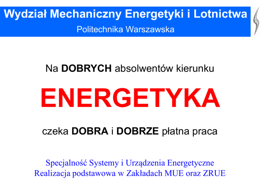 Wydział Mechaniczny Energetyki i Lotnictwa Politechnika Warszawska Na DOBRYCH absolwentów kierunku ENERGETYKA czeka DOBRA i DOBRZE płatna praca Specjalność Systemy i Urządzenia Energetyczne Realizacja podstawowa w Zakładach MUE oraz ZRUE Kierunek ENERGETYKA Systemy i Urządzenia Energetyczne 110000 1999 100000 2005 90000 2011 80000 2012 [t/h] 70000 2013 60000 50000 40000 30000 20000 10000 0 Ogółem do 5 lat od 6 do 10 lat od 11 do od 16 do od 21 do od 26 do ponad 30 15 lat 20 lat 25 lat 30 lat lat Dynamika zmian struktury wieku kotłów energetycznych w elektrowniach cieplnych zawodowych (Polska) – porównanie z lat:1999, 2005, 2011, 2012 oraz 2013 (według danych ARE – Statystyka Elektroenergetyki Polskiej) Kierunek ENERGETYKA Systemy i Urządzenia Energetyczne 32000 1999 28000 2005 24000 2011 2012 [MW] 20000 2013 16000 12000 8000 4000 0 Ogółem do 5 lat od 6 do 10 lat od 11 do od 16 do od 21 do od 26 do ponad 30 15 lat 20 lat 25 lat 30 lat lat Dynamika zmian struktury wieku turbozespołów w elektrowniach cieplnych zawodowych (Polska) – porównanie z lat:1999, 2005, 2011, 2012 oraz 2013 (według danych ARE – Statystyka Elektroenergetyki Polskiej) Kierunek ENERGETYKA Systemy i Urządzenia Energetyczne 172 GW wiek (lat) - gazowe 43 GW 51 GW wiek (lat) - olejowe wiek (lat) - w. brunatny 115 GW 125 GW wiek (lat) - jądrowe wiek (lat) - w. kamienny 51 51 51 51 51 46 46 46 46 46 41 41 41 41 41 36 36 36 36 36 31 31 31 31 31 26 26 26 26 26 21 21 21 21 21 16 16 16 16 16 11 11 11 11 11 6 6 6 6 6 1 1 1 1 0 5 10 Moc [GW] 15 1 0 5 10 Moc [GW] 15 0 5 10 Moc [GW] 15 0 5 10 Moc [GW] 15 0 5 10 15 Moc [GW] Struktura historyczna inwestycji w elektrownie cieplne w krajach EU27 - według wieku - lata przekazania do eksploatacji 1962-2012 (wg: RWE Facts and Figures) Kierunek ENERGETYKA Systemy i Urządzenia Energetyczne Majątek wytwórczy funkcjonujący w tradycyjnej energetyce krajowej, podobnie europejskiej starzeje się. Konieczne są nowe inwestycje, potrzebna do odbudowania kadra specjalistów. Zmienia się koncepcja funkcjonowania energetyki. Potrzebne są nowe rozwiązania pozwalające na współpracę współczesnej elektrowni cieplnej z e źródłami OZE. Zaostrzane są wymogi emisyjne w odniesieniu do tradycyjnych elektrowni. Potrzebne są nowe technologie służące redukcji emisji, także substancji dotychczas wprost nie limitowanych (metale ciężkie, związki fluoru, chloru) Rozbudowa OZE jako źródeł o niestabilnej w czasie generacji wymaga wypracowania nowych technologii opartych w znacznej mierze na magazynowaniu energii. W tej chwili trwają intensywne działania zmierzające do opracowania takich technologii. Kierunek ENERGETYKA Systemy i Urządzenia Energetyczne Edukacja na poziomie przedmiotów związanych z maszynami i urządzeniami energetycznymi. Dyplomowanie prowadzone w zakładach MUE oraz PNiS. Nauczyciele akademiccy mający ściśle powiązania z przemysłem, często również zatrudnieni w przemyśle. Liczna kadra profesorska, silna grupa młodych pracowników ze stopniem doktora, dalszy rozwój młodej kadry (liczni doktoranci). Możliwość realizacji prac dyplomowych bezpośrednio w przemyśle lub w ścisłym kontakcie z przemysłem, w tym w dużych korporacjach. Perspektywa dobrej i atrakcyjnej pracy w eksploatacji, ale także przy budowie nowych elektrowni – po wielu latach zastoju inwestycyjnego perspektywa nowego impulsu. Olbrzymie braki kadrowe w „starych” elektrowniach podejmujących nowe inwestycje. Kierunek ENERGETYKA Systemy i Urządzenia Energetyczne Tematyka realizowanych prac badawczych przekłada się na ofertę prac dyplomowych i przejściowych. Uzupełnienie stanowią prace wprost dla przemysłu. Kierunek ENERGETYKA Systemy i Urządzenia Energetyczne Bloki węglowe, realizacje i plany na najbliższe lata Lokalizacja realizowanych i planowanych bloków gazowo-parowych na tle schematu sieci gazowniczej STALOWA WOLA Kierunek ENERGETYKA Systemy i Urządzenia Energetyczne Tematyka realizowanych prac badawczych przekłada się na ofertę prac dyplomowych i przejściowych. Uzupełnienie stanowią prace wprost dla przemysłu. Elektrownia Bełchatów - widok ogólny