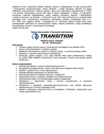 Jesteśmy firmą o całkowicie polskim kapitale, jednym z największych w kraju producentem i integratorem oprogramowania. Swoje produkty i usługi kierujemy głównie do kręgu odbiorców przemysłowych, sektora energii i gazu oraz automatyki przemysłowej w Polsce i na świecie. Zatrudniamy prawie 600 osób w ośmiu oddziałach w Polsce: w Warszawie, Wrocławiu, Ostrowie Wielkopolskim, Łodzi, Lublinie, Koszalinie, Kielcach i Białymstoku, a także za granicą: na Ukrainie, w Niemczech oraz USA. Nasi pracownicy to wysokiej klasy specjaliści, m.in.: inżynierowie, automatycy, informatycy, testerzy, programiści Java, C++, C#, .NET, iOS, eksperci Oracle i managerowie IT. Tworzymy zgrany zespół ludzi, który profesjonalnie podchodzi do wykonywanych zadań, chętnie podnosimy swoje kwalifikacje i poszukujemy nowych, innowacyjnych rozwiązań. Dołącz do nas jako: Nazwa stanowiska: Pracownik sekretariatu Miejsce pracy: Koszalin Nr ref.: PS/Koszalin Oferujemy: Ciekawą, pełną wyzwań pracę w dynamicznie rozwijającym się oddziale firmy Pracę w miłej atmosferze w młodym zespole Stabilność zatrudnienia w oparciu o umowę o pracę, w wymiarze pełnego etatu Szkolenia w zakresie wykonywanych obowiązków Atrakcyjny pakiet socjalny, m.in. karty Benefit Multi Sport (nielimitowany dostęp do ponad 2000 obiektów sportowych), kursy językowe, wczasy pod gruszą, paczki świąteczne Zakres obowiązków: Obsługa sekretariatu i wsparcie administracyjne biura Zarządzanie korespondencją i nadzór nad właściwym obiegiem dokumentów Kontakt z gośćmi firmy, w tym zagranicznymi Obsługa spotkań biznesowych na terenie biura Rezerwacja hoteli oraz biletów lotniczych i kolejowych Zaopatrzenie biura w materiały niezbędne do codziennej pracy Wprowadzanie faktur do wewnętrznego systemu księgowego Współpraca z dostawcami usług i firmami zewnętrznymi w sprawach administracyjnych Współpraca z zespołami: administracyjno-technicznym oraz Human Resources zlokalizowanymi w innych oddziałach firmy Dbanie o pozytywny wizerunek firmy w kontaktach z Klientami i dostawcami oraz wśród pracowników firmy Wymagania: Wykształcenie minimum średnie Bardzo dobra znajomość języka angielskiego (w mowie i piśmie) – część rozmowy rekrutacyjnej przeprowadzana będzie w języku angielskim Bardzo dobra znajomość pakietu MS Office oraz sprawna obsługa urządzeń biurowych Wysoko rozwinięte umiejętności interpersonalne Samodzielność i dobra organizacja pracy własnej Odpowiedzialność, operatywność, zaangażowanie w pracę Rzetelność, dokładność Prawo jazdy kat. B Mile widziane: Doświadczenie na podobnym stanowisku pracy Studenci studiów niestacjonarnych – w szczególności ze specjalizacją Zarządzanie Zasobami Ludzkimi Znajomość języka niemieckiego lub francuskiego umożliwiająca swobodną komunikację Wyślij swoją aplikację, korzystając z linku: http://kariera.tt.com.pl/#1627/pracownik-sekretariatu/aplikuj/298 Prosimy o dołączenie do CV następującego oświadczenia: „Wyrażam zgodę na przetwarzanie moich danych osobowych zawartych w ofercie pracy do realizacji procesu rekrutacji (nr. ref.: PS/Warszawa) prowadzonego przez Transition Technologies S.A., zgodnie z ustawą z dnia 29.08.1997 r. o ochronie danych osobowych (Dz. U. z 2002 Nr 101, poz. 926 ze zm.)”. Odpowiedź na niniejszą ofertę jest rozumiana jako wyrażenie zgody na przetwarzanie danych osobowych kandydata na potrzeby tej rekrutacji oraz na potrzeby przyszłych rekrutacji prowadzonych przez Transition Technologies S.A. Kandydaci, którzy nie wyrażają zgody na zapisanie ich danych w bazie rekrutacyjnej Transition Technologies S.A. są proszeni o umieszczenie takiej informacji w swojej aplikacji. Oferty kandydatów, którzy nie spełnili wymagań lub nie wyrazili zgodny na przetwarzanie ich danych na potrzeby przyszłych rekrutacji, zostaną komisyjnie zniszczone. Dane osobowe kandydatów przetwarzane będą przez Transition Technologies S.A. z siedzibą w Warszawie przy ul. Pawiej 55, wyłącznie na potrzeby rekrutacji. Osoby, których dane dotyczą, mają prawo dostępu do treści swoich danych oraz ich poprawiania. Podanie danych osobowych jest dobrowolne z zastrzeżeniem, że ich niepodanie uniemożliwi rozpatrzenie oferty.