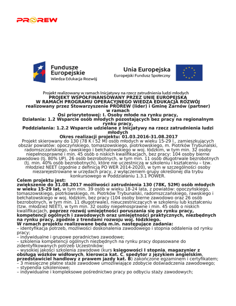 PROJEKT WSPÓŁFINANSOWANY PRZEZ UNIĘ EUROPEJSKĄ W RAMACH PROGRAMU OPERACYJNEGO WIEDZA EDUKACJA ROZWÓJ realizowany przez Stowarzyszenie PROREW (lider) i Gminę Żarnów (partner) w ramach Osi priorytetowej: I. Osoby młode na rynku pracy, Działania: 1.2 Wsparcie osób młodych pozostających bez pracy na regionalnym rynku pracy, Poddziałania: 1.2.2 Wsparcie udzielane z Inicjatywy na rzecz zatrudnienia ludzi młodych Okres realizacji projektu: 01.03.2016-31.08.2017 Projekt skierowany do 130 (78 K i 52 M) osób młodych w wieku 15-29 l., zamieszkujących obszar powiatów: opoczyńskiego, tomaszowskiego, piotrkowskiego, m. Piotrków Trybunalski, radomszczańskiego, rawskiego i bełchatowskiego w woj. łódzkim, w tym min. 32 osoby niepełnosprawne i min. 45 osób o niskich kwalifikacjach, bez pracy: 104 osoby bierne zawodowo (tj. 80% UP), 26 osób bezrobotnych, w tym min. 11 osób długotrwale bezrobotnych (tj. min. 40% osób bezrobotnych), które nie uczestniczą w szkoleniu i kształceniu – tzw. młodzież NEET (zgodnie z definicją PO WER 2014-2020), w tym w szczególności osoby niezarejestrowane w urzędach pracy, z wyłączeniem grupy określonej dla trybu konkursowego w Poddziałaniu 1.3.1 POWER. Celem projektu jest: zwiększenie do 31.08.2017 możliwości zatrudnienia 130 (78K, 52M) osób młodych w wieku 15-29 lat, w tym min. 39 osób w wieku 18-24 lata, z powiatów: opoczyńskiego, tomaszowskiego, piotrkowskiego, m. Piotrków Trybunalski, radomszczańskiego, rawskiego i bełchatowskiego w woj. łódzkim, bez pracy (104 osoby bierne zawodowo oraz 26 osób bezrobotnych, w tym min. 11 długotrwale), nieuczestniczących w szkoleniu lub kształceniu (tzw. młodzież NEET), w tym min. 32 osoby niepełnosprawne i min. 45 osób o niskich kwalifikacjach, poprzez rozwój umiejętności poruszania się po rynku pracy, kompetencji ogólnych i zawodowych oraz umiejętności praktycznych, niezbędnych na rynku pracy, zgodnie z trendami rozwoju woj. łódzkiego. W ramach projektu realizowane będą m.in. następujące zadania: – identyfikacja potrzeb, możliwości doskonalenia zawodowego i stopnia oddalenia od rynku pracy; – indywidualne i grupowe poradnictwo zawodowe; – szkolenia kompetencji ogólnych niezbędnych na rynku pracy dopasowane do zidentyfikowanych potrzeb Uczestników; – wysokiej jakości szkolenia zawodowe (kurs księgowości I stopnia, magazynier z obsługą wózków widłowych, kierowca kat. C, spedytor z językiem angielskim, przedstawiciel handlowy z prawem jazdy kat. B) zakończone egzaminem i certyfikatem; – 3 miesięczne płatne staże zawodowe umożliwiające zdobycie doświadczenia zawodowego; – stypendia szkoleniowe; – indywidualne i kompleksowe pośrednictwo pracy po odbyciu staży zawodowych; – zwrot kosztów dojazdu; – dodatek relokacyjny (wsparcie finansowe w celu podjęcia pracy poza miejscem zamieszkania). UDZIAŁ W PROJEKCIE JEST CAŁKOWICIE BEZPŁATNY !!! Kto może wziąć udział w projekcie? Zapraszamy wszystkich spełniających kryteria rekrutacyjne: – Wiek 15-29 l. – dokument tożsamości/oświadczenie – Zamieszkanie w 1 z 7 powiatów (opoczyńskim, tomaszowskim, piotrkowskim, m. Piotrków Trybunalski, radomszczańskim, rawskim, bełchatowskim) w woj. łódzkim – dokument tożsamości/oświadczenie – Status osoby biernej zawodowo, nieuczącej się i nieszkolącej – oświadczenie; lub bezrobotnej, w tym także długotrwale bezrobotnej – zaświadczenie z PUP/oświadczenie – Lub status osoby niepełnosprawnej – zaświadczenie z ZUS/PZON REKRUTACJA: Trwa rekrutacja do projektu! Formularze rekrutacyjne można składać w biurze projektu: Anna Palus – specjalista ds. rekrutacji i rozwoju projektu, tel. 533 323 329 Urząd Gminy w Żarnowie ul. Opoczyńska 5, 26-330 Żarnów pokój nr 22 (parter) w godzinach 9.00-12.00 w każdy dzień roboczy (od poniedziałku do piątku). Dokumenty do pobrania: Regulamin rekrutacji i udziału w projekcie Formularz rekrutacyjny do projektu >> Informacje dodatkowe do formularza rekrutacyjnego Oświadczenie Uczestnika Projektu realizowanego w ramach Inicjatywy na rzecz zatrudnienia ludzi młodych Oświadczenie Uczestnika Projektu o przetwarzaniu danych osobowych Wniosek o zwrot kosztów dojazdów na szkolenia Ogólny harmonogram realizacji projektu Więcej informacji: kierownik projektu – JAN DUDA, tel. 533 535 008, e-mail: [email protected] Media społecznościowe: https://www.facebook.com/want2learn.zarnow/ Informacje dotyczące staży: Regulamin stażu Umowa stażowa – wersja nr 1 Umowa stażowa – wersja nr 2 Załącznik nr 1 do umowy stażowej – tablica informacyjna Załącznik nr 2 do umowy stażowej – program stażu Załącznik nr 3 do umowy stażowej – lista obecności Załącznik nr 4 do umowy stażowej – sprawozdanie z przebiegu stażu Załącznik nr 5 do umowy stażowej – wniosek o zwrot kosztów dojazdów Szczegółowy harmonogram wsparcia: Tura I: Indywidualne pośrednictwo pracy cz.1 Indywidualne pośrednictwo pracy cz.2 Kompetencje ogólne: Analityczne myślenie Kompetencje ogólne: Arkusz kalkulacyjny Kompetencje ogólne: Asertywność Kompetencje ogólne: Komunikacja Kompetencje ogólne: Odporność na stres Kompetencje ogólne: Organizacja pracy Kompetencje ogólne: Orientacja na cel Kompetencje ogólne: Pisanie i redagowanie pism Szkolenie zawodowe: Przedstawiciel handlowy z prawem jazdy kategorii B Szkolenie zawodowe: Prawo jazdy kategorii C Szkolenie zawodowe: Spedytor z językiem angielskim Szkolenie zawodowe: Magazynier z obsługą wózka widłowego Szkolenie zawodowe: Kurs księgowości I stopnia Gr 1 Szkolenie zawodowe: Kurs księgowości I stopnia Gr 2 Tura II: Indywidualne poradnictwo zawodowe Indywidualne pośrednictwo pracy Kompetencje ogólne: Asertywność Kompetencje ogólne: Komunikacja Kompetencje ogólne: Odporność na stres Kompetencje ogólne: Organizacja pracy Kompetencje ogólne: Orientacja na cel Kompetencje ogólne: Pisanie i redagowan
