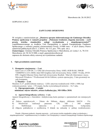 Sławoborze dn. 26.10.2012 GOPS.0341.4.2012 ZAPYTANIE OFERTOWE W związku z zamówieniem pn. „Dostawa sprzętu elektronicznego do Gminnego Ośrodka Pomocy społecznej w ramach projektu „Pokonam trudności, dogonię marzenia – czyli prosta ścieżka standardów usługi wychodzenia z niepełnosprawności”” współfinansowanego ze środków Unii Europejskiej w ramach Europejskiego Funduszu Społecznego o wartości poniżej równowartości kwoty 14 000 euro - 4 ust.8 ustawy Prawo zamówień publicznych (Dz.U. z 2010 r. Nr 113, poz. 759 z póź. zm.) Zamawiający: Gminny Ośrodek Pomocy Społecznej w Sławoborzu, ul. Leśna 1 A, 78-314 Sławoborze, tel. 94 36 52 000, e-mail: [email protected] zaprasza do złożenia oferty cenowej na wymienione zadanie. I. Opis przedmiotu zamówienia: 1. Komputer stacjonarny – 2 szt. Intel Core i3 2100 DC 3.1 GHz lub równoważny firmy AMD, 4GB RAM, 500GB 7200RPM S-ATA HDD, Intel HD Graphics lub równoważny firmy AMD / Nvidia, DVDRW, Gigabit Ethernet firmy Intel lub równoważny Realtek / Marvell, klawiatura i mysz, Microsoft Windows 7 Professional 64-bit Edition, system operacyjny, 3 lata gwarancji na cały komputer, 2. Monitor – 2 szt. Monitor 21,5'', podświetlenie matrycy - LED, natywna rozdzielczość 1920 x 1080, kąt widzenia poziom / pion - 170 stopni, liczba wyświetlanych kolorów - 16,7 mln, 3. Oprogramowanie – 2 sztuki minimum: edytor tekstów, arkusz kalkulacyjny, MS Office 2010. 4. Aparat fotograficzny cyfrowy– 1 szt. Aparat fotograficzny z futerałem i dedykowaną karta pamięci o parametrach nie mniejszych niż: a) Zakres ogniskowych - 24mm do 360mm, dający zbliżenie 360/24 - 15x. b) Możliwość realizacji panoram 120, 180 i 360 stopni. c) Stabilizacja optyczna z możliwością wyłączania. d) Zdjęcia poklatkowe z szybkością 8 klatek na sekundę w pełnej rozdzielczości. Projekt „Pokonam trudności, dogonię marzenia – czyli prosta ścieżka standardów usługi wychodzenia z niepełnosprawności” współfinansowany ze środków Unii Europejskiej w ramach Europejskiego Funduszu Społecznego e) Bracketing f) Ręczna regulacja balansu bieli. ekspozycji, zakresu dynamicznego. 5. Urządzenie wielofunkcyjne – 2 szt. Podstawowe funkcje urządzenia: drukarka, kopiarka, skaner, fax, Rozdzielczość: 1200 x 600 dpi;Format: A4; Szybkość druku (mono): 30 str./min.; Szybkość druku (kolor): 26 str./min.; Wydajność: 60 000 str./mies.; Gramatura papieru: 64 - 220 g/m²; Pojemność podajnika papieru: 250 szt.; Zainstalowana pamięć/max: 256 MB / 768 MB; Prędkość procesora: 533 MHz; Złącza zewnętrzne: USB 2.0, karta sieciowa 10/100 Base TX Ethernet, RJ11 x 2; Język drukarki: PCL6 (XL3.0), PCL5c, emulacja PostScript 3, SIDM (IBM-PPR, EPSON-FX) Automatyczny druk dwustronny: TAK Zainstalowane opcje: ADF (automatyczny podajnik dokumentów) pojemność: 50 arkuszy ; automatyczny dupleks ; tacka odbiorcza na 150 arkuszy (wydrukiem do dołu) ; tacka odbiorcza na 100 arkuszy (wydrukiem do góry) ; czytnik kart pamięci Typ skanera: kolorowy; Optyczna rozdzielczość skanowania: 1200 x 1200 dpi Głębia koloru: 48 bit; Skalowanie: 25-400 % Cechy dodatkowe: wyświetlacz LCD , fax ITU-T G3(Super G3) do 33,6 kbps, 3 sekundy na stronę Obsługiwane systemy operacyjne: Windows XP (32-bit & 64-bit) / Server 2003 (32bit & 64-bit) / Server 2008 (32-bit & 64-bit) / Server 2008 R2 (64-bit) / Vista (32-bit & 64-bit) / Windows 7 (32-bit & 64-bit); Mac OS X 10.3.9 to 10.7 Masa brutto: ok. 29 kg; Szerokość: 427 mm; Głębokość: 509 mm; Wysokość: 444 mm Gwarancja: 24 miesiące) Materiały ekspolatacyjne: toner czarny na 7000 str. (44973508), tonery kolorowe C/M/Y (każdy po 5000 str.) 6. Niszczarka do dokumentów – 1 szt. szerokość wejścia 230 mm niszczą płyty CD automatyczny start/stop, cofanie papieru, zabezpieczenie przed przegrzaniem energooszczędność - automatyczne wyłączenie po 2 minutach pojemność kosza 32 litry gwarancja 2 lata, 10 lat na noże tnące 7. Tel. komórkowy – 2 szt (bez SIM-LOCKA) minimalna pamięć 8 GB, 256 MBRAM, e-mail: obsługa protokołu IMAP4, obsługa protokołu POP3, obsługa protokołu SMTP, obsługa załączników, Internet: GPRS, EDGE, UMTS, Transmisja danych: HSDPA, WCDMA, HSPA, aparat cyfrowy – min 3 MPX, gwarancja 24 miesiące, kolor czarny, system operacyjny Android II. Pozostałe wymagania: Projekt „Pokonam trudności, dogonię marzenia – czyli prosta ścieżka standardów usługi wychodzenia z niepełnosprawności” współfinansowany ze środków Unii Europejskiej w ramach Europejskiego Funduszu Społecznego 1) Zamawiający wymaga, aby urządzenia posiadały dokumenty potwierdzające dopuszczenie do obrotu, oraz instrukcje obsługi. Dokumenty, napisane w języku polskim, należy dostarczyć w dniu dostawy sprzętu. 2) Jeżeli w wymaganiach szczegółowych nie jest ujęte inaczej urządzenia muszą posiadać minimum 24 miesięczny okres gwarancji. 3) W cenie należy zawrzeć dostawę sprzętu do: Gminnego Ośrodka Pomocy Społecznej w Sławoborzu. III. Oferty częściowe Zamawiający nie dopuszcza składania ofert częściowych. IV. Termin wykonania zamówienia 14 dni od dnia podpisania umowy. V. Ocena spełnienia warunków dokonana zostanie wg formuły: spełnia/nie spełnia. VI. Kryteria oceny ofert i ich znaczenie oraz opis sposobu obliczania ceny. Cena - 100% VII.Opis sposobu przygotowania oferty: 1) Wykonawca może złożyć jedną ofertę w języku polskim, pismem czytelnym (Wzór załącznik Nr 1 do ogłoszenia). 2) Do oferty należy dołączyć aktualny odpis z właściwego rejestru albo aktualne zaświadczenie o wpisie do ewidencji działalności gospodarczej, jeżeli odrębne przepisy wymagają wpisu do rejestru lub zgłoszenia do ewidencji działalności gospodarczej. 3) Oferty należy składać drogą elektroniczną na adres e-mail: [email protected] Termin składania ofert upływa dnia 31 października 2012 r. godz. 14.00. Ofertę należy przesłać na adre
