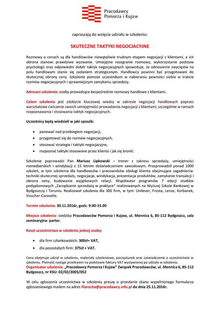 zapraszają do wzięcia udziału w szkoleniu: SKUTECZNE TAKTYKI NEGOCJACYJNE Rozmowy o cenach są dla handlowców niewątpliwie trudnym etapem negocjacji z klientami, a ich obrona stanowi prawdziwe wyzwanie. Umiejętne rozegranie rozmowy, wykorzystanie podstaw psychologii oraz odpowiedni dobór taktyk negocjacyjnych spowoduje, że odnoszenie zwycięstw na polu handlowym stanie się zadaniem strategicznym. Handlowcy powinni być przygotowani do skutecznej obrony ceny. Szkolenie pomoże uczestnikom w nabieraniu pewności siebie w trakcie rozmów negocjacyjnych i sprawniejszym zamykaniu sprzedaży. Adresaci szkolenia: osoby prowadzące bezpośrednie rozmowy handlowe z klientami. Celem szkolenia jest zdobycie kluczowej wiedzy w zakresie negocjacji handlowych poprzez warsztatowe ćwiczenie swoich umiejętności prowadzenia negocjacji z klientami, szczególnie w ramach rozpoznawania i stosowania taktyk negocjacyjnych. Uczestnicy będą wiedzieli w jaki sposób: panować nad przebiegiem negocjacji, przygotować się do rozmów negocjacyjnych, stosować strategie i taktyki negocjacyjne, rozpoznać taktyki stosowane przez klienta i jak się bronić. Szkolenie poprowadzi Pan Mariusz Lipkowski – trener z zakresu sprzedaży, umiejętności menedżerskich i windykacji z 15 letnim doświadczeniem zawodowym. Przeprowadził ponad 1000 szkoleń, w tym szkolenia dla handlowców i pracowników obsługi klienta obejmujące zagadnienia: techniki skutecznej sprzedaży, negocjacje, windykacja, prezentacja produktów, zamykanie transakcji i obrona ceny, budowanie wyjątkowych relacji. Współautor programów 7 edycji studiów podyplomowych „Zarządzanie sprzedażą w praktyce“ realizowanych na Wyższej Szkole Bankowej w Bydgoszczy i Toruniu. Realizował szkolenia dla 300 firm, w tym: Unilever, Frosta, Lenze, Korbanek, Visscher-Caravelle. Termin szkolenia: 30.11.2016r, godz. 9.00-15.00 Miejsce szkolenia: siedziba Pracodawców Pomorza i Kujaw, ul. Mennica 6, 85-112 Bydgoszcz, sala seminaryjna- parter. Koszt uczestnictwa w szkoleniu jednej osoby: dla firm członkowskich: 300zł+ VAT, dla pozostałych firm: 375zł + VAT. Cena obejmuje udział w szkoleniu, materiały szkoleniowe, poczęstunek oraz zaświadczenie o uczestnictwie w szkoleniu. Płatność nastąpi przelewem na podstawie faktury VAT wystawionej po udziale w szkoleniu. Organizator szkolenia: „Pracodawcy Pomorza i Kujaw” Związek Pracodawców, ul. Mennica 6, 85-112 Bydgoszcz, nr KSU: 02/02/2005/052 W celu zgłoszenia uczestnictwa w szkoleniu proszę o przesłanie skanu wypełnionego formularza zgłoszeniowego mailem na adres [email protected] do dnia 25.11.2016r.