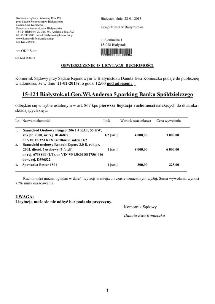Komornik Sądowy (dawniej Rew.IV) przy Sądzie Rejonowym w Białymstoku Danuta Ewa Konieczka Kancelaria Komornicza w Białymstoku 15-124 Białystok ul. Gen. Wł. Andersa 5 lok. 502 tel. 85 7425100 e-mail: [email protected] www.komornik-bialystok.com.pl DK Km 2058/11 Białystok, dnia 22-01-2013 << ODPIS >> *0020000803928* Urząd Miasta w Białymstoku ul.Słonimska 1 15-028 Białystok DK KM 1541/12 OBWIESZCZENIE O LICYTACJI RUCHOMOŚCI Komornik Sądowy przy Sądzie Rejonowym w Białymstoku Danuta Ewa Konieczka podaje do publicznej wiadomości, że w dniu 21-02-2013r. o godz. 12:00 pod adresem: 15-124 Białystok,ul.Gen.Wł.Andersa 5,parking Banku Spółdzielczego odbędzie się w trybie ustalonym w art. 867 kpc pierwsza licytacja ruchomości należących do dłużnika i składających się z: _______________________________________________________________________________________________________________________ Lp. Nazwa ruchomości Ilość Wartość szacunkowa Cena wywołania _________________________________________________________________________________________________________________________ 1. 2. 3. Samochód Osobowy Peugeot 206 1.4 KAT, 55 KW, rok pr. 2000, nr rej. BI 46877, 1/2 [szt.] nr VIN VF32AKFXE40704406, udział 1/2 Samochód osobowy Renault Espace 3.0 D, rok pr. 2002, diesel, 7 osobowy (5 foteli) 1 [szt.] nr rej. 67388BJ (LT), nr VIN VF1JK0JDB27564446 dow. rej. D596522 Spawarka Bester 1801 1 [szt.] 4 000,00 3 000,00 8 000,00 6 000,00 300,00 225,00 _______________________________________________________________________________________________________________________ Ruchomości można oglądać w dzień licytacji w miejscu i czasie oznaczonym wyżej. Suma wywołania wynosi 75% sumy oszacowania. UWAGA: Licytacja może się nie odbyć bez podania przyczyny. Komornik Sądowy Danuta Ewa Konieczka 1