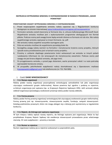 INSTRUKCJA WYPEŁNIENIA WNIOSKU O DOFINANSOWANIE W RAMACH PROGRAMU „NASZE POWIETRZE” PODSTAWOWE ZASADY WYPEŁNIANIA WNIOSKU O DOFINANSOWANIE: 1. Przed rozpoczęciem wypełniania wniosku należy zapoznać się z Regulaminem konkursu dostępnym na stronie internetowej www.krakowskialarmsmogowy.pl/naszepowietrze 2. Formularz wniosku został stworzony w formacie xlsx, tj. arkusza kalkulacyjnego Microsoft Excel. Wypełnianie wniosku możliwe jest z wykorzystaniem programów obsługujących ten format plików. Podczas oceny pod uwagę brane będą wnioski złożone w formacie xls lub xlsx. Nie należy wypełnionego wniosku zapisywać w innym formacie, np. pdf. 3. We wniosku należy wypełnić wszystkie wymagane pola. 4. Pola we wniosku możliwe do wypełniania posiadają białe tło. 5. Szczególną uwagę należy zwrócić na formalne i merytoryczne kryteria oceny projektu, których sposób oceny przedstawiony jest w kartach oceny projektu. 6. Prosimy o unikanie zbędnego powtarzania treści wskazanych we wniosku w innych polach i podawania informacji nic nie wnoszących do merytorycznej zawartości. Podczas oceny pod uwagę nie jest brana objętość wniosku, ale jego treść. 7. Po przygotowaniu wniosku, a przed jego złożeniem, warto przeczytać całość i w razie potrzeby wprowadzić konieczne zmiany. 8. W przypadku jakichkolwiek wątpliwości należy skontaktować się z Operatorem: mailowo ([email protected]) lub telefonicznie (nr 731 764 909). I. Cześć DANE WNIOSKODAWCY 1. Pole Nazwa organizacji Należy podać nazwę organizacji pozarządowej wnioskującej samodzielnie lub jako organizacja użyczająca osobowości grupie nieformalnej. Nazwa powinna być zgodna z podaną w rejestrze, w którym organizacja jest wpisana (np. w Krajowym Rejestrze Sądowym KRS). Jeśli wniosek składa oddział organizacji (posiadający osobowość prawną) należy podać nazwę oddziału. 2. Pole Forma prawna Należy podać formę prawną organizacji wnioskującej lub użyczającej osobowości grupie nieformalnej. Formą prawną jest np. stowarzyszenie, stowarzyszenie zwykłe, fundacja, związek stowarzyszeń. Katalog podmiotów prawnych, które nie mogą ubiegać się o dotację jest wymieniony w regulaminie konkursu. 3. Pole Rejestr, do którego jest wpisana organizacja W tym miejscu należy wpisać nazwę rejestru, do którego wpisana jest organizacja. Może to być przykładowo Krajowy Rejestr Sądowy lub ewidencja stowarzyszeń prowadzona przez właściwego starostę. W razie wątpliwości – prosimy o kontakt. 4. Pole Numer w rejestrze Numer organizacji nadany jej w rejestrze wskazanym w poprzednim polu. 5. Pole NIP Należy podać numer NIP organizacji. 6. Pole REGON Należy podać numer REGON organizacji. 7. Pole Adres organizacji Adres organizacji powinien znajdować się na terenie województwa małopolskiego lub śląskiego. Adres powinien być zgodny z podanym w rejestrze. Dopuszczalna jest sytuacja, kiedy wniosek składa posiadający osobowość prawną oddział organizacji, której siedziba mieści się w innym województwie. Oddział składający wniosek o dofinansowanie powinien mieć siedzibę na terenie województwa małopolskiego lub śląskiego. W przypadku projektów składanych przez oddział w omawianym polu należy podać adres oddziału. 8. Pole Telefon Telefon kontaktowy do organizacji, pozwalający na kontakt z osobami mogącymi udzielić informacji na temat wniosku. 9. Pole E-mail Adres poczty, pozwalający na kontakt z osobami mogącymi udzielić informacji na temat wniosku. Na ten adres będzie też trafiała korespondencja od Operatora, dlatego prosimy o podanie adresu, który jest regularnie sprawdzany. 10. Pole Strona internetowa Adres strony internetowej organizacji wnioskującej. W przypadku braku strony internetowej wpisać „nie dotyczy”. 11. Pole Osoby podpisujące wniosek w imieniu organizacji W przypadku zmiany władz organizacji, która nie została jeszcze potwierdzona wpisem do właściwego rejestru należy podać nowych przedstawicieli władz organizacji. Wymień osoby upoważnione do reprezentowania podmiotu (dane muszą być zgodne z oficjalnym rejestrem). Wpis do Krajowego Rejestru Sądowego lub innej ewidencji wskazuje osoby uprawnione do składania oświadczeń majątkowych – to one powinny być podpisane pod wnioskiem, w ilości i składzie opisanym we wpisie. Przykładowe wpisy do Krajowego Rejestru Sądowego lub innej ewidencji mogą brzmieć następująco: „Dla ważności oświadczeń składanych w imieniu Stowarzyszenia wymagane jest współdziałanie dwóch członków zarządu” – zapis ten oznacza, że projekt może zostać podpisany przez dwie dowolne osoby spośród zarządu, nawet jeżeli składa się on z 7 osób. „Oświadczenia woli w sprawach majątkowych Stowarzyszenia składają trzej członkowie zarządu, w tym prezes lub wiceprezes” – oznacza to, że w omawianym polu należy wskazać trzy osoby: dwóch członków zarządu oraz prezesa lub wiceprezesa. Zwróć uwagę, czy dane we wpisie w Krajowym Rejestrze Sądowym są aktualne. Może zdarzyć się sytuacja, że w podmiocie, który reprezentujesz, niedawno odbyły się wybory nowych władz, dokumenty dotyczące tej zmiany zostały wysłane w obowiązującym terminie do sądu, jednakże sprawa jest w toku i wpis w Rejestrze nie został jeszcze zmieniony. Dla potwierdzenia prawomocności nowych władz Operator może poprosić w dalszym toku naboru o przedstawienie dokumentów potwierdzających wybór nowych władz, np. uchwałę walnego zgromadzenia lub uchwałę fundatora o wyborze nowego zarządu. 12. Pole Członkowie grupy nieformalnej (jeśli dotyczy) W tym miejscu należy wymienić trzy osoby tworzące grupę nieformalną, podając ich dane adresowe oraz numery dowodu osobistego. W przypadku wniosku składanego tylko przez organizację pozarządową bez grupy nieformalnej – pole należy pozostawić niewypełnione. 13. Pole Osoba do kontaktu w sprawie wniosku Nale