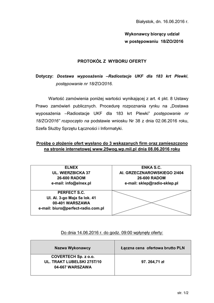 Białystok, dn. 16.06.2016 r. Wykonawcy biorący udział w postępowaniu 18/ZO/2016 PROTOKÓŁ Z WYBORU OFERTY Dotyczy: Dostawa wyposażenia –Radiostacje UKF dla 183 krt Plewki, postępowanie nr 18/ZO/2016. Wartość zamówienia poniżej wartości wynikającej z art. 4 pkt. 8 Ustawy Prawo zamówień publicznych. Procedurę rozpoznania rynku na „Dostawa wyposażenia –Radiostacje UKF dla 183 krt Plewki” postępowanie nr 18/ZO/2016” rozpoczęto na podstawie wniosku Nr 38 z dnia 02.06.2016 roku, Szefa Służby Sprzętu Łączności i Informatyki. Prośbę o złożenie ofert wysłano do 3 wskazanych firm oraz zamieszczono na stronie internetowej www.25wog.wp.mil.pl dnia 08.06.2016 roku ELNEX UL. WIERZBICKA 37 26-600 RADOM e-mail: [email protected] ENKA S.C. Al. GRZECZNAROWSKIEGO 2/404 26-600 RADOM e-mail: [email protected] PERFECT S.C. Ul. Al. 3-go Maja 5a lok. 41 00-401 WARSZAWA e-mail: [email protected] Do dnia 14.06.2016 r. do godz. 09:00 wpłynęły oferty: Nazwa Wykonawcy Łączna cena ofertowa brutto PLN COVERTECH Sp. z o.o. UL. TRAKT LUBELSKI 275T/10 04-667 WARSZAWA 97. 264,71 zł str. 1/2 PERFECT S.C. P. MIESZKOWSKI, B. TARNAWSKA Ul. Al. 3-go Maja 5a lok. 41 00-401WARSZAWA 88.858,89 zł Oferta złożona przez Wykonawcę PERFECT S.C. P. MIESZKOWSKI B. TARNAWSKA, była najkorzystniejsza cenowo oraz spełniła wszystkie wymagania formalne związane z przedmiotem zamówienia. Zamawiający udziela zamówienia Wykonawcy: PERFECT S.C. P. MIESZKOWSKI, B. TARNAWSKA Ul. Al. 3-go Maja 5a lok. 41 00-401 WARSZAWA na wartość brutto zamówienia: 88.858,89 zł (słownie: osiemdziesiąt osiem tysięcy, osiemset pięćdziesiąt osiem złotych, 89/100). KOMENDANT /-/ ppłk Robert DMUCHOWSKI Wyk. E. STALEWSKA, tel. 261 39 88 39 16.06.2016 r. T:11/40 SZP-18/ZO/2016 str. 2/2