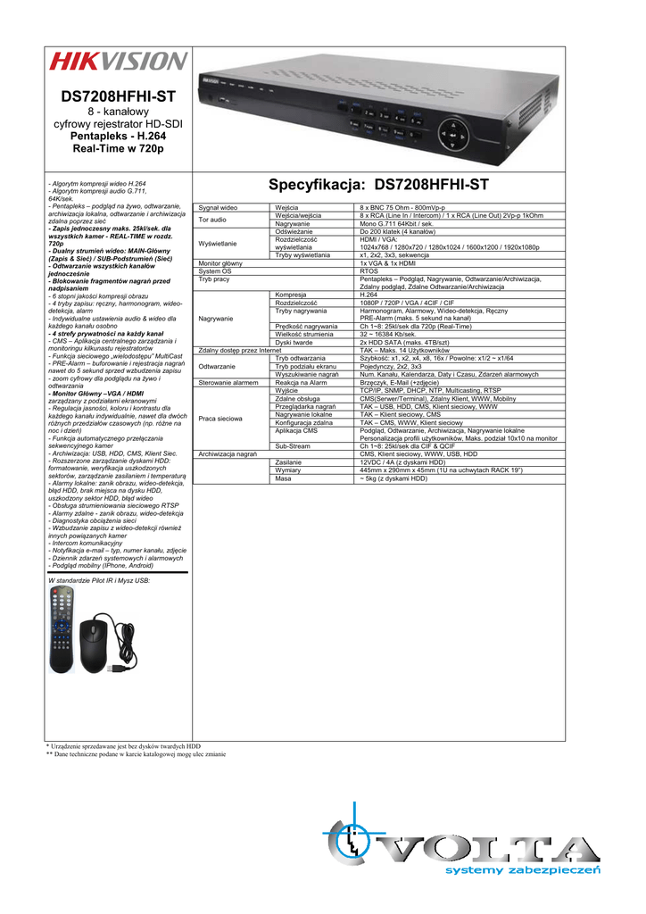 DS7208HFHI-ST 8 - kanałowy cyfrowy rejestrator HD-SDI Pentapleks - H.264 Real-Time w 720p - Algorytm kompresji wideo H.264 - Algorytm kompresji audio G.711, 64K/sek. - Pentapleks – podgląd na żywo, odtwarzanie, archiwizacja lokalna, odtwarzanie i archiwizacja zdalna poprzez sieć - Zapis jednoczesny maks. 25kl/sek. dla wszystkich kamer - REAL-TIME w rozdz. 720p - Dualny strumień wideo: MAIN-Główny (Zapis & Sieć) / SUB-Podstrumień (Sieć) - Odtwarzanie wszystkich kanałów jednocześnie - Blokowanie fragmentów nagrań przed nadpisaniem - 6 stopni jakości kompresji obrazu - 4 tryby zapisu: ręczny, harmonogram, wideodetekcja, alarm - Indywidualne ustawienia audio & wideo dla każdego kanału osobno - 4 strefy prywatności na każdy kanał - CMS – Aplikacja centralnego zarządzania i monitoringu kilkunastu rejestratorów - Funkcja sieciowego „wielodostępu” MultiCast - PRE-Alarm – buforowanie i rejestracja nagrań nawet do 5 sekund sprzed wzbudzenia zapisu - zoom cyfrowy dla podglądu na żywo i odtwarzania - Monitor Główny –VGA / HDMI zarządzany z podziałami ekranowymi - Regulacja jasności, koloru i kontrastu dla każdego kanału indywidualnie, nawet dla dwóch różnych przedziałów czasowych (np. różne na noc i dzień) - Funkcja automatycznego przełączania sekwencyjnego kamer - Archiwizacja: USB, HDD, CMS, Klient Siec. - Rozszerzone zarządzanie dyskami HDD: formatowanie, weryfikacja uszkodzonych sektorów, zarządzanie zasilaniem i temperaturą - Alarmy lokalne: zanik obrazu, wideo-detekcja, błąd HDD, brak miejsca na dysku HDD, uszkodzony sektor HDD, błąd wideo - Obsługa strumieniowania sieciowego RTSP - Alarmy zdalne - zanik obrazu, wideo-detekcja - Diagnostyka obciążenia sieci - Wzbudzanie zapisu z wideo-detekcji również innych powiązanych kamer - Intercom komunikacyjny - Notyfikacja e-mail – typ, numer kanału, zdjęcie - Dziennik zdarzeń systemowych i alarmowych - Podgląd mobilny (IPhone, Android) Specyfikacja: DS7208HFHI-ST Sygnał wideo Tor audio Wyświetlanie Wejścia Wejścia/wejścia Nagrywanie Odświeżanie Rozdzielczość wyświetlania Tryby wyświetlania Monitor główny System OS Tryb pracy Kompresja Rozdzielczość Tryby nagrywania Nagrywanie Prędkość nagrywania Wielkość strumienia Dyski twarde Zdalny dostęp przez Internet Tryb odtwarzania Odtwarzanie Tryb podziału ekranu Wyszukiwanie nagrań Sterowanie alarmem Reakcja na Alarm Wyjście Zdalne obsługa Przeglądarka nagrań Nagrywanie lokalne Praca sieciowa Konfiguracja zdalna Aplikacja CMS Sub-Stream Archiwizacja nagrań W standardzie Pilot IR i Mysz USB: * Urządzenie sprzedawane jest bez dysków twardych HDD ** Dane techniczne podane w karcie katalogowej mogę ulec zmianie Zasilanie Wymiary Masa 8 x BNC 75 Ohm - 800mVp-p 8 x RCA (Line In / Intercom) / 1 x RCA (Line Out) 2Vp-p 1kOhm Mono G.711 64Kbit / sek. Do 200 klatek (4 kanałów) HDMI / VGA: 1024x768 / 1280x720 / 1280x1024 / 1600x1200 / 1920x1080p x1, 2x2, 3x3, sekwencja 1x VGA & 1x HDMI RTOS Pentapleks – Podgląd, Nagrywanie, Odtwarzanie/Archiwizacja, Zdalny podgląd, Zdalne Odtwarzanie/Archiwizacja H.264 1080P / 720P / VGA / 4CIF / CIF Harmonogram, Alarmowy, Wideo-detekcja, Ręczny PRE-Alarm (maks. 5 sekund na kanał) Ch 1~8: 25kl/sek dla 720p (Real-Time) 32 ~ 16384 Kb/sek. 2x HDD SATA (maks. 4TB/szt) TAK – Maks. 14 Użytkowników Szybkość: x1, x2, x4, x8, 16x / Powolne: x1/2 ~ x1/64 Pojedynczy, 2x2, 3x3 Num. Kanału, Kalendarza, Daty i Czasu, Zdarzeń alarmowych Brzęczyk, E-Mail (+zdjęcie) TCP/IP, SNMP, DHCP, NTP, Multicasting, RTSP CMS(Serwer/Terminal), Zdalny Klient, WWW, Mobilny TAK – USB, HDD, CMS, Klient sieciowy, WWW TAK – Klient sieciowy, CMS TAK – CMS, WWW, Klient sieciowy Podgląd, Odtwarzanie, Archiwizacja, Nagrywanie lokalne Personalizacja profili użytkowników, Maks. podział 10x10 na monitor Ch 1~8: 25kl/sek dla CIF & QCIF CMS, Klient sieciowy, WWW, USB, HDD 12VDC / 4A (z dyskami HDD) 445mm x 290mm x 45mm (1U na uchwytach RACK 19”) ~ 5kg (z dyskami HDD)
