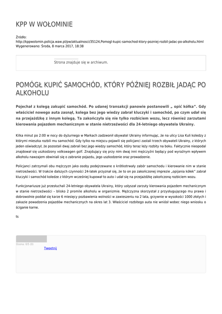 KPP W WOŁOMINIE Źródło: http://kppwolomin.policja.waw.pl/pw/aktualnosci/35124,Pomogl-kupic-samochod-ktory-pozniej-rozbil-jadac-po-alkoholu.html Wygenerowano: Środa, 8 marca 2017, 18:38 Strona znajduje się w archiwum. POMÓGŁ KUPIĆ SAMOCHÓD, KTÓRY PÓŹNIEJ ROZBIŁ JADĄC PO ALKOHOLU Pojechał z kolegą zakupić samochód. Po udanej transakcji panowie postanowili „ opić kółka”. Gdy właściciel nowego auta zasnął, kolega bez jego wiedzy zabrał kluczyki i samochód, po czym udał się na przejażdżkę z innym kolegą. Ta zakończyła się nie tylko rozbiciem wozu, lecz również zarzutami kierowania pojazdem mechanicznym w stanie nietrzeźwości dla 24-letniego obywatela Ukrainy. Kilka minut po 2:00 w nocy do dyżurnego w Markach zadzwonił obywatel Ukrainy informując, że na ulicy Lisa Kuli koledzy z którymi mieszka rozbili mu samochód. Gdy tylko na miejscu pojawili się policjanci zastali trzech obywateli Ukrainy, z których jeden oświadczył, że pozostali dwaj zabrali bez jego wiedzy samochód, który teraz leży rozbity na boku. Faktycznie nieopodal znajdował się uszkodzony volkswagen golf. Znajdujący się przy nim dwaj inni mężczyźni będący pod wyraźnym wpływem alkoholu nawzajem obwiniali się o zabranie pojazdu, jego uszkodzenie oraz prowadzenie. Policjanci zatrzymali obu mężczyzn jako osoby podejrzewane o krótkotrwały zabór samochodu i kierowanie nim w stanie nietrzeźwości. W trakcie dalszych czynności 24-latek przyznał się, że to on po zakończonej imprezie „opijania kółek” zabrał kluczyki i samochód koledze z którym wcześniej kupował to auto i udał się na przejażdżkę zakończoną rozbiciem wozu. Funkcjonariusze już przesłuchali 24-letniego obywatela Ukrainy, który usłyszał zarzuty kierowania pojazdem mechanicznym w stanie nietrzeźwości – blisko 2 promile alkoholu w organizmie. Mężczyzna skorzystał z przysługującego mu prawa i dobrowolnie poddał się karze 6 miesięcy pozbawienia wolności w zawieszeniu na 2 lata, grzywnie w wysokości 1000 złotych i zakazie powadzenia pojazdów mechanicznych na okres lat 3. Właściciel rozbitego auta nie wniósł wobec niego wniosku o ściganie karne. ts Ocena: 0/5 (0) Tweetnij