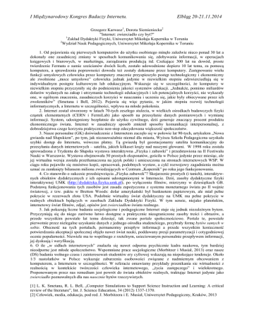 I Międzynarodowy Kongres Badaczy Internetu. Elbląg 20-21.11.2014 Grzegorz Karwasz1, Dorota Siemieniecka2 "Internet: zwierciadło czy byt?" 1 Zakład Dydaktyki Fizyki, Uniwersytet Mikołaja Kopernika w Toruniu 2 Wydział Nauk Pedagogicznych, Uniwersytet Mikołaja Kopernika w Toruniu 1. Od pojawienia się pierwszych komputerów do użytku osobistego minęło zaledwie nieco ponad 30 lat a dokonały one zasadniczej zmiany w sposobach komunikowania się, zdobywania informacji, w operacjach księgowych i biurowych, w marketingu, zarządzaniu produkcją itd. Czekające 300 lat na dowód, proste twierdzenie Fermata o sumie sześcianów dwóch liczb, zostało udowodnione dopiero 10 lat temu, za pomocą komputera, a sprawdzenia poprawności dowodu też zostały dokonane przez komputery. Zastępowanie wielu funkcji umysłowych człowieka przez komputery znacznie przyspieszyło postęp technologiczny i ekonomiczny ale zwolnione „moce umysłowe” człowieka jednak jedynie w niewielkim stopniu odzwierciedlają się w indywidualnym postępie kulturowym lub edukacyjnym. Wskazuje się w szczególności, że komputery w niewielkim stopniu przyczyniły się do podniesienia jakości systemów edukacji. „Jednakże, pomimo miliardów dolarów wydanych na zakup i utrzymanie technologii edukacyjnych i ich potencjalnych korzyści, nie wykazały one, w ogólnym znaczeniu, zasadniczych korzyści w nauczaniu i uczeniu się, jakie były obiecywane przez ich zwolenników” (Smetana i Bell, 2012). Pojawia się więc pytanie, w jakim stopniu rozwój technologii informatycznych, a Internetu w szczególności, wpływa na młode pokolenia. 2. Internet został stworzony w latach 70-tych zeszłego stulecia, w wielkich ośrodkach badawczych fizyki cząstek elementarnych (CERN i FermiLab) jako sposób na przesyłanie danych pomiarowych i wymianę informacji. System, udostępniony bezpłatnie do użytku cywilnego, dziś generuje znaczący procent produktu ekonomicznego świata. Internet w zasadniczy sposób zmienił sposoby komunikacji interpersonalnej, z dobrodziejstwa czego korzysta praktycznie non-stop zdecydowana większość społeczeństw. 3. Nasze personalne (GK) doświadczenie z Internetem zaczęło się w połowie lat 90-tych, artykułem „Nowa gwiazda nad Słupskiem”, po tym, jak niezauważalnie niemal dla miasta, Wyższa Szkoła Pedagogiczna uzyskała szybki dostęp do Internetu, wówczas płatny. Tą gwiazdą był geostacjonarny satelita komunikacyjny do przesyłania danych internetowych – satelita, jakich kilkaset krąży nad naszymi głowami. W 1998 roku została sprowadzona z Trydentu do Słupska wystawa interaktywna „Fizyka i zabawki” i przedstawiona na II Festiwalu Nauki w Warszawie. Wystawa obejmowała 50 prostych eksponatów, gościła w Polsce jedynie przez miesiąc, ale jej wirtualna wersja została przetłumaczona na język polski i umieszczona na stronach internetowych WSP. W ciągu roku pojawiło się mnóstwo kopii, opracowań, podobnych wystaw, a cykl rozwojowy zagadnienia można uznać za zamknięty bilansem miliona zwiedzających w Centrum „Kopernik” po roku jego funkcjonowania. 4. Co stanowiło o sukcesie przedsięwzięcia „Fizyka zabawek”? Skojarzenie prostych (i tanich), interaktywnych obiektów dydaktycznych z ich opisami udostępnionymi w Internecie. Dziś, zasoby dydaktyczne fizyki interaktywnej UMK (http://dydaktyka.fizyka.umk.pl), po wyłączeniu filmów, mierzymy w dziesiątkach GB. Podstawą funkcjonowania tych zasobów jest zasada zapożyczona z systemu monetarnego świata po II wojnie światowej, z tzw. paktu w Bretton Woods: dolar amerykański był banknotem papierowym, ale miał pełne pokrycie w rezerwach złota USA. Podobnie wirtualny świat dydaktyczny na UMK ma pełne pokrycie w realnych obiektach będących w zasobach Zakładu Dydaktyki Fizyki. W tym sensie, niejako platońskim, internetowy świat filmów, zdjęć, opisów jest zwierciadłem świata realnego. 5. Jak pokazują liczne badania socjologiczne i pedagogiczne Internet staje się jednak niezależnym bytem. Przyczyniają się do niego zarówno łatwo dostępne a praktycznie nieograniczone zasoby treści i obrazów, a przede wszystkim powstałe lat temu dziesięć, tak zwane portale społecznościowe. Portale te, powstałe pierwotnie przez nielegalne uzyskanie danych z jednego ośrodka studenckiego, przybrały formę bytów samych w sobie. Obecność na tych portalach, permanentny przepływ informacji a przede wszystkim konieczność potwierdzania akceptacji społecznej objęło nawet świat nauki, poddawany presji parametryzacji i cotygodniowej ocenie popularności. Niewiele ma to wspólnego z rzetelnym, usieciowanym personalnie przepływem informacji, jej dyskusją i weryfikacją. 6. O ile „w sidłach internetowych” znalazła się nawet odporna psychicznie kadra naukowa, tym bardziej nieodporne jest młode społeczeństwo. Wspomniane prace socjologiczne (Morbitzer i Musiał, 2013) oraz nasze (DS) badania wolnego czasu i zainteresowań studentów ery cyfrowej wskazują na niepokojące tendencje. Około 1/3 nastolatków w Polsce wykazuje zaburzenia osobowości związane z nadmiernym obcowaniem z komputerem, a Internetem w szczególności. W referacie omawiamy przykłady przenikania sie wirtualności z realnością w kontekście twórczości człowieka internetowego, „życia zastępczego” i wielokrotnego. Proponowanym przez nas remedium jest powrót do świata obiektów realnych, traktując Internet jedynie jako zwierciadło poznawalnych dla nas naocznie bytów rzeczywistych. [1] L. K. Smetana, R. L. Bell, „Computer Simulations to Support Science Instruction and Learning: A critical review of the literature”, Int. J. Science Education, 34 (2012) 1337-1370. [2] Człowiek, media, edukacja, pod red. J. Morbitzera i E. Musiał, Uniwersytet Pedagogiczny, Kraków, 2013