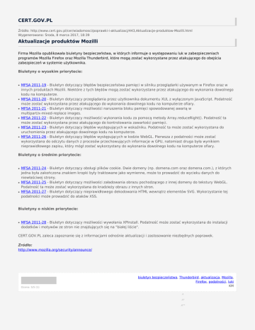 CERT.GOV.PL Źródło: http://www.cert.gov.pl/cer/wiadomosci/poprawki-i-aktualizacj/443,Aktualizacje-produktow-Mozilli.html Wygenerowano: Środa, 8 marca 2017, 18:39 Aktualizacje produktów Mozilli Firma Mozilla opublikowała biuletyny bezpieczeństwa, w których informuje o występowaniu luk w zabezpieczeniach programów Mozilla Firefox oraz Mozilla Thunderbird, które mogą zostać wykorzystane przez atakującego do obejścia zabezpieczeń w systemie użytkownika. Biuletyny o wysokim priorytecie: ● ● ● ● ● ● MFSA 2011-19 - Biuletyn dotyczący błędów bezpieczeństwa pamięci w silniku przeglądarki używanym w Firefox oraz w innych produktach Mozilli. Niektóre z tych błędów mogą zostać wykorzystane przez atakującego do wykonania dowolnego kodu na komputerze. MFSA 2011-20 - Biuletyn dotyczący przeglądania przez użytkownika dokumentu XUL z wyłączonym JavaScript. Podatność może zostać wykorzystana przez atakującego do wykonania dowolnego kodu na komputerze ofiary. MFSA 2011-21 - Biuletyn dotyczący możliwości naruszenia bloku pamięci spowodowanej awarią w multipart/x-mixed-replace images. MFSA 2011-22 - Biuletyn dotyczący możliwości wykonania kodu za pomocą metody Array.reduceRight(). Podatność ta może zostać wykorzystana przez atakującego do kontrolowania zawartości pamięci. MFSA 2011-23 - Biuletyn dotyczący błędów występujących w wskaźniku. Podatność ta może zostać wykorzystana do uruchomienia przez atakującego dowolnego kodu na komputerze. MFSA 2011-26 - Biuletyn dotyczący błędów występujących w kodzie WebGL. Pierwsza z podatności może zostać wykorzystana do odczytu danych z procesów przechowujących informacje w GPU, natomiast druga była wynikiem nieprawidłowego zapisu, który mógł zostać wykorzystany do wykonania dowolnego kodu na komputerze ofiary. Biuletyny o średnim priorytecie: ● ● ● MFSA 2011-24 - Biuletyn dotyczący obsługi plików cookie. Dwie domeny (np. domena.com oraz domena.com.), z których jedna była zakończona znakiem kropki były traktowane jako wymienne, może to prowadzić do wycieku danych do niewłaściwej strony. MFSA 2011-25 - Biuletyn dotyczący możliwości załadowania obrazu pochodzącego z innej domeny do tekstury WebGL. Podatność ta może zostać wykorzystana do kradzieży obrazu z innych stron. MFSA 2011-27 - Biuletyn dotyczący nieprawidłowego dekodowania HTML wewnątrz elementów SVG. Wykorzystanie tej podatności może prowadzić do ataków XSS. Biuletyny o niskim priorytecie: ● MFSA 2011-28 - Biuletyn dotyczący możliwości wywołania XPInstall. Podatność może zostać wykorzystana do instalacji dodatków i motywów ze stron nie znajdujących się na "białej liście". CERT.GOV.PL zaleca zapoznanie się z informacjami odnośnie aktualizacji i zastosowanie niezbędnych poprawek. Źródło: http://www.mozilla.org/security/announce/ Ocena: 5/5 (1) biuletyn bezpieczeństwa, Thunderbird, aktualizacja, Mozilla, Firefox, podatności, luki KM