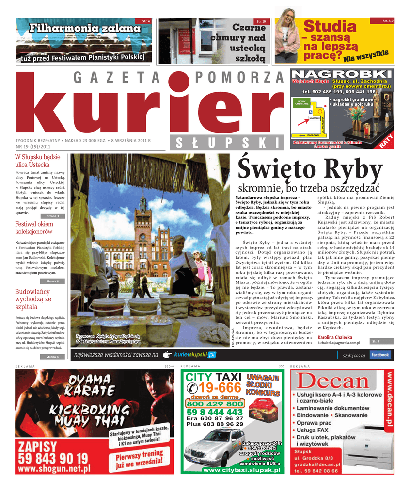 Filharmonia zalana Str. 6 Studia Str. 10 Czarne chmury nad ustecką szkołą kiiej tuż przed Festiwalem Pianistyki Polsk Str. 8-9 – szansą na lepszą pracę? Nie wszystkie NAGROBKI :RMFLHFK.XSLV 6ãXSVNXO=DFKRGQLD SU]\QRZ\PFPHQWDU]X WHO ¯ XKQ\YLUS Q\KXS^YaO ¯ _U¤KNKXSO ZYVL\_U_ '$5à2:2 TYGODNIK BEZPŁATNY • NAKŁAD 23 000 EGZ. • 8 WRZEŚNIA 2011 R. =DãDWZLDP\IRUPDOQRĤFLXNOLHQWD âDZNDJUDWLV NR 19 (19)/2011 W Słupsku będzie ulica Ustecka Święto Ryby Powraca temat zmiany nazwy ulicy Portowej na Ustecką. Powstania ulicy Usteckiej w Słupsku chcą usteccy radni. Złożyli wniosek do władz Słupska w tej sprawie. Jeszcze we wrześniu słupscy radni mają podjąć decyzję w tej sprawie. skromnie, bo trzeba oszczędzać Sztandarowa słupska impreza – Święto Ryby, jednak się w tym roku odbędzie. Będzie skromna, bo miasto szuka oszczędności w miejskiej kasie. Tymczasem podobne imprezy, o tematyce rybnej, organizują za unijne pieniądze gminy z naszego powiatu. Strona 3 Festiwal okiem kolekcjonerów Najważniejsze pamiątki związane z Festiwalem Pianistyki Polskiej stara się przybliżyć słupszczanom Jan Radkowski. Kolekcjoner wydał właśnie książkę poświęconą festiwalowym medalom oraz stemplom pocztowym. Strona 4 Fot. APR-SAS Budowlańcy wychodzą ze szpitala Kończy się budowa słupskiego szpitala. Fachowcy wykonują ostatnie prace. Nadal jednak nie wiadomo, kiedy szpital zostanie otwarty. Za tydzień budowlańcy opuszczą teren budowy szpitala przy ul. Hubalczyków. Słupski szpital zacznie się na dobre przeprowadzać. Tegoroczne Święto Ryby odbędzie się 17 i 18 września na Placu Zwycięstwa. Święto Ryby – jedna z ważniejszych imprez od lat traci na atrakcyjności. Dotąd organizowano ją latem, były występy gwiazd, plac Zwycięstwa tętnił życiem. Od kilku lat jest coraz skromniejsza – w tym roku jej datę kilka razy przesuwano, miała się odbyć w ramach Święta Miasta, później mówiono, że w ogóle jej nie będzie. - To prawda, zastanawialiśmy się, czy w tym roku organizować piętnastą już edycję tej imprezy, po odezwie ze strony mieszkańców i wystawców prezydent zdecydował się jednak przeznaczyć pieniądze na ten cel – mówi Mariusz Smoliński, rzecznik prezydenta. Impreza, dwudniowa, będzie skromna, bo w tegorocznym budżecie nie ma zbyt dużo pieniędzy na promocję, w związku z utworzeniem Strona 4 REKLAMA R AT Y NAGROBKI UL. ZACHODNIA NOWY CMENTARZ 510-0 REKLAMA 355 REKLAMA spółki, która ma promować Ziemię Słupską. - Jednak na pewno program jest atrakcyjny – zapewnia rzecznik. Radny miejski z PiS Robert Kujawski jest zdziwiony, że miasto znalazło pieniądze na organizację Święta Ryby. - Przede wszystkim patrząc na płynność finansową z 22 sierpnia, którą właśnie mam przed sobą, w kasie miejskiej brakuje ok 14 milionów złotych. Słupsk nie potrafi, tak jak inne gminy, pozyskać pieniędzy z Unii na promocję, jestem więc bardzo ciekawy skąd pan prezydent te pieniądze weźmie. Tymczasem imprezy promujące jedzenie ryb, ale z dużą unijną dotacją, sięgającą kilkudziesięciu tysięcy złotych, organizują także sąsiednie gminy. Tak robiła najpierw Kobylnica, która przez kilka lat organizowała Pikniki z ikrą, w tym roku w czerwcu taką imprezę organizowała Dębnica Kaszubska, za tydzień festyn rybny z unijnych pieniędzy odbędzie się w Kępicach. Karolina Chalecka [email protected] Str. 7 nr 19 (19) • 8 września 2011 SŁUPSKA OPINIA PUBLICZNA Mieszkańców Słupska zapytaliśmy, czy ulica Portowa powinna zmienić nazwę na Ustecką? ? NIE TAK 27% 20% Halina Ilsa s³upszczanka 53% wydarzenia i opinie 2 NIE MAM ZDANIA G£OSOWANIE NA WWW.KURIERSLUPSKI.PL KOMENTARZ moim Marta Bakowska s³upszczanka Helena Pawlak s³upszczanka Zofia Æwik³a s³upszczanka - Jak najbardziej. To - Wypadałoby, aby w Ulica P o r t o w a - Miasta współpracują, droga na Ustkę, więc Słupsku była taka ulica. p o w i n n a zmienić dlatego jestem jak najt a k b y ł o b y ł a t w i e j Przecież razem z Ustką nazwę na Ustecką, bardziej za tym, żeby nawet określić kieru- tworzymy Dwumiasto. bo przede wszystkim taka ulica w naszym nek. Teraz to trzeba się W Ustce jest ulica znajduje się na wylocie mieście była. Najlepiej zastanawiać, gdzie ta Słupska, więc u nas też w kierunku na Ustkę. gdyby to była wyloPortowa jest. powinna być. Portowa Tak samo powinno być tówka na Ustkę. nadaje się idealnie. na przykład z wylotem na Darłowo. KRESKĄ ARAKDIUSZA SZADKOWSKIEGO Jak świêtowaæ to podwójnie Patrząc na nasz region można pomyzdaniem -śleć, że jesteśmy wyjątkowo bogaci, Tomasz Częścik dziennikarz mocno skłóceni lub nie działamy wspólnie. W jednym czasie robimy dwie podobne imprezy związane z rybami. Bogactwo niestety odpada, o kłótniach między samorządowcami w Słupsku i Kępicach nie słychać, więc pozostaje trzeci wariant – brak koordynacji działania przy organizacji imprez. Niestety, kolejny raz ta płaszczyzna współpracy u nas kuluje. Widać to było wyraźnie chociażby w podsumowaniu sezonu letniego, gdzie imprezy się pokrywały. Ma to zmienić nowa słupska promocja. Jednak start jej nie bardzo wyszedł. Specjaliści, którzy mają zająć się promocją, organizacją i koordynacją imprez planując Święto Ryby, którego w tym roku miało nie być, nie spojrzeli w kalendarz i nie sprawdzili, że rybne party w tym terminie przygotowują Kępice. Miastu pozostaje mieć nadzieję, że słupszczanie będą leniwi i nie pojadą do odległych o 30 kilometrów Kępic. Ponadto niewielkiej miejscowości udało się na zabawę wyciągnąć pieniądze z Unii, a Słupsk robi to z własnego, mocno napiętego budżetu. Mimo że Święto Ryby miało się nie odbyć w tym roku i od lat traci na randze, w imprezę warto zainwestować. Powinna odbyć się ponad wszelkimi podziałami, z udziałem wszystkich samorządów z naszego terenu. Wszak rybą po