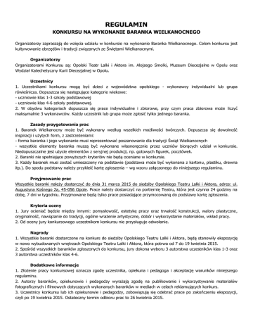 REGULAMIN KONKURSU NA WYKONANIE BARANKA WIELKANOCNEGO Organizatorzy zapraszają do wzięcia udziału w konkursie na wykonanie Baranka Wielkanocnego. Celem konkursu jest kultywowanie obrzędów i tradycji związanych ze Świętami Wielkanocnymi. Organizatorzy Organizatorami Konkursu są: Opolski Teatr Lalki i Aktora im. Alojzego Smolki, Muzeum Diecezjalne w Opolu oraz Wydział Katechetyczny Kurii Diecezjalnej w Opolu. Uczestnicy 1. Uczestnikami konkursu mogą być dzieci z województwa opolskiego - wykonawcy indywidualni lub grupa rówieśnicza. Dopuszcza się następujące kategorie wiekowe: - uczniowie klas 1-3 szkoły podstawowej - uczniowie klas 4-6 szkoły podstawowej. 2. W obydwu kategoriach dopuszcza się prace indywidualne i zbiorowe, przy czym praca zbiorowa może liczyć maksymalnie 3 wykonawców. Każdy uczestnik lub grupa może zgłosić tylko jednego baranka. Zasady przygotowania prac 1. Baranek Wielkanocny może być wykonany według wszelkich możliwości twórczych. Dopuszcza się dowolność inspiracji i użytych form, z zastrzeżeniami: - forma baranka i jego wykonanie musi reprezentować poszanowanie dla tradycji Świąt Wielkanocnych - wszystkie elementy baranka muszą być wykonane własnoręcznie przez uczniów biorących udział w konkursie. Niedopuszczalne jest użycie elementów z seryjnej produkcji, np. gotowych figurek, pocztówek. 2. Baranki nie spełniające powyższych kryteriów nie będą oceniane w konkursie. 3. Każdy baranek musi zostać umieszczony na podstawie (podstawa może być wykonana z kartonu, plastiku, drewna itp.). Do spodu podstawy należy przykleić kartę zgłoszenia – wg wzoru załączonego do niniejszego regulaminu. Przyjmowanie prac Wszystkie baranki należy dostarczyć do dnia 31 marca 2015 do siedziby Opolskiego Teatru Lalki i Aktora, adres: ul. Augustyna Kośnego 2a, 45-056 Opole. Prace należy dostarczyć na portiernię Teatru, która jest czynna 24 godziny na dobę, 7 dni w tygodniu. Przyjmowane będą tylko prace posiadające przymocowaną do podstawy kartę zgłoszenia. Kryteria oceny 1. Jury ocieniać będzie między innymi: pomysłowość, estetykę pracy oraz trwałość konstrukcji, walory plastyczne, oryginalność, nawiązanie do tradycji, ogólne wrażenie artystyczne, dobór i wykorzystanie materiałów, wkład pracy. 2. Od oceny jury konkursowego uczestnikom konkursu nie przysługuje odwołanie. Nagrody 1. Wszystkie baranki dostarczone na konkurs do siedziby Opolskiego Teatru Lalki i Aktora, będą stanowiły ekspozycję w nowo wybudowanych wnętrzach Opolskiego Teatru Lalki i Aktora, która potrwa od 7 do 19 kwietnia 2015. 2. Spośród wszystkich baranków zgłoszonych do konkursu, jury dokona wyboru 3 autorstwa uczestników klas 1-3 oraz 3 autorstwa uczestników klas 4-6. Dodatkowe informacje 1. Złożenie pracy konkursowej oznacza zgodę uczestnika, opiekuna i pedagoga i akceptację warunków niniejszego regulaminu. 2. Autorzy baranków, opiekunowie i pedagodzy wyrażają zgodę na publikowanie i wykorzystywanie materiałów fotograficznych i filmowych dotyczących wykonanych baranków w mediach w celach reklamujących konkurs. 3. Uczestnicy konkursu lub ich opiekunowie i pedagodzy, zobowiązują się odebrać prace po zakończeniu ekspozycji, czyli po 19 kwietnia 2015. Ostateczny termin odbioru prac to 26 kwietnia 2015.