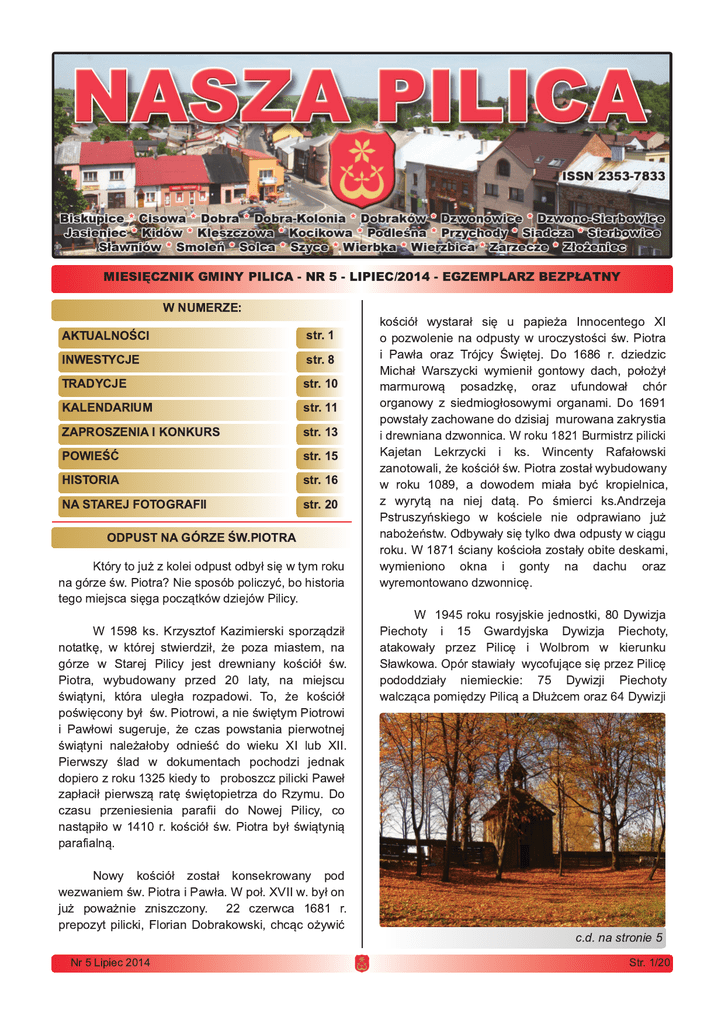 MIESIĘCZNIK GMINY PILICA - NR 5 - LIPIEC/201 4 - EGZEMPLARZ BEZPŁATNY W NUMERZE: AKTUALNOŚCI INWESTYCJE TRADYCJE KALENDARIUM ZAPROSZENIA I KONKURS POWIEŚĆ HISTORIA NA STAREJ FOTOGRAFII str. 1 str. 8 str. 1 0 str. 11 str. 1 3 str. 1 5 str. 1 6 str. 20 ODPUST NA GÓRZE ŚW.PIOTRA Który to już z kolei odpust odbył się w tym roku na górze św. Piotra? Nie sposób policzyć, bo historia tego miejsca sięga początków dziejów Pilicy. W 1 598 ks. Krzysztof Kazimierski sporządził notatkę, w której stwierdził, że poza miastem, na górze w Starej Pilicy jest drewniany kościół św. Piotra, wybudowany przed 20 laty, na miejscu świątyni, która uległa rozpadowi. To, że kościół poświęcony był św. Piotrowi, a nie świętym Piotrowi i Pawłowi sugeruje, że czas powstania pierwotnej świątyni należałoby odnieść do wieku XI lub XII. Pierwszy ślad w dokumentach pochodzi jednak dopiero z roku 1 325 kiedy to proboszcz pilicki Paweł zapłacił pierwszą ratę świętopietrza do Rzymu. Do czasu przeniesienia parafii do Nowej Pilicy, co nastąpiło w 1 41 0 r. kościół św. Piotra był świątynią parafialną. Nowy kościół został konsekrowany pod wezwaniem św. Piotra i Pawła. W poł. XVII w. był on już poważnie zniszczony. 22 czerwca 1 681 r. prepozyt pilicki, Florian Dobrakowski, chcąc ożywić Nr 5 Lipiec 201 4 kościół wystarał się u papieża Innocentego XI o pozwolenie na odpusty w uroczystości św. Piotra i Pawła oraz Trójcy Świętej. Do 1 686 r. dziedzic Michał Warszycki wymienił gontowy dach, położył marmurową posadzkę, oraz ufundował chór organowy z siedmiogłosowymi organami. Do 1 691 powstały zachowane do dzisiaj murowana zakrystia i drewniana dzwonnica. W roku 1 821 Burmistrz pilicki Kajetan Lekrzycki i ks. Wincenty Rafałowski zanotowali, że kościół św. Piotra został wybudowany w roku 1 089, a dowodem miała być kropielnica, z wyrytą na niej datą. Po śmierci ks.Andrzeja Pstruszyńskiego w kościele nie odprawiano już nabożeństw. Odbywały się tylko dwa odpusty w ciągu roku. W 1 871 ściany kościoła zostały obite deskami, wymieniono okna i gonty na dachu oraz wyremontowano dzwonnicę. W 1 945 roku rosyjskie jednostki, 80 Dywizja Piechoty i 1 5 Gwardyjska Dywizja Piechoty, atakowały przez Pilicę i Wolbrom w kierunku Sławkowa. Opór stawiały wycofujące się przez Pilicę pododdziały niemieckie: 75 Dywizji Piechoty walcząca pomiędzy Pilicą a Dłużcem oraz 64 Dywizji c.d. na stronie 5 Str. 1 /20 Informacje i aktualności AKTUALNOŚCI UROCZYSTOŚĆ W DZWONO-SIERBOWICACH Na uroczystość przekazania po modernizacji Remizy OSP w Dzwono-Sierbowicach, przekształconej na świetlice wiejską, przybyli: v-ce marszałek województwa śląskiego Stanisław Dąbrowa, radny sejmiku województwa śląskiego Witod Grim, przewodniczący Rady Powiatu zawierciańskiego Adam Rozlach, komendant PSP w Zawierciu bryg. Marek Fiutak, burmistrz Miasta i Gminy Pilica Michał Otrebski, Prezes Zarządu Odziału Miejsko-Gminnego Związku OSP w Pilicy i przewodniczacy Rady Miasta i Gminy w Pilicy Jan Pająk, sekretarz Urzędu Miasta i Gminy w Pilicy Janina Dulbińska-Przybylik, dyrektor Szkoły Podstawowej nr 3 w Dzwono-Sierbowicach Stanisława Uliniarz, gwardian o.Wacław Bujak, radny Grzegorz Bomba, komendant gminny OSP Adam Przybylik, sołtys wsi Dzwono-Sierbowice Marian Odyjas, wykonawcy modernizacji obiektu Kazimierz i Marian Lipińscy, poczty sztandarowe i delegacje jednostek OSP, Młodzieżowa Orkiestra Dęta przy OSP Dzwono-Sierbowice, mieszkańcy i goście. Uroczystość rozpoczęła się wprowadzeniem przez naczelnika OSP Dzwono-Sierbowice jednostek OSP na miejsce uroczystości. Msze świętą w intencji wszystkich strażaków i mieszkańców wsi odprawił o. gwardian Wacław Bujak. Po mszy św. dh Mariusz Pelon złożył raport komendantowi Powiatowej Straży Pożarnej w Zawierciu brygadierowi Markowi Fiutakowi. Nastąpiło wciągnięcie flagi na maszt, po którym prezes OSP Dzwono-Sierbowice powitał zaproszonych gości oraz odczytał historię jednostki OSP w Dzwono-Sierbowicach. Ojciec gwardian poświęcił budynek, a burmistrz Michał Otrębski i przewodniczący Rady Miasta i Gminy wręczyli akt przekazania obiektu i dokonali przecięcia wstęgi. Po ceremoni otwarcia nastąpiło odznaczenie zasłu- Nasza Pilica żonych druhów z jednostki OSP Dzwono-Sierbowice. Odznakę za wysługę lat z rąk komendanta PSP w Zawierciu bryg. Marka Fiutaka i prezesa Jana Pająka otrzymali Stanisław Więckowski, Henryk Dylkowski, Czesław Dylkowski, którzy służą w OSP od 50 lat. Następnie głos zabrali zaproszeni goście. Na zakończenie prezes podziękował uczestnikom uroczystości za oprawę duchową, gościom za uświetnienie uroczystości i władzom gminy, na czele z burmistrzem, za przeznaczenie środków z budżetu gminy na modernizację obiektu. Zarząd OSP Dzwono-Sierbowice BOŻE CIAŁO Procesja Bożego Ciała w Pilicy O tradycjach związanych z obchodami Bożego Ciała pisalismy w poprzednim numerze. Trasa tegorocznej procesji była odmienna od tradycyjnej ze względu na remonty ulic i rynku. Biegła od kościoła farnego ulicami: Senatorską, Marii Magdaleny Epstein i Krakowską do rynku. Nietypowy przebieg mają od lat obchody Bożego Ciała w kościele pw. Najświętszego Imienia Jezus w Dzwono-Sierbowicach. Wokół kościoła znajduje się pięć ołtarzy. Każdym z nich opiekuje się inna wieś. Tradycyjnie procesja w dniu Bożego Ciała odbywa się do czterech ołtarzy. Który pominąć? Przekazanie remizy w Dzwono-Sierbowicach Str. 2/20 Znalazło się salomonowe rozwiązanie. Na zakończenie procesji przy piątym ołtarzu, każdego roku przy innym, kapłan udziela błogosławieństwa wiernym. Tradycji staje się zadość, a żadna ze wsi nie jest "poszkodowana". [Redakcja] Nr 5 Lipiec 201 4 Nasza Pilica Informacje i aktualności WYRÓŻNIENIE DLA "DRUGIEJ STRONY CISZY" Druga Strona Ciszy 21 czerwca odbył się w Cz