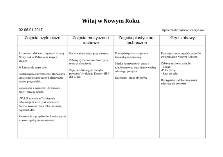 Witaj w Nowym Roku. 02-05.01.2017 Zajęcia czytelnicze Rozmowa z dziećmi, o tym jak witamy Nowy Rok w Polsce oraz innych krajach. Opracowała: Sylwia Gorczyńska Zajęcia muzyczne i ruchowe Karnawałowe tańce przy muzyce. Zabawy rytmiczno-ruchowe przy muzyce dziecięcej. W karnawale same bale. Postanowienia noworoczne. Rozwijanie umiejętności samooceny i planowania swojej przyszłości. Zapoznanie z wierszem „Dwunastu braci” Jerzego Kirsta. „Wokół kalendarza”- zbieranie informacji nt. co to jest kalendarz? Podział roku na: pory roku, miesiące, tygodnie, dni. Zapoznanie z przysłowiami związanymi z poszczególnymi miesiącami. Zajęcia relaksacyjne muzyka poważna Vivaldiego Koncert III Fdur Zima. Zajęcia plastycznotechniczne Gry i zabawy Praca plastyczna związana z tematyką noworoczną. Rozwiązywanie zagadek, rebusów związanych z Nowym Rokiem. Maska karnawałowa- praca z szablonem oraz ozdabianie według własnego pomysłu. Zabawy ruchowe na holu: - Zbijak -Piłka parzy - Rzut do celu Kalendarz- praca zbiorowa. Rozsypanka – dobieranie nazw miesięcy do pór roku. Zima wokół nas. 09-13.01.2017 Zajęcia czytelnicze Dbanie o higienę zdrowotną podczas zimy. Obserwacja pogody podczas zimy. Tropimy ślady na śniegu. Rozmowa kierowana: ślady jakich zwierząt możemy zobaczyć na śniegu. Opracowała: Sylwia Gorczyńska Zajęcia muzyczne i ruchowe Zajęcia plastycznotechniczne Gry i zabawy Zagadki i rebusy zimowe. Zabawy i ćwiczenia rytmiczne. Pejzaż zimowy- technika dowolna. Zajęcia relaksacyjne- zabawy paluszkowe. Zabawy konstrukcyjnie. Czapka, rękawiczki- wydzieranka. Masażyki dziecięce. Wspólne śpiewanie piosenek zimowych. Wykonanie rysunku przedstawiającego zabawy na śniegu. Gry i zabawy z chustą animacyjną. Ślady zwierząt. Zabawy z elementami rzutu, celowania i toczenia rozwijające koordynację ruchową. Słuchowiska. Ćwiczenia oddechowe. Gry planszowe. „Królowa śniegu”- czytanie bajki oraz rozmowa z dziećmi nt. przeczytanego utworu. Budzenie szacunku i wrażliwości dla osób starszych. Dzień Babci i Dziadka. 16-20.01.2017 Zajęcia czytelnicze Rozmowa na temat szacunku dla osób starszych. Opracowała: Sylwia Gorczyńska Zajęcia muzyczne Portret babci i dziadka- technika dowolna. „U babci słodko jest”, „Najdroższy dziadku”- nauka słów i wspólne śpiewanie. Laurka dla dziadków. Swobodne wypowiedzi dzieci o chwilach spędzonych z babcią i dziadkiem. Słuchanie piosenek związanych z tematem tygodnia. Za co kochamy naszych dziadków?- burza mózgów. Zajęcia relaksacyjne z muzyką klasyczną. Redagowanie życzeń dla babci i dziadka. Czytanie opowiadania „Babcia też człowiek” I. Landau Zajęcia plastycznotechniczne Ramka na zdjęcie- praca plastyczno- techniczna. Gry i zabawy Zabawy taneczne. „ Kto pierwszy”- ćwiczenie koncentracji i spostrzegawczości. „Pająk i muchy” „Pomnik” Gry planszowe W krainie bajek i baśni. 23-27.01.2017 Zajęcia czytelnicze Opracowała: Sylwia Gorczyńska Zajęcia muzyczne Moja ulubiona bajka, baśńrozmowa i prezentacja ulubionych Zabawy ruchowe w kole z książek. muzyką. Dlaczego warto czytać książki? – burza mózgów. Kształtowanie nawyków szanowania książek. Rola książki jako źródło wzruszeń i wiedzy o świecie. H. Ch. Andersen- człowiek, który wyczarował najpiękniejsze baśnie. Zapoznanie dzieci z sylwetą pisarza. Czytanie i opowiadanie różnych bajek i baśni. Słuchanie muzyki relaksacyjnej. Słuchowiska- znane baśnie Braci Grimm. Słuchanie bajek i baśni z płyt CD. Zabawy dźwiękonaśladowcze. Zajęcia plastycznotechniczne Gry i zabawy Zaprojektowanie okładki ulubionej książki. Porządkowanie książek w świetlicowej biblioteczce. Ulubiony baśniowy bohatertechnika dowolna. Rozwiązywanie zagadek tematycznych. Zakładka do książki. Ćwiczenia zręcznościowe z piłką na holu. Układanie puzzli tematycznych. „Prawda czy fałsz”- zagadki podsumowujące temat tygodnia.