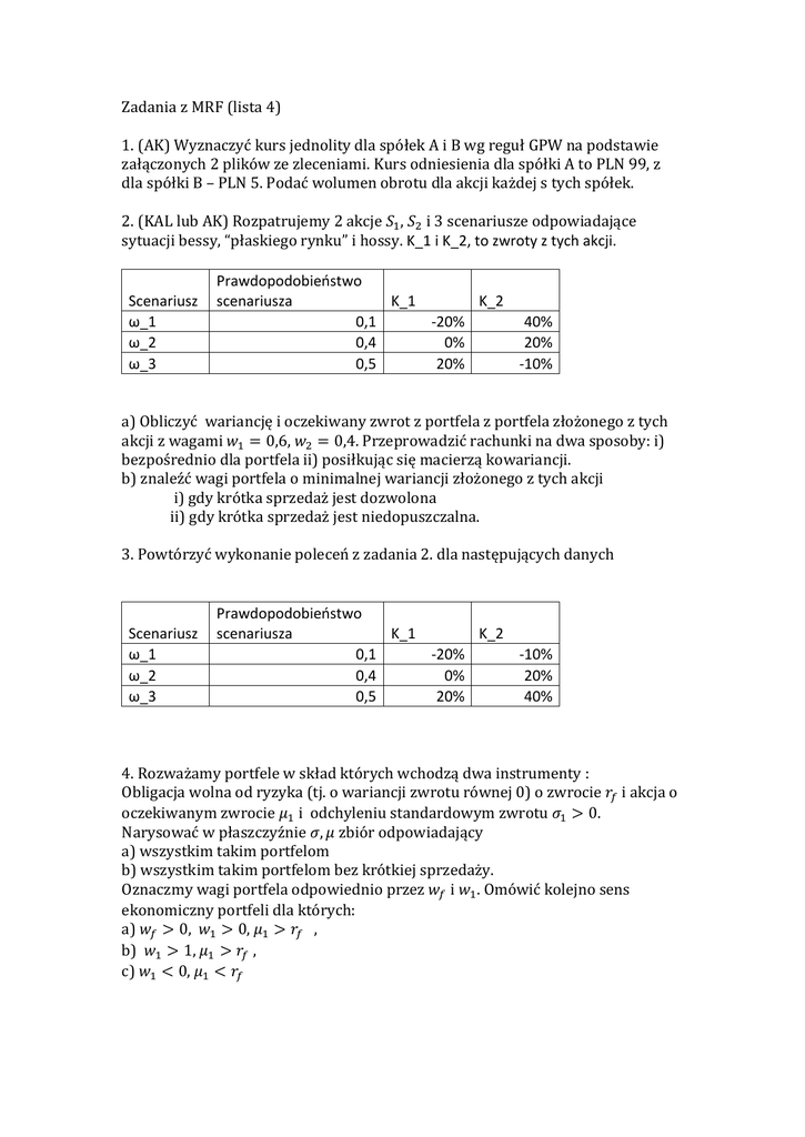 Zadania z MRF (lista 4) 1. (AK) Wyznaczyć kurs jednolity dla spółek A i B wg reguł GPW na podstawie załączonych 2 plików ze zleceniami. Kurs odniesienia dla spółki A to PLN 99, z dla spółki B – PLN 5. Podać wolumen obrotu dla akcji każdej s tych spółek. 2. (KAL lub AK) Rozpatrujemy 2 akcje 𝑆! , 𝑆! i 3 scenariusze odpowiadające sytuacji bessy, “płaskiego rynku” i hossy. K_1 i K_2, to zwroty z tych akcji. Prawdopodobieństwo Scenariusz scenariusza K_1 K_2 ω_1 0,1 -‐20% 40% ω_2 0,4 0% 20% ω_3 0,5 20% -‐10% a) Obliczyć wariancję i oczekiwany zwrot z portfela z portfela złożonego z tych akcji z wagami 𝑤! = 0,6, 𝑤! = 0,4. Przeprowadzić rachunki na dwa sposoby: i) bezpośrednio dla portfela ii) posiłkując się macierzą kowariancji. b) znaleźć wagi portfela o minimalnej wariancji złożonego z tych akcji i) gdy krótka sprzedaż jest dozwolona ii) gdy krótka sprzedaż jest niedopuszczalna. 3. Powtórzyć wykonanie poleceń z zadania 2. dla następujących danych Prawdopodobieństwo Scenariusz scenariusza K_1 K_2 ω_1 0,1 -‐20% -‐10% ω_2 0,4 0% 20% ω_3 0,5 20% 40% 4. Rozważamy portfele w skład których wchodzą dwa instrumenty : Obligacja wolna od ryzyka (tj. o wariancji zwrotu równej 0) o zwrocie 𝑟! i akcja o oczekiwanym zwrocie 𝜇! i odchyleniu standardowym zwrotu 𝜎! > 0. Narysować w płaszczyźnie 𝜎, 𝜇 zbiór odpowiadający a) wszystkim takim portfelom b) wszystkim takim portfelom bez krótkiej sprzedaży. Oznaczmy wagi portfela odpowiednio przez 𝑤! i 𝑤! . Omówić kolejno sens ekonomiczny portfeli dla których: a) 𝑤! > 0, 𝑤! > 0, 𝜇! > 𝑟! , b) 𝑤! > 1, 𝜇! > 𝑟! , c) 𝑤! < 0, 𝜇! < 𝑟!