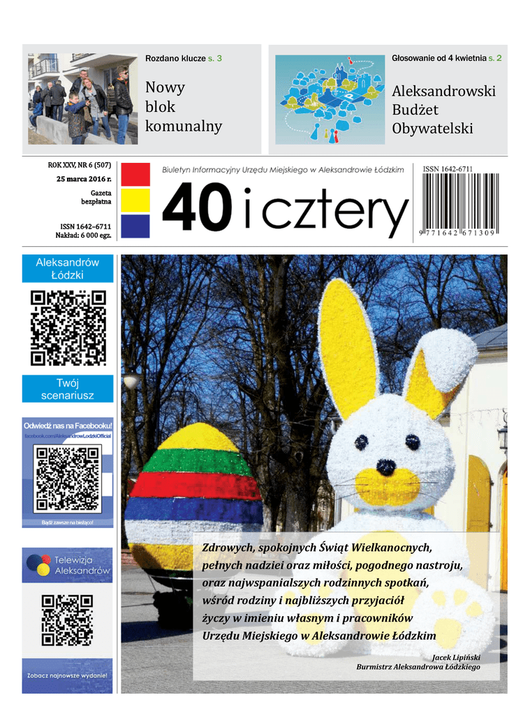 ROK XXV, NR 6 (507) Rozdano klucze s. 3 Głosowanie od 4 kwietnia s. 2 Nowy blok komunalny Aleksandrowski Budżet Obywatelski 25 marca 2016 r. Gazeta bezpłatna ISSN 1642–6711 Nakład: 6 000 egz. Zdrowych, spokojnych Świąt Wielkanocnych, pełnych nadziei oraz miłości, pogodnego nastroju, oraz najwspanialszych rodzinnych spotkań, wśród rodziny i najbliższych przyjaciół życzy w imieniu własnym i pracowników Urzędu Miejskiego w Aleksandrowie Łódzkim Jacek Lipiński Burmistrz Aleksandrowa Łódzkiego 2 25 marca 2016 40 i cztery * Nr 5 (506) www.aleksandrow-lodzki.pl Jeszcze o budżecie W drugiej edycji Aleksandrowskiego Budżetu Obywatelskiego mieszkańcy przez dwa tygodnie zgłaszali projekty zadań w dwóch kategoriach: inwestycje infrastrukturalne oraz projekty społeczne (miękkie). Łącznie zgłoszonych zostało 126 projektów: w kategorii inwestycje infrastrukturalne - 93, a w kategorii projekty społeczne (miękkie) – 33. Propozycje mieszkańców dotyczą m.in. budowy chodników, parkingów, oświetlenia, placów zabaw, siłowni, jak również organizacji wydarzeń kulturalnych czy edukacyjnych. Obecnie trwa etap weryfikacji zgłoszonych zadań. Projekty zostaną sprawdzone przez Zespół Konsultacyjny pod względem merytorycznym, formalnym, prawnym oraz kosztów ich realizacji. Pozytywnie zaopiniowane wnioski przejdą do następnego etapu budżetu obywatelskiego, czyli głosowania. Lista projektów, na które będzie można oddać głos, zostanie przedstawiona na stronie internetowej www. aleludzki.pl oraz w broszurze informacyjnej, która będzie można znaleźć w punktach prasowych na terenie całej gminy. Wybierać spośród zakwalifikowanych propozycji będą mogli mieszkańcy Aleksandrowa Łódzkiego, którzy ukończyli 16 lat. Głosowanie rozpocznie się 4. kwietnia i potrwa dwa tygodnie. Oddawać głosy będzie można zarówno w tradycyjny sposób, odwiedzając jeden z pięciu punk- tów konsultacyjnych znajdujących się na terenie naszej gminy, jak i elektronicznie poprzez portal aleludzki.pl. Na stronie inter- netowej i w punktach konsultacyjnych znajdą się poradniki, jak prawidłowo głosować. Wyniki drugiej edycji Aleksan- Przygotowania do Balu Czerwonej Róży Wielkimi krokami zbliża się data VIII edycji Balu Czerwonej Róży, który z roku na rok cieszy się coraz większym uznaniem. W trakcie poprzednich siedmiu edycji udało się zebrać kwotę 700 000 zł, która w całości została przekazana beneficjentom. Bal Czerwonej Róży to nie tylko zebrane pieniądze, ale również dowód na to, że w ludziach drzemią nieograniczone pokłady empatii, dobroci, wrażliwości i zwykłej chęci pomagania innym. VIII edycję Balu, który odbędzie się 23 kwietnia 2016 r. dedykowany jest sześciorgu dzieciom. Przemkowi Antczakowi – cierpiącemu na mózgowe porażenie dziecięce, spastyczność czterokończynową, epilepsję, wodogłowie pokrwotoczne – ma założoną zastawkę komorowo - otrzewnową. Nie chodzi, w rozwoju psychicznym jest na etapie 1,5 rocznego dziecka. Mieszka w Głownie. Kolejnym beneficjentem jest Patryk Arkita ze Zgierza, urodzony z wrodzoną wadą serca, cierpiący na idiopatyczne nadciśnienie płucne, zespół chorej zatoki, częstoskurcze, napadowe migotanie przedsionków, potrzebujący przeszczepu płuco-serca. Trzecią beneficjentką jest Monika Żebrowska, która ma porażenie mózgowe z niedowładem czterokończynowym i epilepsją. Jest upośledzona umysłowo w stopniu znacznym, wymaga specjalistycznej rehabilitacji. Mieszka w Konstantynowie Łódzkim. Kolejny jest czternastoletni Alan Jankowski z Pabianic, chorujący na szerokozakrętowość płatów czołowych, epilepsję oraz posiada wadę serca. Alan porusza się jedynie na wózku inwalidzkim. Z Aleksandrowa Łódzkiego jest Dawid Kujat, który cierpi na Syringomielię – jamy wypełnione wewnątrz płynem mózgowo-rdzeniowym na całej długości rdzenia kręgowego powodują ucisk na ściany rdzenia, nerwy i sploty nerwowe - niedowład rączek, problemy z oddychaniem i przełykaniem. Ostatni na liście jest Bartek Rogalski. Chłopiec cierpi na torbiel pajęczynówki nad prawą półkulą móżdżku co powoduje obniżenie napięcia mięśniowego. Ponadto Bartłomiej posiada cechy nieharmonijnego rozwoju poznawczego i ruchowego z nadpobudliwością oraz deficytem uwagi z trudnościami w zapamiętywaniu. Mieszka w Poddębicach. Zwracamy się z uprzejmą prośbą o włączenie w akcję charytatywną „Bal Czerwonej Róży”. Ideą akcji jest pozyskanie od ludzi dobrej woli przedmiotów lub usług, które następnie są licytowane na aukcji w trakcie balu. Pozyskane w ten sposób środki są następnie przekazane chorym i potrzebującym. Przekazane przez Państwa przedmioty zostaną przedstawione w katalogu wraz z adnotację o darczyńcach. Szersze informacje o idei Balu Czerwonej Róży oraz o jego poprzednich edycjach zamieszczone są na stronie internetowej www.balrozy.pl Przedmioty można przekazywać do dnia 05.04.2016r na adres: Biuro Poselskie Agnieszki Hanajczyk, ul. 11 Listopada 3, 95-070 Aleksandrów Łódzki. (em) drowskiego Budżetu Obywatelskiego poznamy 18 kwietnia. (kinga drożdżel) Zbiórka w stylu Hollywood W niedzielę 10 kwietnia park miejski w Aleksandrowie Łódzkim zamieni się w wielki magazyn rekwizytów filmowych. Odwiedzających główny plac miasta od wejścia - oczywiście po czerwonym dywanie, witać będą dwie statuetki Oskarów. Wszystko w ramach akcji „Znajdź w sobie anioła”, podczas której pomagać będziemy chorej na raka Bożenie Kosiewicz. Aby więc zrobić sobie zdjęcie na ściance z kadrami ze znanych filmów trzeba będzie wrzucić do puszki datek. Prawdziwa atrakcja czekać będzie na fanów Jamesa Bonda, którzy beda mogli usiąśc za kieronicą legandarnego Astona Martina. Impreza zacznie sie o godzinie 10, a zakończy o godzinie 19. (em) Dwutygodnik Aleksandrowa Łódzkiego. Ukazuje się od 1991 r. Wydawca: Urząd 