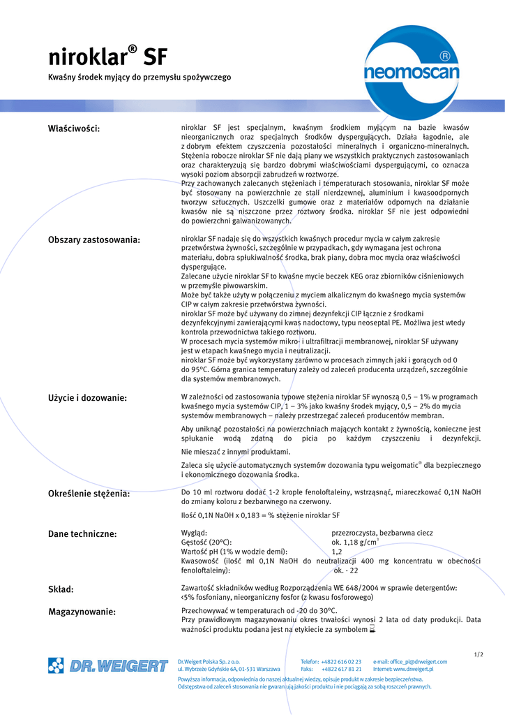 ® niroklar SF Kwaśny środek myjący do przemysłu spożywczego Właściwości: niroklar SF jest specjalnym, kwaśnym środkiem myjącym na bazie kwasów nieorganicznych oraz specjalnych środków dyspergujących. Działa łagodnie, ale z dobrym efektem czyszczenia pozostałości mineralnych i organiczno-mineralnych. Stężenia robocze niroklar SF nie dają piany we wszystkich praktycznych zastosowaniach oraz charakteryzują się bardzo dobrymi właściwościami dyspergującymi, co oznacza wysoki poziom absorpcji zabrudzeń w roztworze. Przy zachowanych zalecanych stężeniach i temperaturach stosowania, niroklar SF może być stosowany na powierzchnie ze stali nierdzewnej, aluminium i kwasoodpornych tworzyw sztucznych. Uszczelki gumowe oraz z materiałów odpornych na działanie kwasów nie są niszczone przez roztwory środka. niroklar SF nie jest odpowiedni do powierzchni galwanizowanych. Obszary zastosowania: niroklar SF nadaje się do wszystkich kwaśnych procedur mycia w całym zakresie przetwórstwa żywności, szczególnie w przypadkach, gdy wymagana jest ochrona materiału, dobra spłukiwalność środka, brak piany, dobra moc mycia oraz właściwości dyspergujące. Zalecane użycie niroklar SF to kwaśne mycie beczek KEG oraz zbiorników ciśnieniowych w przemyśle piwowarskim. Może być także użyty w połączeniu z myciem alkalicznym do kwaśnego mycia systemów CIP w całym zakresie przetwórstwa żywności. niroklar SF może być używany do zimnej dezynfekcji CIP łącznie z środkami dezynfekcyjnymi zawierającymi kwas nadoctowy, typu neoseptal PE. Możliwa jest wtedy kontrola przewodnictwa takiego roztworu. W procesach mycia systemów mikro- i ultrafiltracji membranowej, niroklar SF używany jest w etapach kwaśnego mycia i neutralizacji. niroklar SF może być wykorzystany zarówno w procesach zimnych jaki i gorących od 0 do 95°C. Górna granica temperatury zależy od zaleceń producenta urządzeń, szczególnie dla systemów membranowych. Użycie i dozowanie: W zależności od zastosowania typowe stężenia niroklar SF wynoszą 0,5 – 1% w programach kwaśnego mycia systemów CIP, 1 – 3% jako kwaśny środek myjący, 0,5 – 2% do mycia systemów membranowych – należy przestrzegać zaleceń producentów membran. Aby uniknąć pozostałości na powierzchniach mających kontakt z żywnością, konieczne jest spłukanie wodą zdatną do picia po każdym czyszczeniu i dezynfekcji. Nie mieszać z innymi produktami. ® Zaleca się użycie automatycznych systemów dozowania typu weigomatic dla bezpiecznego i ekonomicznego dozowania środka. Określenie stężenia: Do 10 ml roztworu dodać 1-2 krople fenoloftaleiny, wstrząsnąć, miareczkować 0,1N NaOH do zmiany koloru z bezbarwnego na czerwony. Ilość 0,1N NaOH x 0,183 = % stężenie niroklar SF Dane techniczne: Wygląd: przezroczysta, bezbarwna ciecz 3 Gęstość (20°C): ok. 1,18 g/cm Wartość pH (1% w wodzie demi): 1,2 Kwasowość (ilość ml 0,1N NaOH do neutralizacji 400 mg koncentratu w obecności fenoloftaleiny): ok. - 22 Skład: Zawartość składników według Rozporządzenia WE 648/2004 w sprawie detergentów: <5% fosfoniany, nieorganiczny fosfor (z kwasu fosforowego) Magazynowanie: Przechowywać w temperaturach od -20 do 30°C. Przy prawidłowym magazynowaniu okres trwałości wynosi 2 lata od daty produkcji. Data ważności produktu podana jest na etykiecie za symbolem . 1/2 Dr.Weigert Polska Sp. z o.o. ul. Wybrzeże Gdyńskie 6A, 01-531 Warszawa Telefon: +4822 616 02 23 Faks: +4822 617 81 21 e-mail: [email protected] Internet: www.drweigert.pl Powyższa informacja, odpowiednia do naszej aktualnej wiedzy, opisuje produkt w zakresie bezpieczeństwa. Odstępstwa od zaleceń stosowania nie gwarantują jakości produktu i nie pociągają za sobą roszczeń prawnych. ® niroklar SF Kwaśny środek myjący do przemysłu spożywczego Rodzaje zagrożeń i zasady prawidłowego postępowania: Klasyfikacja i oznakowanie koncentratu według Dyrektywy 1999/45/WE odnoszącej się do preparatów niebezpiecznych: Oznaczenie zagrożenia: C – produkt żrący. Zawiera: kwas fosforowy 5 – 20%, kwas azotowy 5 – 20%. Rodzaje zagroż zagroż eń: R 34 Powoduje oparzenia. Prawidł Prawidłowe postę postępowanie z mieszaniną mieszaniną niebezpieczną niebezpieczną: S 26 Zanieczyszczone oczy przemyć natychmiast dużą ilością wody i zasięgnąć porady lekarza. S 27/28 W przypadku zanieczyszczenia skóry natychmiast zdjąć całą zanieczyszczoną odzież i przemyć zanieczyszczoną skórę dużą ilością wody. S 36/37/39 Nosić odpowiednią odzież ochronną, odpowiednie rękawice ochronne i okulary lub ochronę twarzy. S 45 W przypadku awarii lub jeżeli źle się poczujesz, niezwłocznie zasięgnij porady lekarza – jeżeli to możliwe, pokaż etykietę. Jeżeli produkt używany jest zgodnie z zaleceniami, nie stanowi zagrożenia w rozumieniu dyrektywy dot. przetwórstwa spożywczego. Informacje dotyczące bezpieczeństwa i ochrony środowiska znajdują się w karcie charakterystyki dostępnej na stronie www.drweigert.pl PL 2.0 / 08.2014 2/2 Dr.Weigert Polska Sp. z o.o. ul. Wybrzeże Gdyńskie 6A, 01-531 Warszawa Telefon: +4822 616 02 23 Faks: +4822 617 81 21 e-mail: [email protected] Internet: www.drweigert.pl Powyższa informacja, odpowiednia do naszej aktualnej wiedzy, opisuje produkt w zakresie bezpieczeństwa. Odstępstwa od zaleceń stosowania nie gwarantują jakości produktu i nie pociągają za sobą roszczeń prawnych.