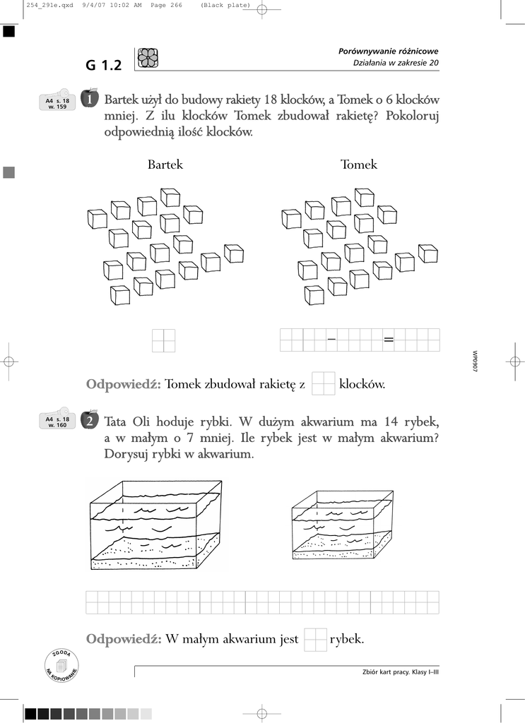254_291e.qxd 9/4/07 10:02 AM Page 266 (Black plate) Porównywanie ró˝nicowe Dzia∏ania w zakresie 20 G 1.2 1 Bartek u˝y∏ do budowy rakiety 18 klocków, a Tomek o 6 klocków mniej. Z ilu klocków Tomek zbudowa∏ rakiet´? Pokoloruj odpowiednià iloÊç klocków. A4 s. 18 w. 159 Bartek Tomek – = WP0907 Odpowiedê: Tomek zbudowa∏ rakiet´ z 2 Tata Oli hoduje rybki. W du˝ym akwarium ma 14 rybek, a w ma∏ym o 7 mniej. Ile rybek jest w ma∏ym akwarium? Dorysuj rybki w akwarium. A4 s. 18 w. 160 Odpowiedê: W ma∏ym akwarium jest rybek. NA KO E G ODA NI Z klocków. PIO WA Zbiór kart pracy. Klasy I–III 254_291e.qxd 9/4/07 10:02 AM Page 267 (Black plate) Porównywanie ró˝nicowe Dzia∏ania w zakresie 50 G 1.3 1 Po∏ó˝ przed sobà 4 kredki, a przed kole˝ankà/kolegà 6. Odpowiedz: – Kto ma wi´cej kredek, a kto ma mniej? – O ile kredek wi´cej ma kole˝anka/kolega? 2 Pawe∏ i Karolina kolekcjonujà komiksy. Policz: A4 s. 18 w. 161 WP0907 – Ile komiksów ma Karolina, a ile Pawe∏? – Które z dzieci ma wi´cej komiksów i o ile? 3 Policz zbiory wiewiórek i odpowiedz: A4 s. 18 w. 162 – Która wiewiórka zgromadzi∏a najwi´cej zapasów, a która najmniej? – O ile wi´cej orzechów ma Ruda od Kitki? – Ile orzechów powinna jeszcze uzbieraç Âmieszka, aby mia∏a tyle samo, co Ruda? – O co mo˝na jeszcze zapytaç? Kitka KO ODA E ZG NA Zbiór kart pracy. Klasy I–III Ruda NI Âmieszka PIO WA
