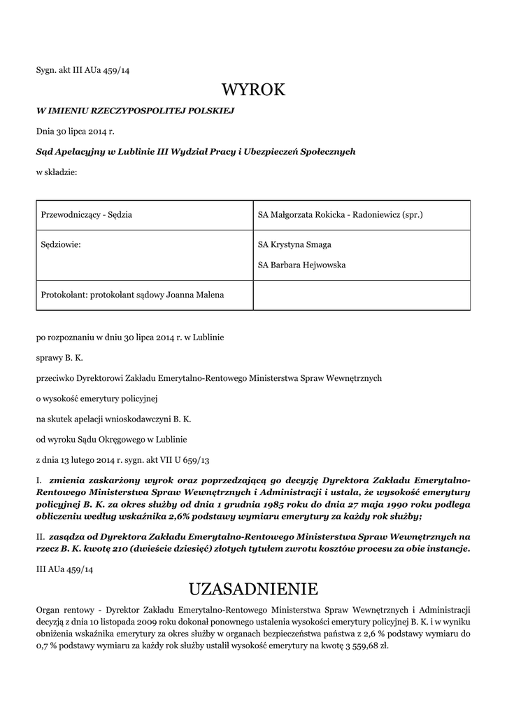 Sygn. akt III AUa 459/14 WYROK W IMIENIU RZECZYPOSPOLITEJ POLSKIEJ Dnia 30 lipca 2014 r. Sąd Apelacyjny w Lublinie III Wydział Pracy i Ubezpieczeń Społecznych w składzie: Przewodniczący - Sędzia SA Małgorzata Rokicka - Radoniewicz (spr.) Sędziowie: SA Krystyna Smaga SA Barbara Hejwowska Protokolant: protokolant sądowy Joanna Malena po rozpoznaniu w dniu 30 lipca 2014 r. w Lublinie sprawy B. K. przeciwko Dyrektorowi Zakładu Emerytalno-Rentowego Ministerstwa Spraw Wewnętrznych o wysokość emerytury policyjnej na skutek apelacji wnioskodawczyni B. K. od wyroku Sądu Okręgowego w Lublinie z dnia 13 lutego 2014 r. sygn. akt VII U 659/13 I. zmienia zaskarżony wyrok oraz poprzedzającą go decyzję Dyrektora Zakładu EmerytalnoRentowego Ministerstwa Spraw Wewnętrznych i Administracji i ustala, że wysokość emerytury policyjnej B. K. za okres służby od dnia 1 grudnia 1985 roku do dnia 27 maja 1990 roku podlega obliczeniu według wskaźnika 2,6% podstawy wymiaru emerytury za każdy rok służby; II. zasądza od Dyrektora Zakładu Emerytalno-Rentowego Ministerstwa Spraw Wewnętrznych na rzecz B. K. kwotę 210 (dwieście dziesięć) złotych tytułem zwrotu kosztów procesu za obie instancje. III AUa 459/14 UZASADNIENIE Organ rentowy - Dyrektor Zakładu Emerytalno-Rentowego Ministerstwa Spraw Wewnętrznych i Administracji decyzją z dnia 10 listopada 2009 roku dokonał ponownego ustalenia wysokości emerytury policyjnej B. K. i w wyniku obniżenia wskaźnika emerytury za okres służby w organach bezpieczeństwa państwa z 2,6 % podstawy wymiaru do 0,7 % podstawy wymiaru za każdy rok służby ustalił wysokość emerytury na kwotę 3 559,68 zł. Od tej decyzji odwołanie do Sądu Okręgowego w Lublinie wniosła B. K., domagając się jej zmiany w części odnoszącej się do ponownego ustalenia wysokości świadczenia przez przyznanie nieobniżonej emerytury policyjnej, naliczonej w wysokości 40% podstawy jej wymiaru za 15 lat służby i 2,6% podstawy wymiaru za każdy dalszy rok służby, z uwzględnieniem okresów składkowych i nieskładkowych oraz przysługujących podwyższeń i dodatków, zasiłków i świadczeń pieniężnych. Sąd Okręgowy w Lublinie wyrokiem z dnia 13 lutego 2014 roku oddalił odwołanie oraz zasądził od B. K. na rzecz organu rentowego kwotę 60 złotych tytułem zwrotu kosztów zastępstwa procesowego. Sąd Okręgowy ustalił, że B. K. jest uprawniona do emerytury policyjnej od 5 maja 2009 roku na podstawie decyzji z dnia 2 października 2012 roku. Wysokość emerytury została ustalona na kwotę 4 060,47 zł. Pismem z dnia 3 września 2009 roku Instytut Pamięci Narodowej przesłał do organu rentowego informację o przebiegu służby nr (...), z której wynikało, że wnioskodawczyni w okresie od 1 grudnia 1985 roku do 27 maja 1990 roku pełniła służbę w organach bezpieczeństwa państwa, o których mowa w art. 2 ustawy z dnia 18 października 2006 roku o ujawnianiu informacji o dokumentach organów bezpieczeństwa państwa z lat 1944-1990 oraz treści tych dokumentów (Dz.U. z 2007 roku, Nr 63, poz. 425 ze zm.). W uwagach wskazano, że była funkcjonariuszką Wydziału (...), zajmowała się prowadzeniem sekretariatu zastępcy szefa WUSW d/s SB, następnie prowadziła sekretariat zastępcy szefa WUSW d/s MO. Na podstawie tego dokumentu organ rentowy zaskarżoną decyzją dokonał ponownego ustalenia wysokości emerytury policyjnej wnioskodawczyni polegającego na obniżeniu wskaźnika emerytury za okres służby w organach bezpieczeństwa państwa z 2,6 % podstawy wymiaru do 0,7 % podstawy wymiaru za każdy rok służby. Na podstawie rozkazu z dnia 2.12.1985r., z dniem 1.12.1985r. B. K. przyjęta została do służby w MO i mianowana funkcjonariuszem w okresie służby przygotowawczej, na stanowisko sekretarz-maszynistka Sekcji Ogólnej Wydziału (...) w Wojewódzkim Urzędzie Spraw Wewnętrznych w B.. Wnioskodawczyni powierzono obsługę sekretariatu Zastępcy Szefa WUSW d/s Służby Bezpieczeństwa. Prowadziła dokumentację obowiązującą w sekretariacie, zlecano jej sporządzanie do maszynopisania dokumentów. Następnie w toku służby awansowała na na starszego szeregowca MO, a po złóżeniu w kwietniu 1988 roku egzaminu podoficerskiego na kaprala MO. Na podstawie rozkazu z dnia 16.06.1988r. została delegowana służbowo do NRD w okresie od 05.07.1988r. do 21.07.1988r. był to wyjazd w czasie wakacji. Wnioskodawczyni wyjechała do NRD jako tłumacz, wychowawca młodzieży na obóz młodzieżowy połączony z pracą fizyczną i zarobkiem. Było to tzw. OHP. Wyjazd był organizowany przez Komendę Milicji, uczestniczyły w nim dzieci funkcjonariuszy. W karcie przebiegu przedsięwzięć adaptacyjno-wdrożeniowych wobec kaprala B. K. z dnia 29.11.1988r., stanowiącej podsumowanie okresu służby przygotowawczej wpisano, że B. K. – sekretarz-maszynistka Wydziału (...) przyjęta została do służby w SB-MO w dniu 01.12.1985r., złożyła ślubowanie w dniu 07.10.1986r., zapoznano ją z ustawą o służbie funkcjonariuszy SB i MO i zasadami etyki i obyczajów funkcjonariuszy SB i MO 01.12.1985r. Rozkazem personalnym z dnia 25.07.1990r. Szef WUSW w B. na podstawie art. 131 ust.1 ustawy o Urzędzie Ochrony Bezpieczeństwa zwolnił z mocy prawa z dniem 31.07.1990r. funkcjonariuszy Służby Bezpieczeństwa, w tym starszego kaprala B. K. – sekretarza maszynistkę Wydziału (...). (rozkaz personalny nr (...)) W dniu lipcu 1990r. wnioskodawczyni złożyła wniosek o przyjęcie do służby w Policji byłego funkcjonariusza Służby Bezpieczeństwa. We wniosku osobiście podała, że ostatnio zajmowała stanowisko w Wydziale Ogólnym – sekretarz maszynistka w sekretariacie Zastępcy Szefa WUSW d/s SB, d/s MO. Rozkazem personalnym z dnia 30.07.1990r. Komendant Wojewódzki Policji w B. w zw. z art. 147 ust. 1 i 2 ustawy o Policji zwolnił funkcjonariuszy z zajmowanych stanowisk Milicji Obywatelskiej i mianował na stanowiska policyjne z d
