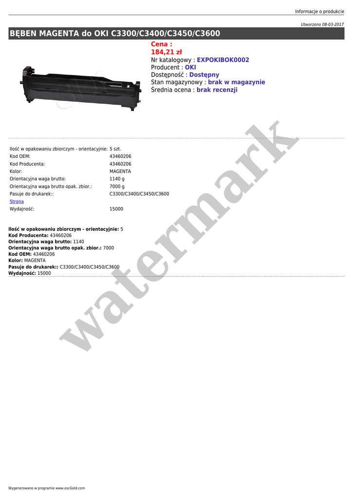 Informacje o produkcie Utworzono 08-03-2017 BĘBEN MAGENTA do OKI C3300/C3400/C3450/C3600 Cena : 184,21 zł er m ar k Nr katalogowy : EXPOKIBOK0002 Producent : OKI Dostępność : Dostępny Stan magazynowy : brak w magazynie Średnia ocena : brak recenzji Ilość w opakowaniu zbiorczym - orientacyjnie: 5 szt. Kod OEM: 43460206 Kod Producenta: 43460206 Kolor: MAGENTA Orientacyjna waga brutto: Orientacyjna waga brutto opak. zbior.: Pasuje do drukarek:: 1140 g 7000 g C3300/C3400/C3450/C3600 Strona Wydajność: 15000 w at Ilość w opakowaniu zbiorczym - orientacyjnie: 5 Kod Producenta: 43460206 Orientacyjna waga brutto: 1140 Orientacyjna waga brutto opak. zbior.: 7000 Kod OEM: 43460206 Kolor: MAGENTA Pasuje do drukarek:: C3300/C3400/C3450/C3600 Wydajność: 15000 Wygenerowano w programie www.oscGold.com
