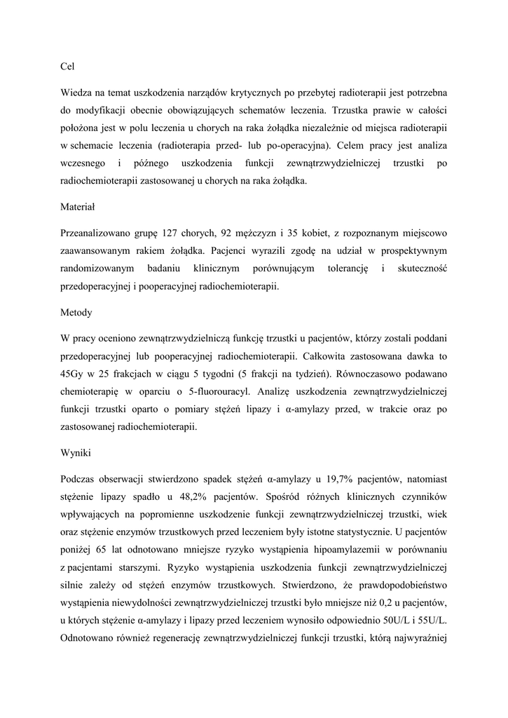 Cel Wiedza na temat uszkodzenia narządów krytycznych po przebytej radioterapii jest potrzebna do modyfikacji obecnie obowiązujących schematów leczenia. Trzustka prawie w całości położona jest w polu leczenia u chorych na raka żołądka niezależnie od miejsca radioterapii w schemacie leczenia (radioterapia przed- lub po-operacyjna). Celem pracy jest analiza wczesnego i późnego uszkodzenia funkcji zewnątrzwydzielniczej trzustki po radiochemioterapii zastosowanej u chorych na raka żołądka. Materiał Przeanalizowano grupę 127 chorych, 92 mężczyzn i 35 kobiet, z rozpoznanym miejscowo zaawansowanym rakiem żołądka. Pacjenci wyrazili zgodę na udział w prospektywnym randomizowanym badaniu klinicznym porównującym tolerancję i skuteczność przedoperacyjnej i pooperacyjnej radiochemioterapii. Metody W pracy oceniono zewnątrzwydzielniczą funkcję trzustki u pacjentów, którzy zostali poddani przedoperacyjnej lub pooperacyjnej radiochemioterapii. Całkowita zastosowana dawka to 45Gy w 25 frakcjach w ciągu 5 tygodni (5 frakcji na tydzień). Równoczasowo podawano chemioterapię w oparciu o 5-fluorouracyl. Analizę uszkodzenia zewnątrzwydzielniczej funkcji trzustki oparto o pomiary stężeń lipazy i α-amylazy przed, w trakcie oraz po zastosowanej radiochemioterapii. Wyniki Podczas obserwacji stwierdzono spadek stężeń α-amylazy u 19,7% pacjentów, natomiast stężenie lipazy spadło u 48,2% pacjentów. Spośród różnych klinicznych czynników wpływających na popromienne uszkodzenie funkcji zewnątrzwydzielniczej trzustki, wiek oraz stężenie enzymów trzustkowych przed leczeniem były istotne statystycznie. U pacjentów poniżej 65 lat odnotowano mniejsze ryzyko wystąpienia hipoamylazemii w porównaniu z pacjentami starszymi. Ryzyko wystąpienia uszkodzenia funkcji zewnątrzwydzielniczej silnie zależy od stężeń enzymów trzustkowych. Stwierdzono, że prawdopodobieństwo wystąpienia niewydolności zewnątrzwydzielniczej trzustki było mniejsze niż 0,2 u pacjentów, u których stężenie α-amylazy i lipazy przed leczeniem wynosiło odpowiednio 50U/L i 55U/L. Odnotowano również regenerację zewnątrzwydzielniczej funkcji trzustki, którą najwyraźniej obserwowano w ciągu 500 dni od leczenia. Stężenia lipazy i α-amylazy powróciły do normy odpowiednio u 39% oraz 31% chorych, przy czym powrót do normy jednego z enzymów trzustkowych, korelował z normalizacją stężenia drugiego enzymu trzustkowego. Analiza dawka/objętość wskazuje, że dawka średnia w całej objętości trzustki w badanej grupie pacjentów mieściła się w przedziale 32-48Gy, średnia 44Gy. Średnia dawka obejmująca trzustkę powinna być możliwie najniższa. W zakresie stosowanych wysokich dawek promieniowania w trzustce, nie było możliwe określenie wartości referencyjnych dla zależności dawka/objętość w planowaniu radioterapii. Wnioski Wykazano zwiększone ryzyko wystąpienia niewydolności zewnątrzwydzielniczej trzustki po radiochemioterapii u pacjentów chorych na raka żołądka. Dlatego też trzustka powinna być uwzględniona w procesie planowania radioterapii jako narząd krytyczny. Subkliniczne popromienne uszkodzenie trzustki jest procesem odwracalnym, gdyż stężenie enzymów trzustkowych powraca do normy. Za standard oceny popromiennego uszkodzenia trzustki, powinno przyjąć się stężenie lipazy w surowicy krwi.