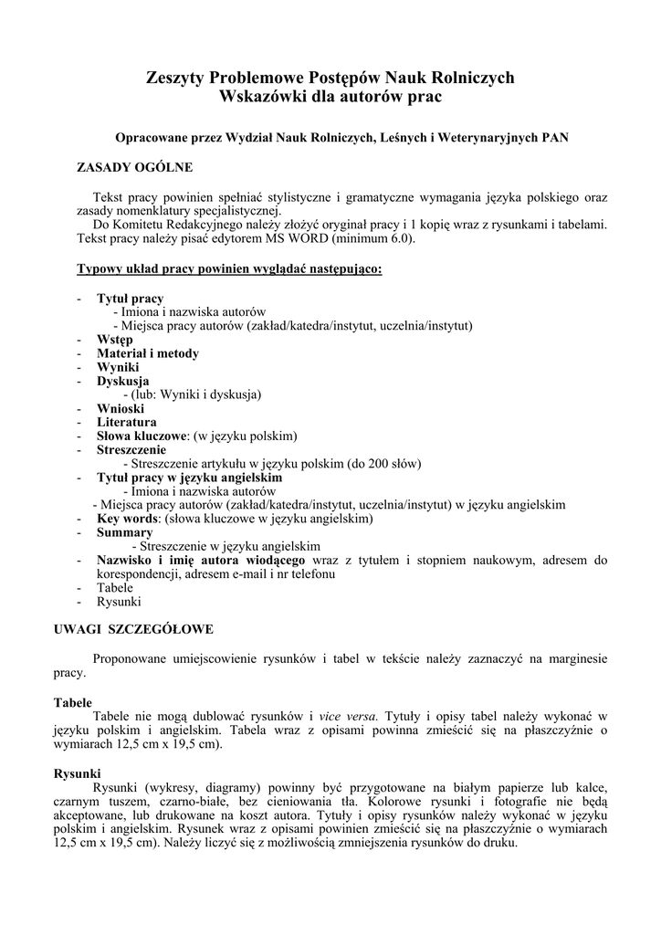 Zeszyty Problemowe Postępów Nauk Rolniczych Wskazówki dla autorów prac Opracowane przez Wydział Nauk Rolniczych, Leśnych i Weterynaryjnych PAN ZASADY OGÓLNE Tekst pracy powinien spełniać stylistyczne i gramatyczne wymagania języka polskiego oraz zasady nomenklatury specjalistycznej. Do Komitetu Redakcyjnego należy złożyć oryginał pracy i 1 kopię wraz z rysunkami i tabelami. Tekst pracy należy pisać edytorem MS WORD (minimum 6.0). Typowy układ pracy powinien wyglądać następująco: - Tytuł pracy - Imiona i nazwiska autorów - Miejsca pracy autorów (zakład/katedra/instytut, uczelnia/instytut) Wstęp Materiał i metody Wyniki Dyskusja - (lub: Wyniki i dyskusja) Wnioski Literatura Słowa kluczowe: (w języku polskim) Streszczenie - Streszczenie artykułu w języku polskim (do 200 słów) Tytuł pracy w języku angielskim - Imiona i nazwiska autorów - Miejsca pracy autorów (zakład/katedra/instytut, uczelnia/instytut) w języku angielskim Key words: (słowa kluczowe w języku angielskim) Summary - Streszczenie w języku angielskim Nazwisko i imię autora wiodącego wraz z tytułem i stopniem naukowym, adresem do korespondencji, adresem e-mail i nr telefonu Tabele Rysunki UWAGI SZCZEGÓŁOWE pracy. Proponowane umiejscowienie rysunków i tabel w tekście należy zaznaczyć na marginesie Tabele Tabele nie mogą dublować rysunków i vice versa. Tytuły i opisy tabel należy wykonać w języku polskim i angielskim. Tabela wraz z opisami powinna zmieścić się na płaszczyźnie o wymiarach 12,5 cm x 19,5 cm). Rysunki Rysunki (wykresy, diagramy) powinny być przygotowane na białym papierze lub kalce, czarnym tuszem, czarno-białe, bez cieniowania tła. Kolorowe rysunki i fotografie nie będą akceptowane, lub drukowane na koszt autora. Tytuły i opisy rysunków należy wykonać w języku polskim i angielskim. Rysunek wraz z opisami powinien zmieścić się na płaszczyźnie o wymiarach 12,5 cm x 19,5 cm). Należy liczyć się z możliwością zmniejszenia rysunków do druku. Literatura Cytowanie w tekście: przez podanie nazwiska i roku wydania publikacji (według lat), np.:[BAKEC i in. 1993], ...... podobne wyniki uzyskał Kowalski [1994], a ...... [HENDERSON 1995; NOWAK 1995; KOWALSKI, NOWICKI 1996]. W spisie literatury: wszystkie cytowane pozycje, i tylko takie, powinny być alfabetycznie wymienione. Jeżeli ten sam autor/rzy publikowali kilka prac w tym samym roku, należy to zaznaczyć: 1994a, 1994b itd. Przykłady: BUDZYŃSKI W., MAJKOWSKI K., HORODYŃSKI A., JASIŃSKA Z., MUŚLICKA B., SNARSKI A. 1985. Wpływ terminu siewu i przedsiewnej dawki azotu na zimotrwałość i plonowanie odmian rzepaku ozimego. Biuletyn IHAR 156: 113-130. BUDZYŃSKI W., OJCZYK T. (red.) 1996. Rzepak, produkcja surowca olejarskiego. Wyd. ART. Olsztyn: 159-172. DZIADOWIEC H. 1992. Ekologiczna rola próchnicy glebowej. Zesz. Probl. Post. Nauk Rol. 411: 268282. FRĄCKOWIAK J. 1983. Użytkowanie kośne, produkcja siana i suszu, w: Łąkarstwo i gospodarka łąkowa. Praca zbiorowa pod red. M. Falkowskiego: 439-454. GONET S.S., WEGNER K. 1994. The effect of mineral and organic fertilization on properties of soil humic acids, in: Humic Substances in the Global Environment and Implications on Human Health. Senesi N., Miano T. (red.). Elsevier, Amsterdam: 607-612. HENDERSON P. 1982. Inorganic geochemistry. Pergamon Press, New York: 280 ss. KABATA-PENDIAS A., PENDIAS H. 1999. Biogeochemia pierwiastków śladowych. Wydawn. Nauk. PWN, Warszawa: 398 ss. KOSTUCH R., GÓRA E., PAJDZIK J. 1998. Impact of mineral and organics fertilization treatments on floristic diversity of a meadov sward. Proc. 17th Gen. Meet EGF „Ecological aspects of grassland management”, Debrecen, Hungary, 18-21 V 1998: 773-776. NOWAK J. 1992. Zastosowanie regulatorów wzrostu w pędzeniu roślin cebulowych uprawianych w doniczkach. Mat. konf. nauk. „Pędzenie ozdobnych roślin cebulowych”. Poznań, 4 II 1992: 9. (9 – oznacza, że tekst jest na str. 9 i jest jednostronicowy) OLSZTA W. 1975. Wpływ przesuszenia na zmiany fizycznych i wodnych właściwości hydrogenicznych utworów węglanowych. Rocz. Nauk Rol., Ser. F 79(1): 57-70. SAWICKI B. 1993a. Zmienność i korelacja niektórych cech ekotypów populacji Poa pretensis L. Acta Agrobotanica 46(2): 77-85. SAWICKI B. 1993b. Ocena niektórych cech rolniczych i biologicznych ekotypów kostrzewy trzcinowej (Festuca aradinacea SCHREB.) z południowo-wschodniej Polski. Biul. IHAR 188: 123-129. SZAJDA J. 1997. Roślinne i glebowo-wodne wskaźniki ewapotranspiracji łąki na glebie torfowomurszowej. IMUZ Falenty. Rozprawa habilitacyjna: 61 ss. INFORMACJE DODATKOWE Prace rażąco odbiegające od wymogów Redakcji będą odsyłane do autorów bez recenzji. Praca odesłana będzie mogła być przyjęta ponownie po wniesieniu koniecznych poprawek. Prace spełniające warunki wstępne, będą przesyłane do recenzentów. Na podstawie recenzji, Komitet Redakcyjny podejmuje decyzję o przesłaniu autorowi pracy w celu dokonania niezbędnych poprawek i uzupełnień. Po wykonaniu korekty, autorzy przesyłają do Redakcji: ostateczną wersję pracy (oryginalny wydruk i 1 kopię) przygotowaną według instrukcji, dyskietkę (3.5”, MS WORD minimum 6.0) oraz szczegółowe ustosunkowanie się do recenzji. Dla ułatwienia kontaktów należy podać telefon (praca, dom). Decyzję o przyjęciu pracy do druku podejmuje Komitet Redakcyjny w porozumieniu z przedstawicielem Rady Redakcyjnej ZPPNR, który promuje cały zeszyt. Ostateczną zgodę na druk wydaje Wydział Nauk Rolniczych, Leśnych i Weterynaryjnych PAN. Warszawa 2002 r.